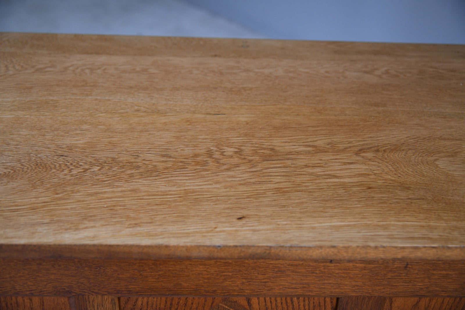 Ecclesiastical Oak Counter. 20th Centgury solid oak freestanding counter with arched panel front, open sides and back.