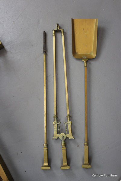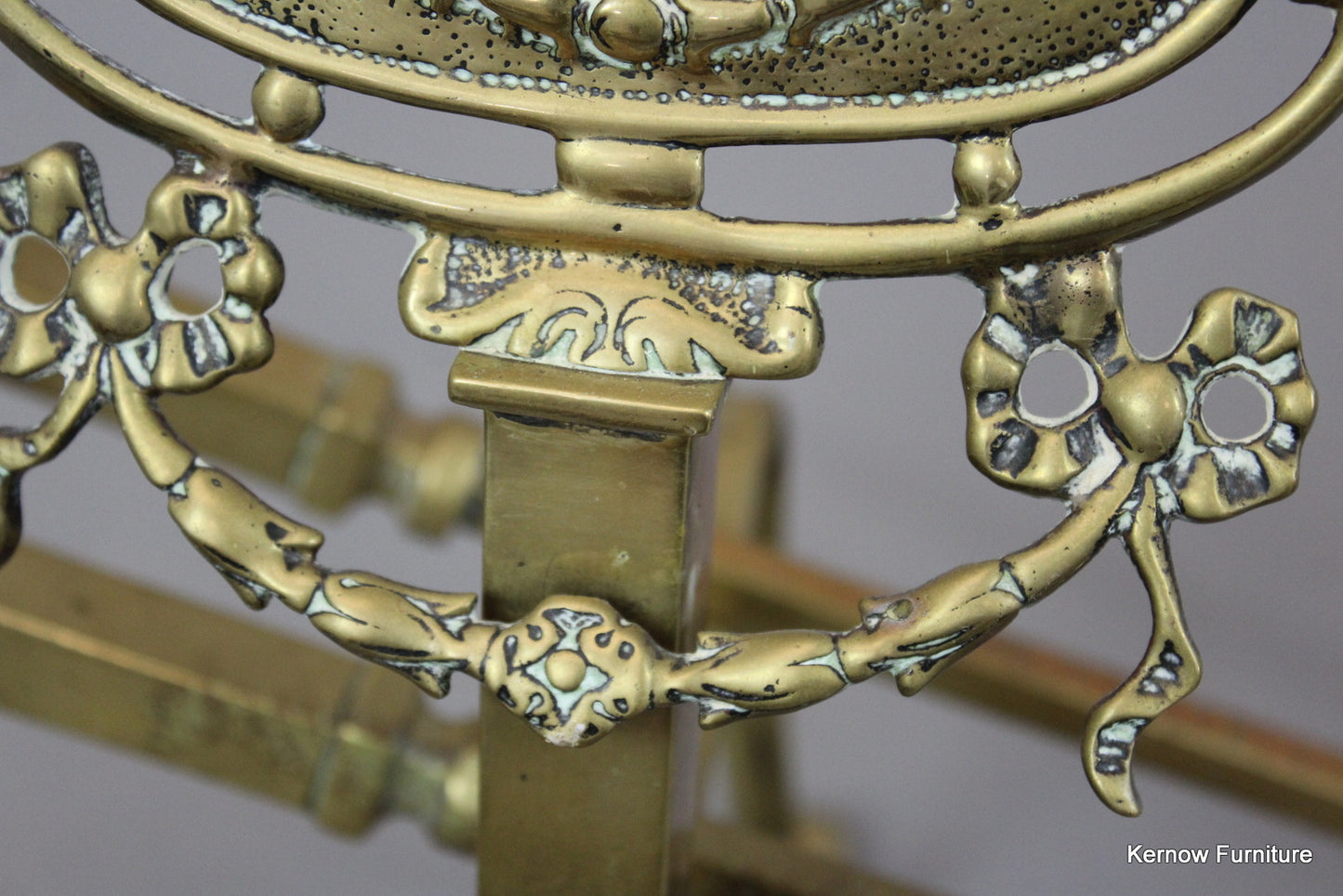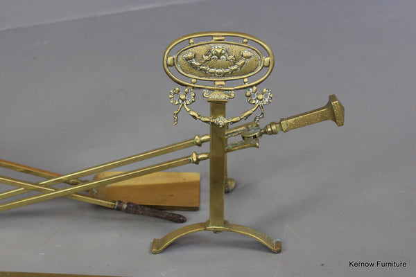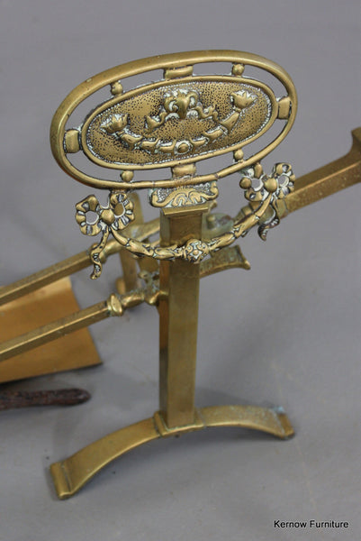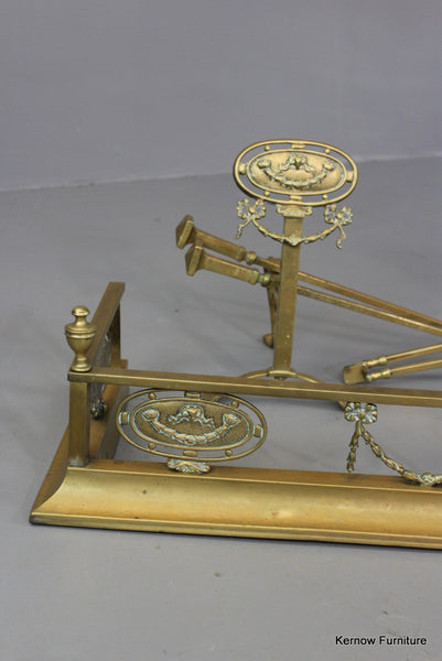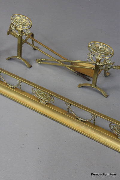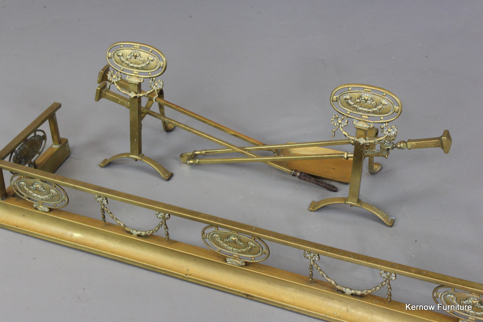Edwardian brass fire set. Includes fire fender, pair of ornate fire dogs and companion set.