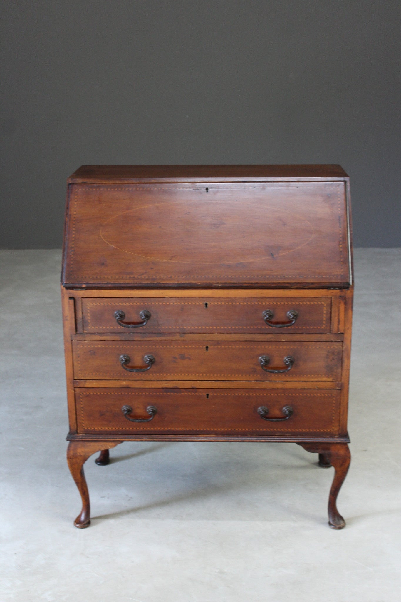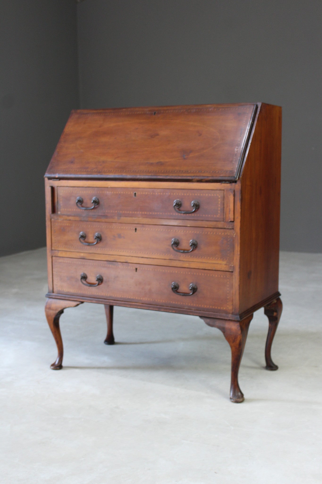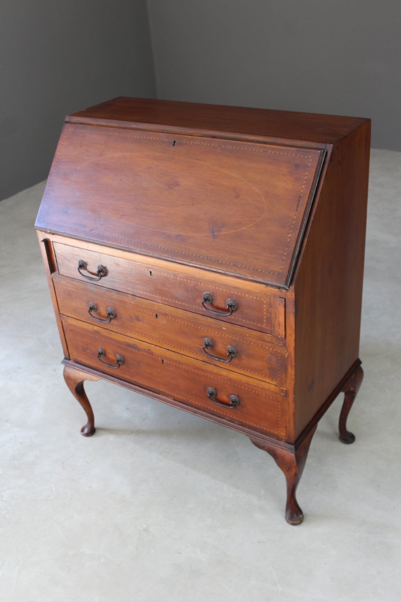 Edwardian mahogany writing bureau. Vintage mahogany writing bureau, fall front with fitted interior over 3 long drawers on cabriole legs.
