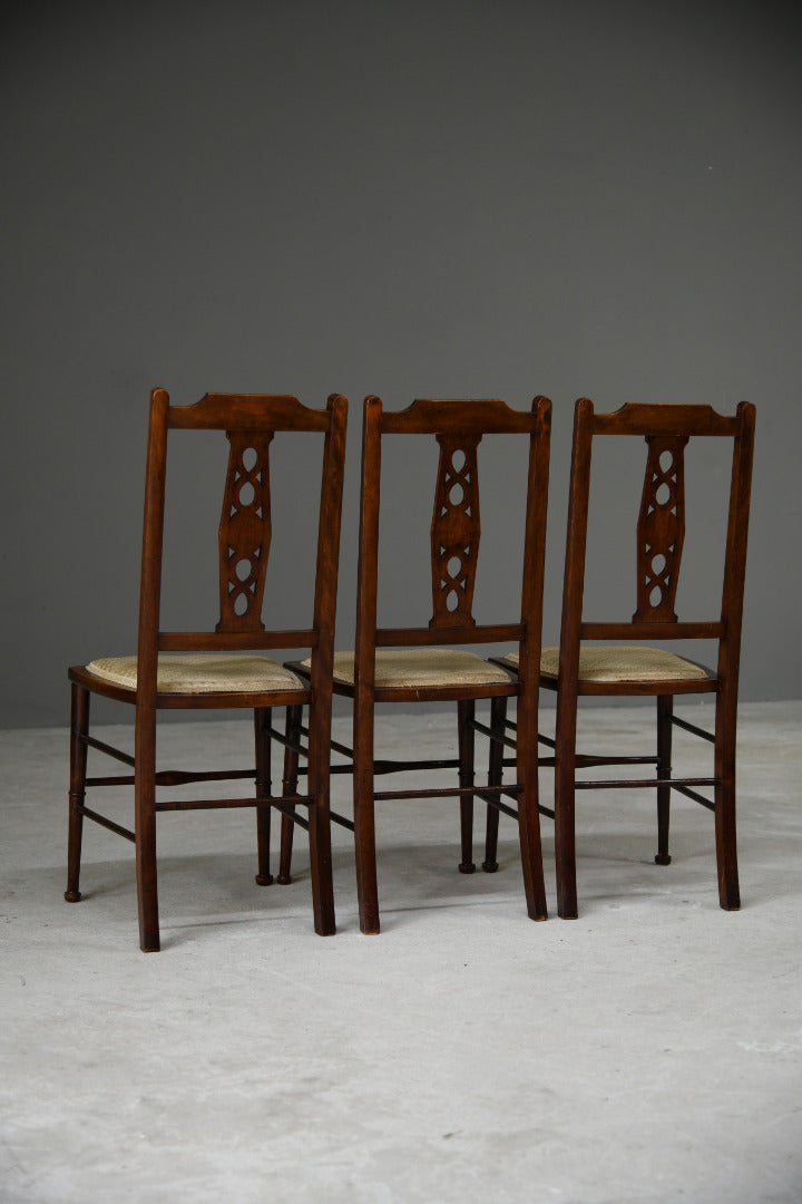 Edwardian Occasional Chairs. Three Edwardian occasional chairs, walnut frame with pierced back splat, webbed and upholstered seat on turned legs and small round feet.