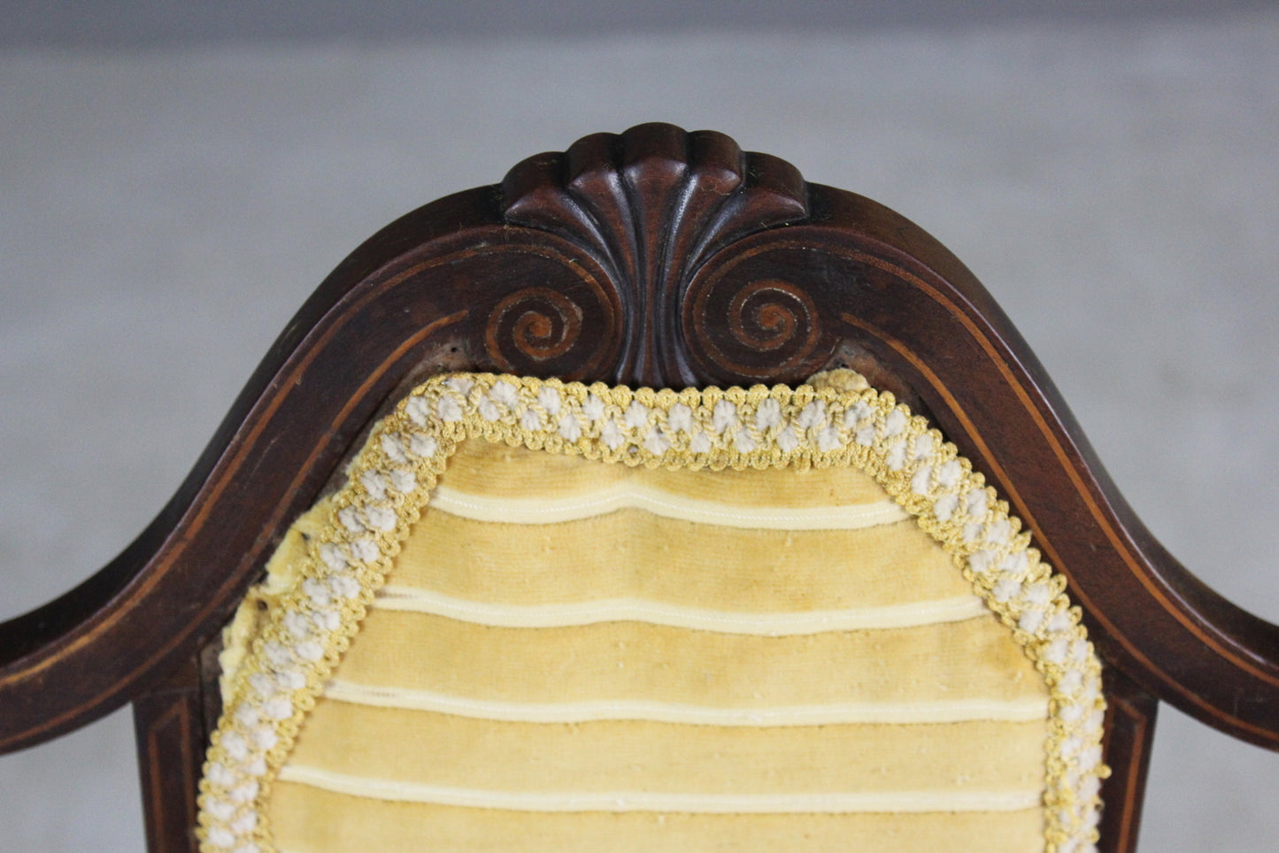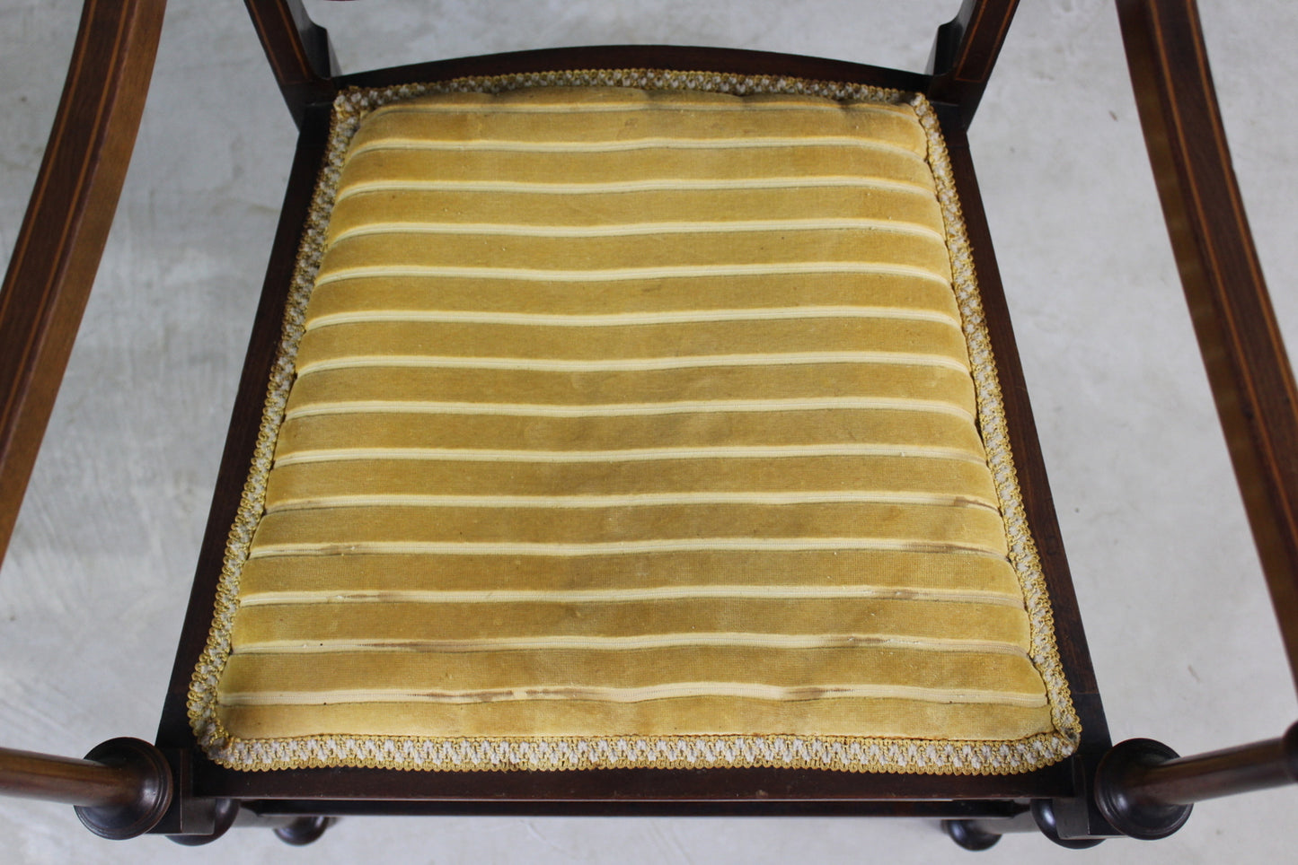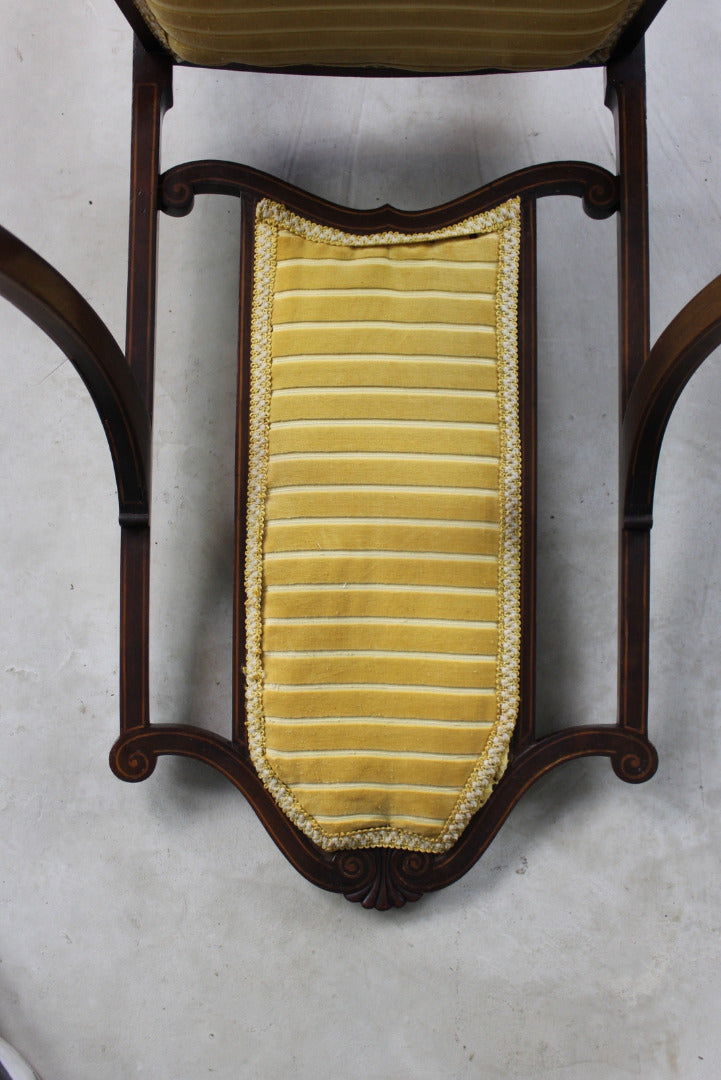 Edwardian open arm chair. Antique mahogany open arm chair with inlaid box wood stringing, webbed seat, turned legs, yellow uphosltery to the seat and back.
