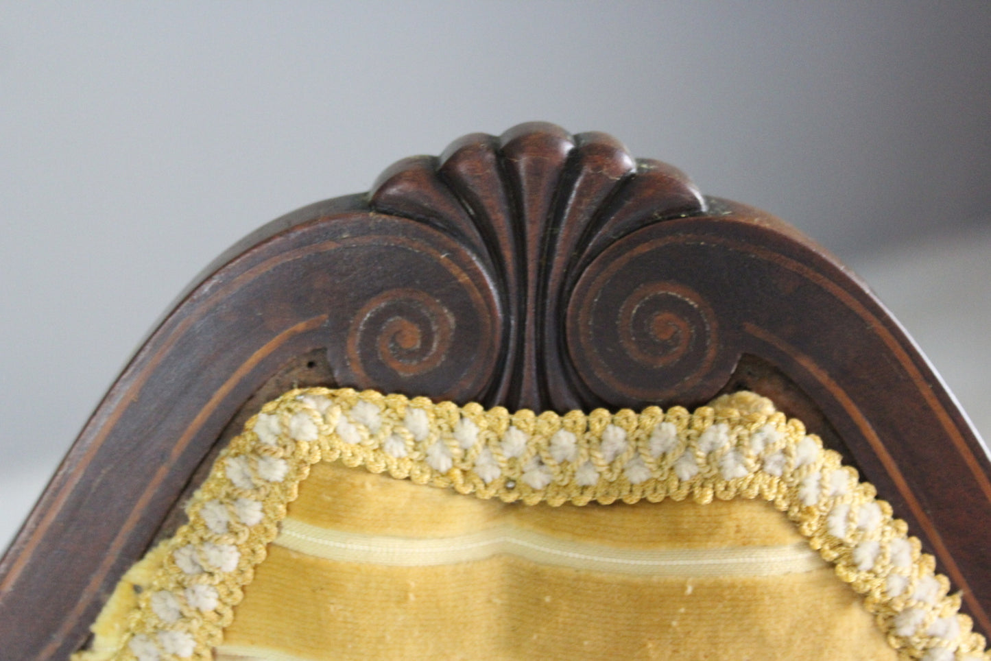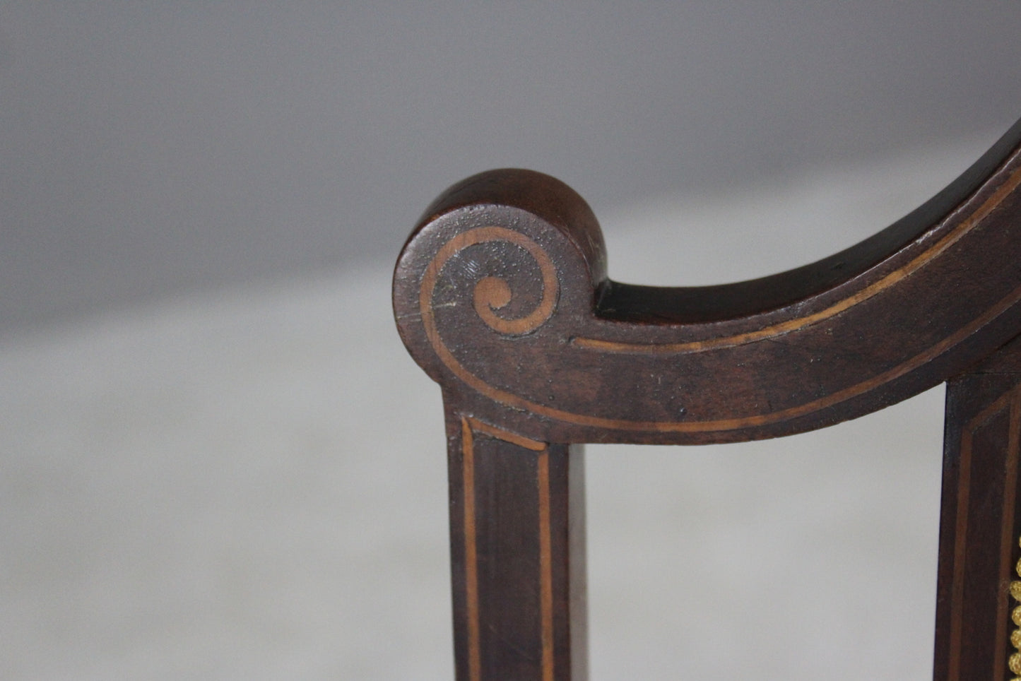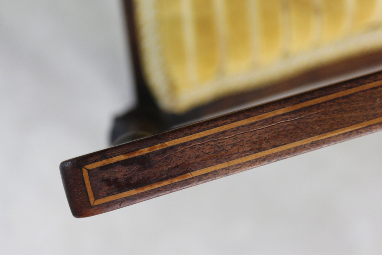 Edwardian open arm chair. Antique mahogany open arm chair with inlaid box wood stringing, webbed seat, turned legs, yellow uphosltery to the seat and back.