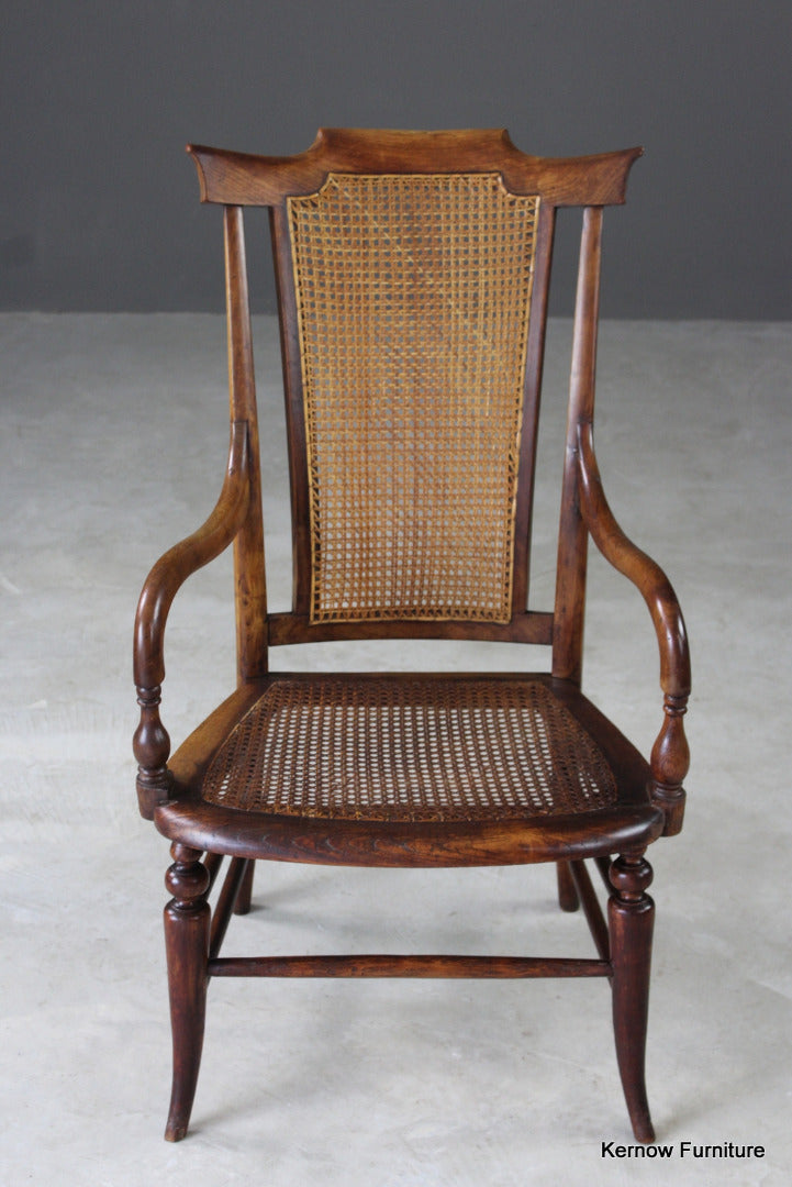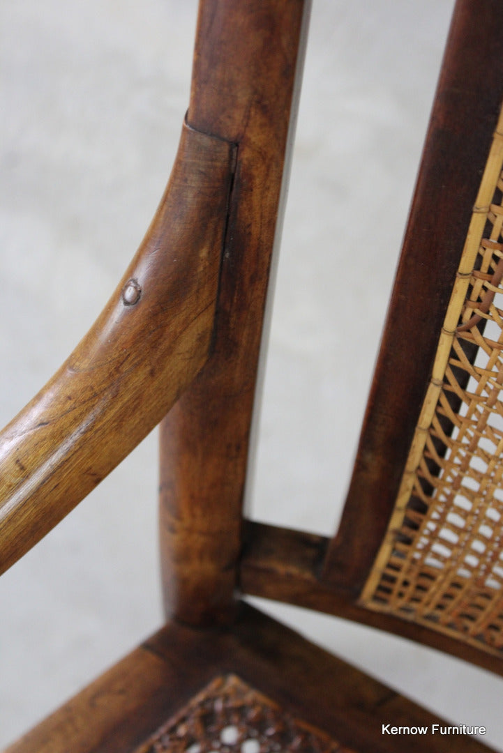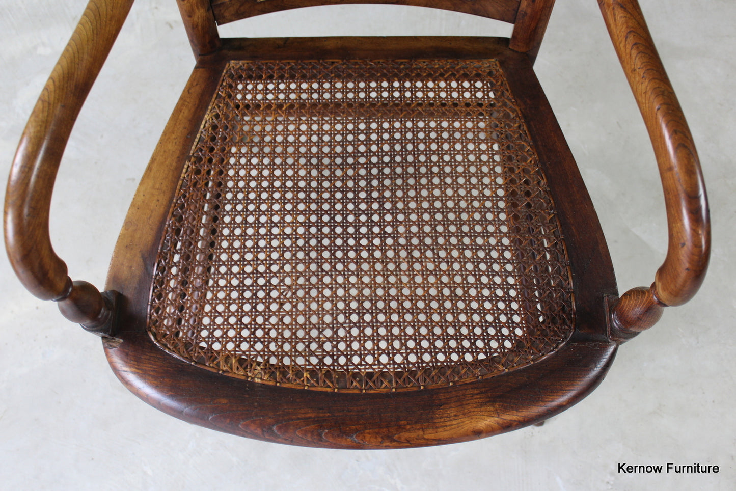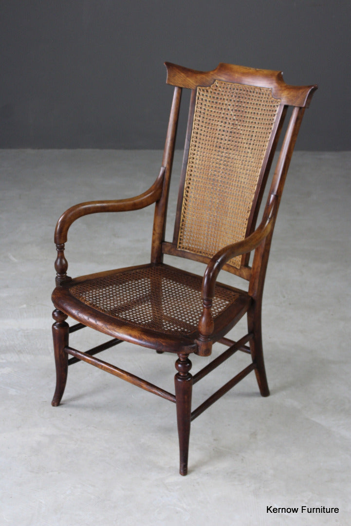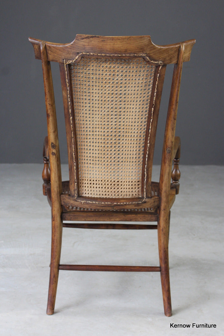 Elm & Beech carver chair. Rustic country style elm and beech frame open arm carver chair with caned seat and back on turned legs.