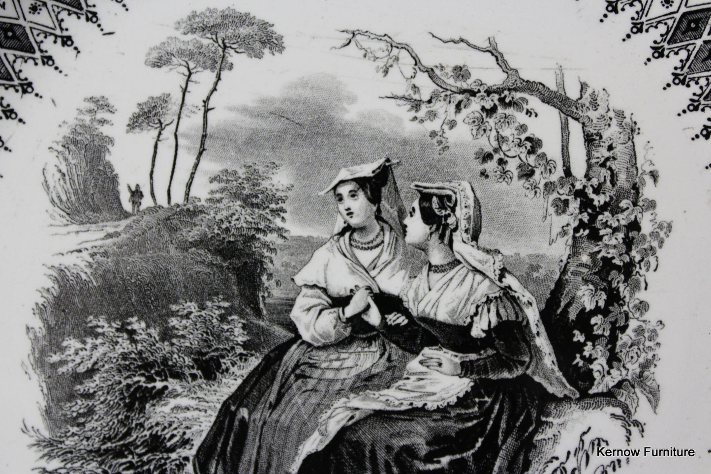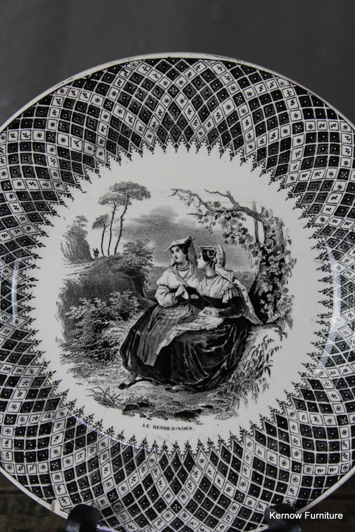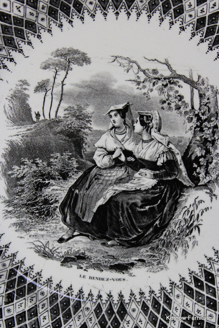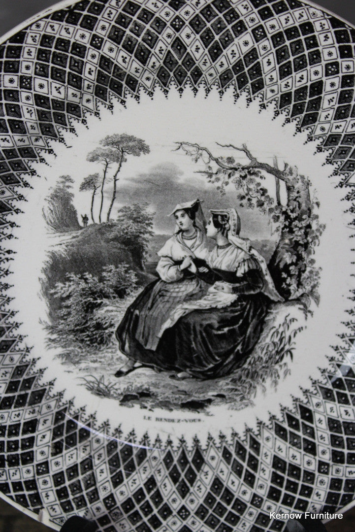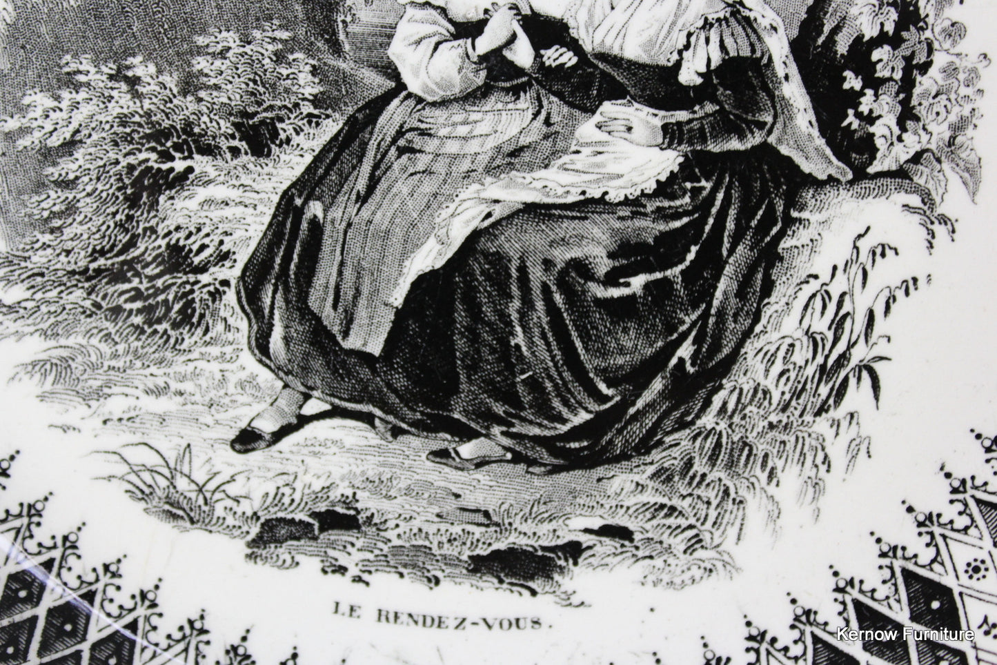 French transferware plate. Antique French decorative plate, Le Rendez-vous, marked medaille d'or 1844 sarreguemines to the rear.