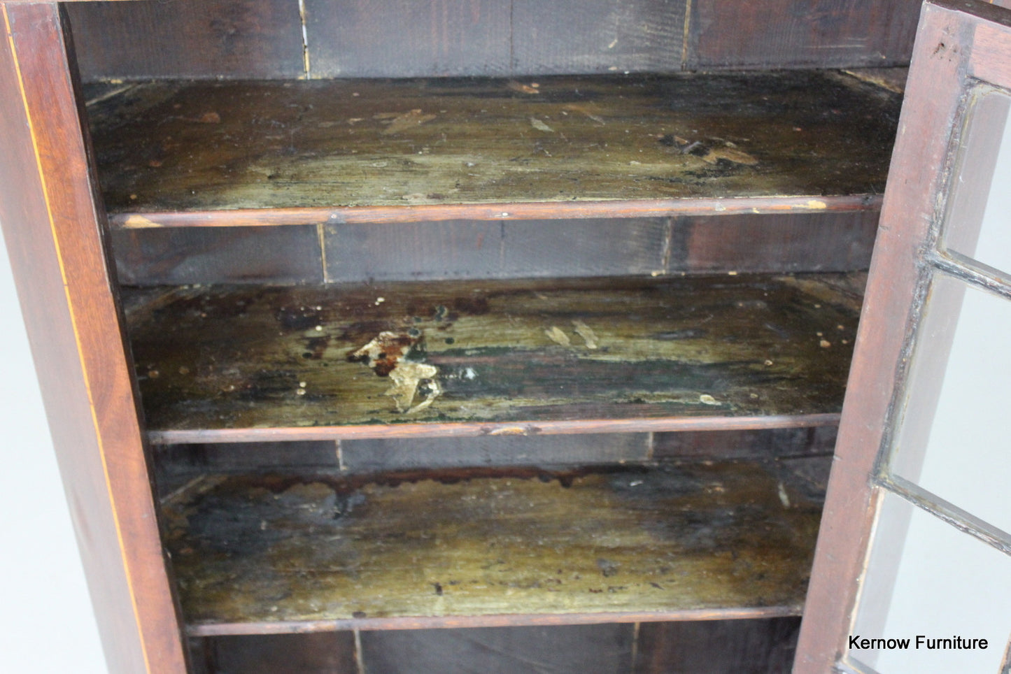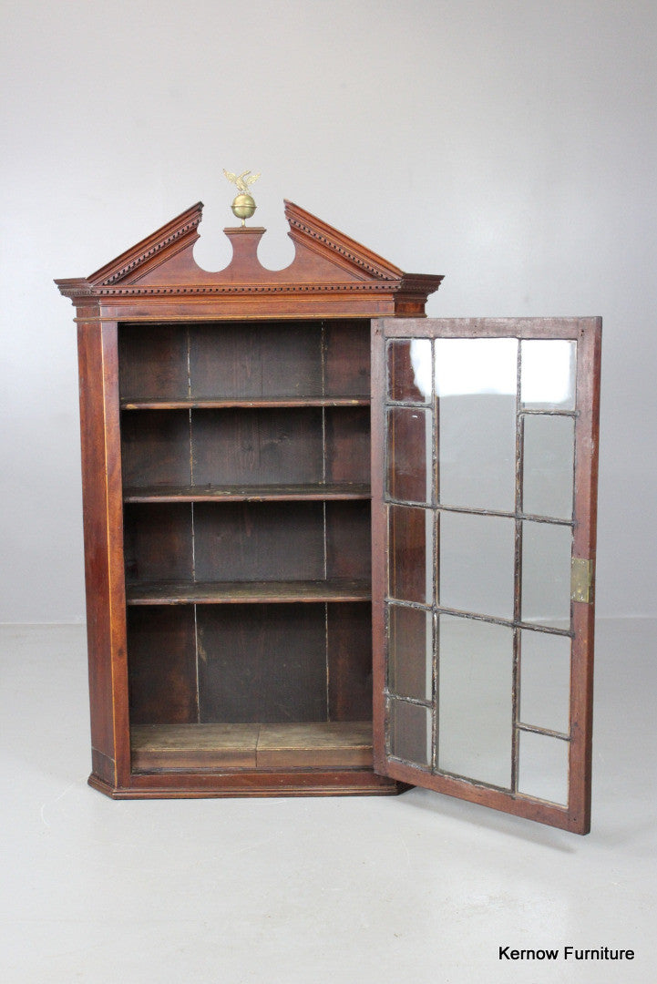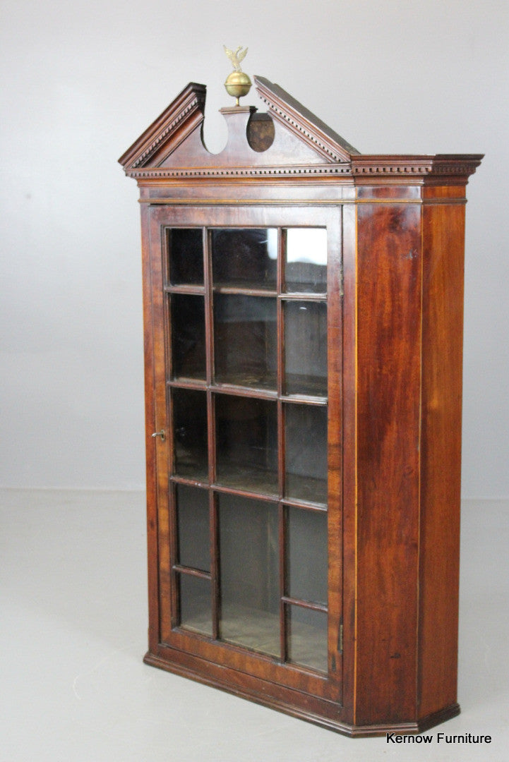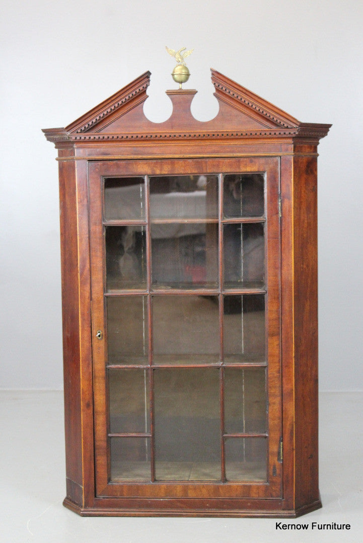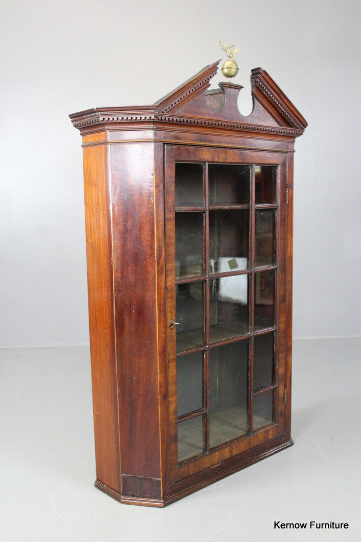 Antique George III inlaid mahogany hanging wall cupboard with fixed internal shevles, glazed door, moulded cornice & brass eagle finial.