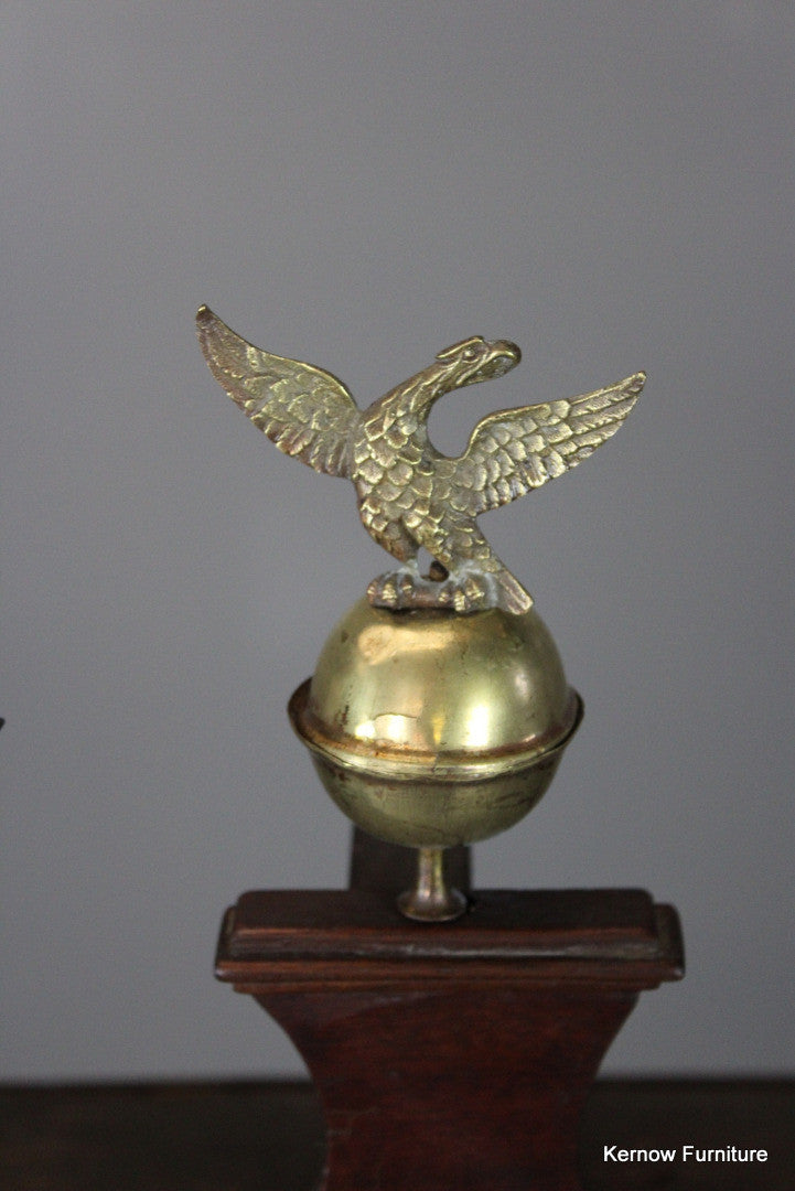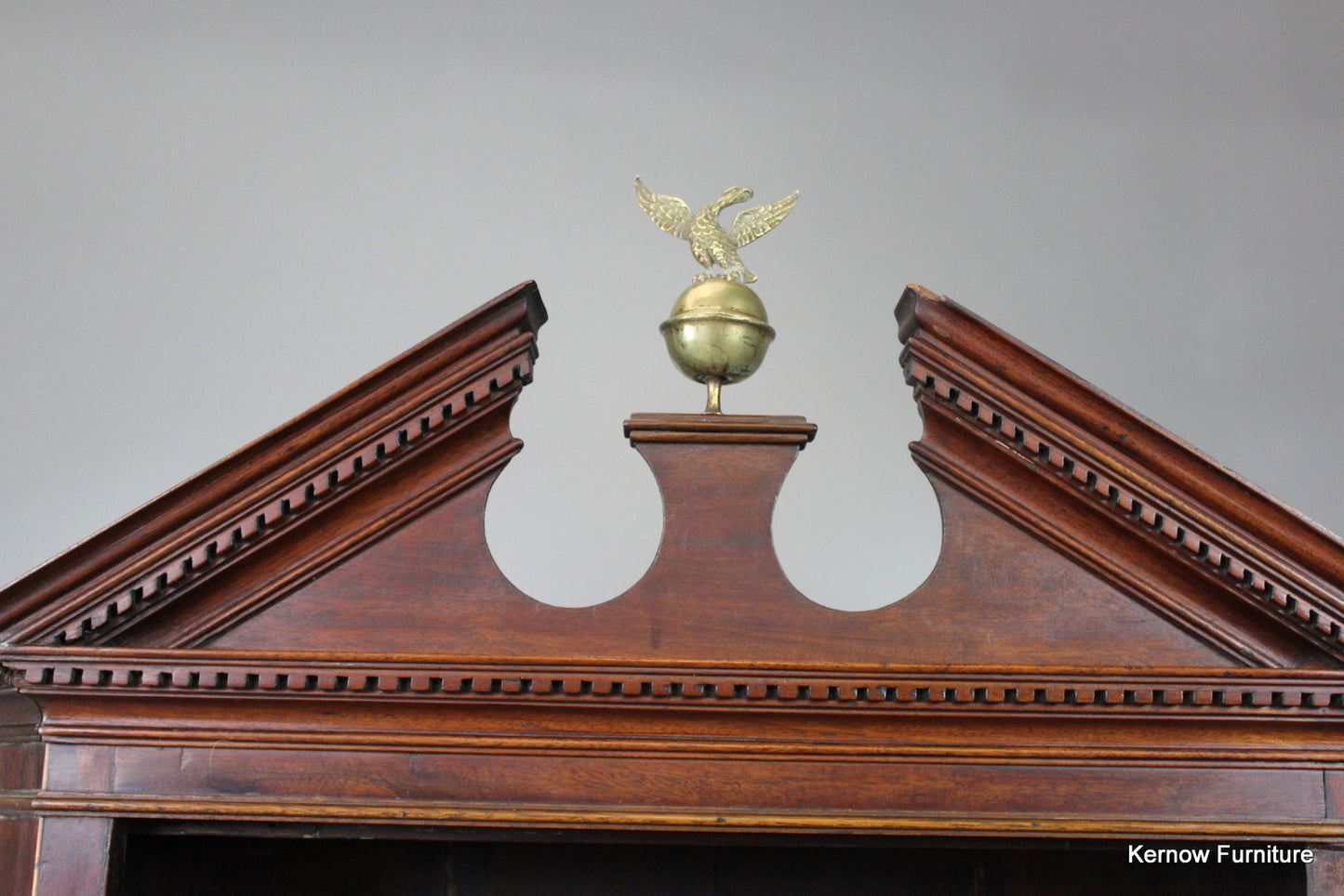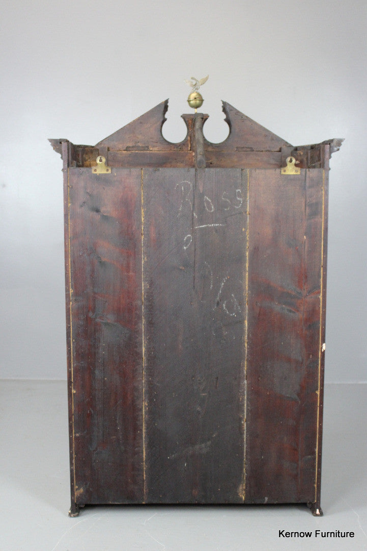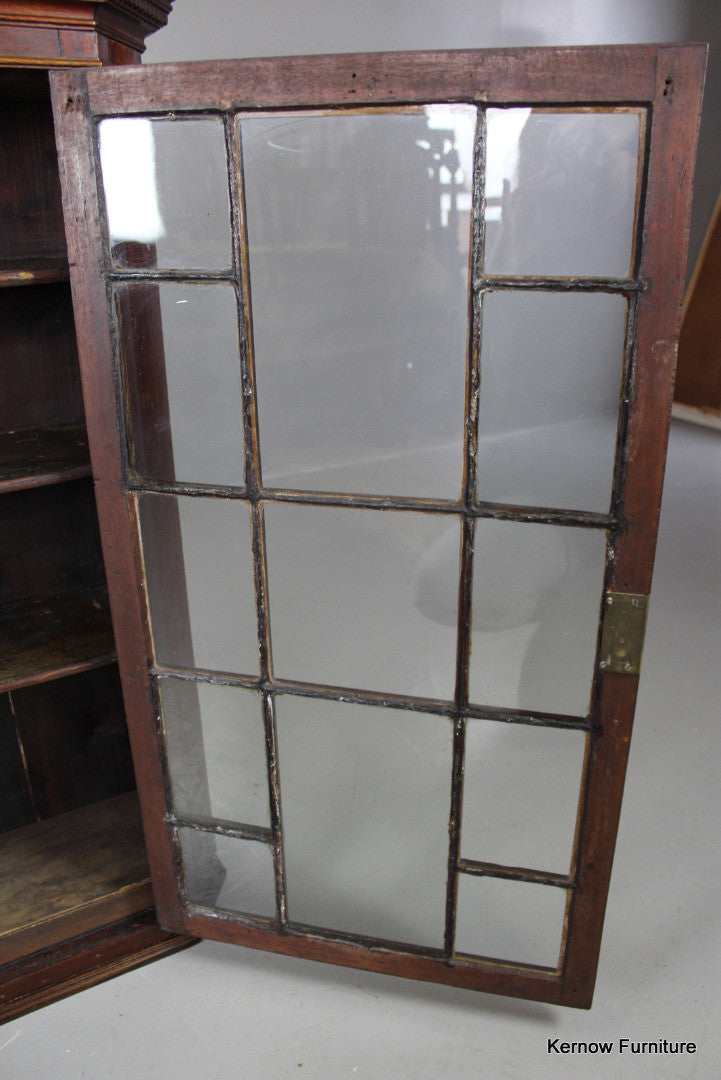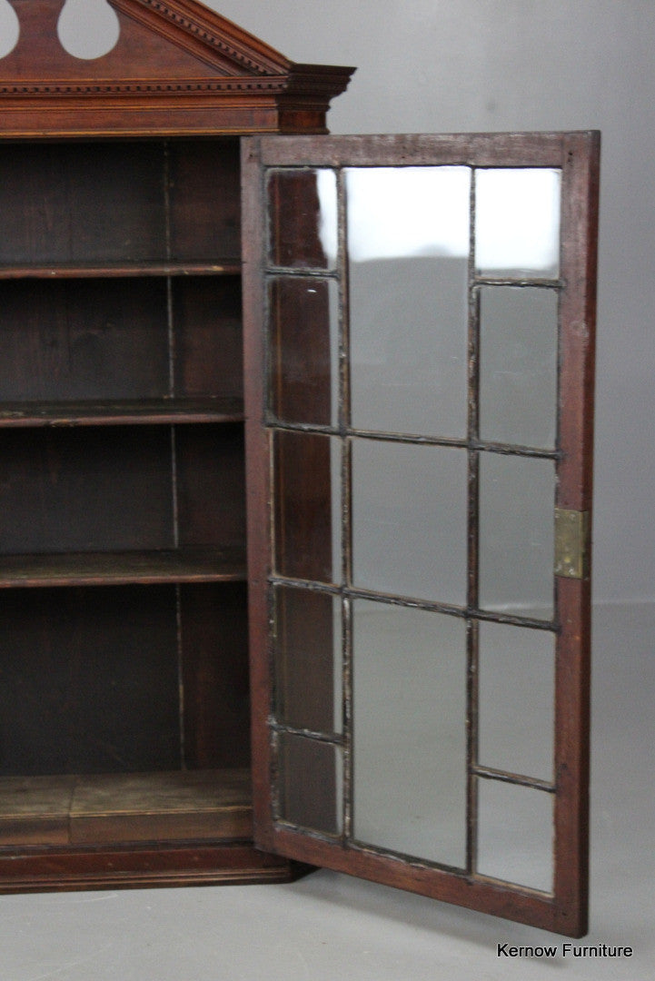 Antique George III inlaid mahogany hanging wall cupboard with fixed internal shevles, glazed door, moulded cornice & brass eagle finial.