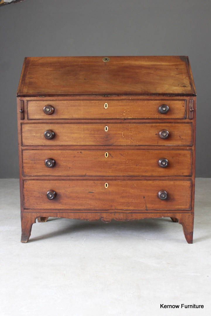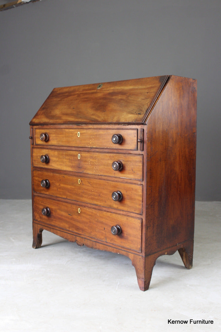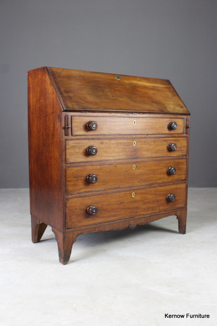 Georgian mahogany bureau. Antique George III mahogany writing bureau, fall front with fitted interior and blue leather skiver, 4 long graduated drawers with turned handles on bracket feet.