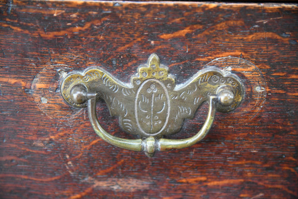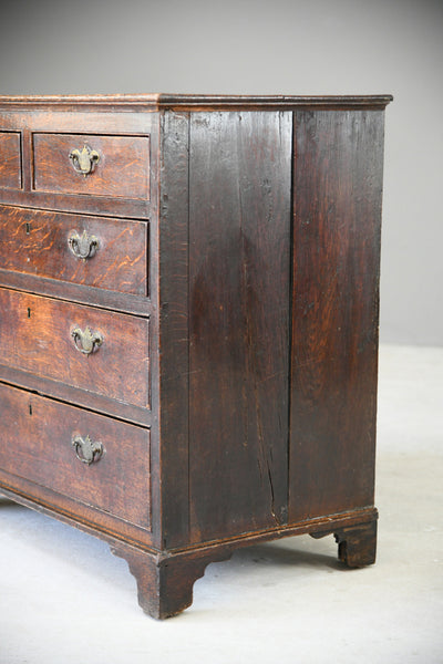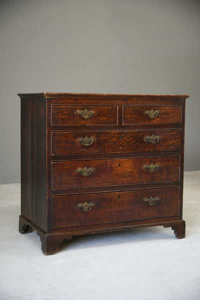 Georgian Oak Chest of Drawers. Antique English oak chest of drawers, planked top with moulded edge over two short & three long drawers on bracket feet with brass handles.