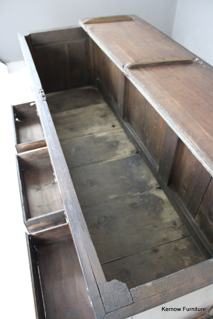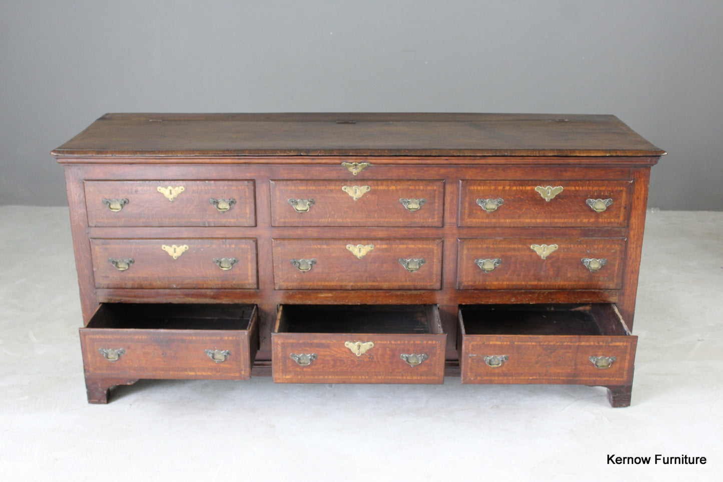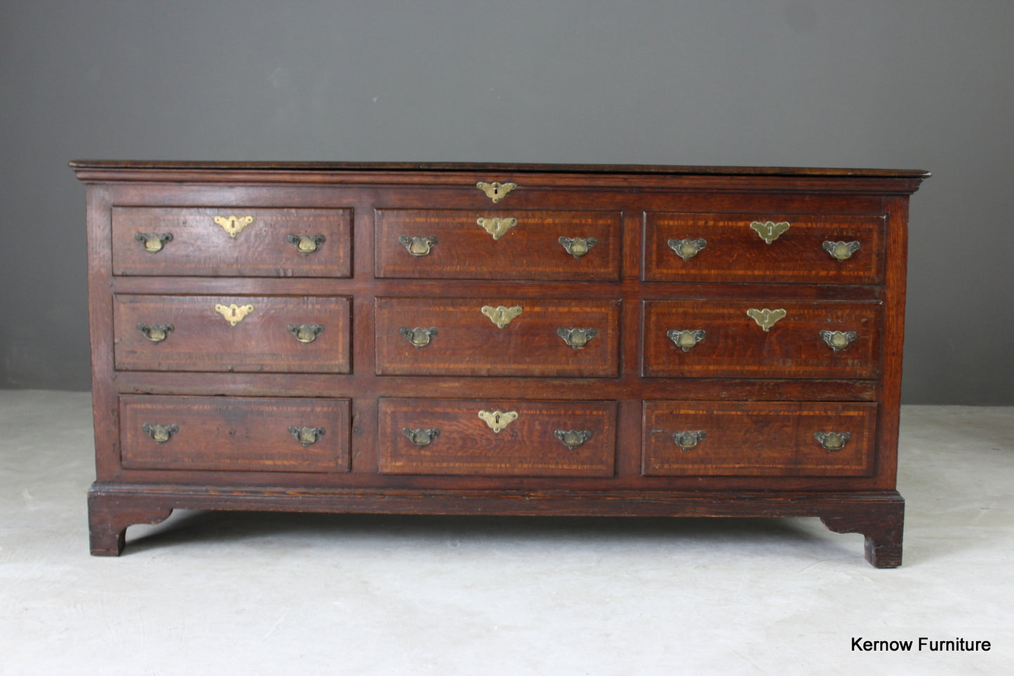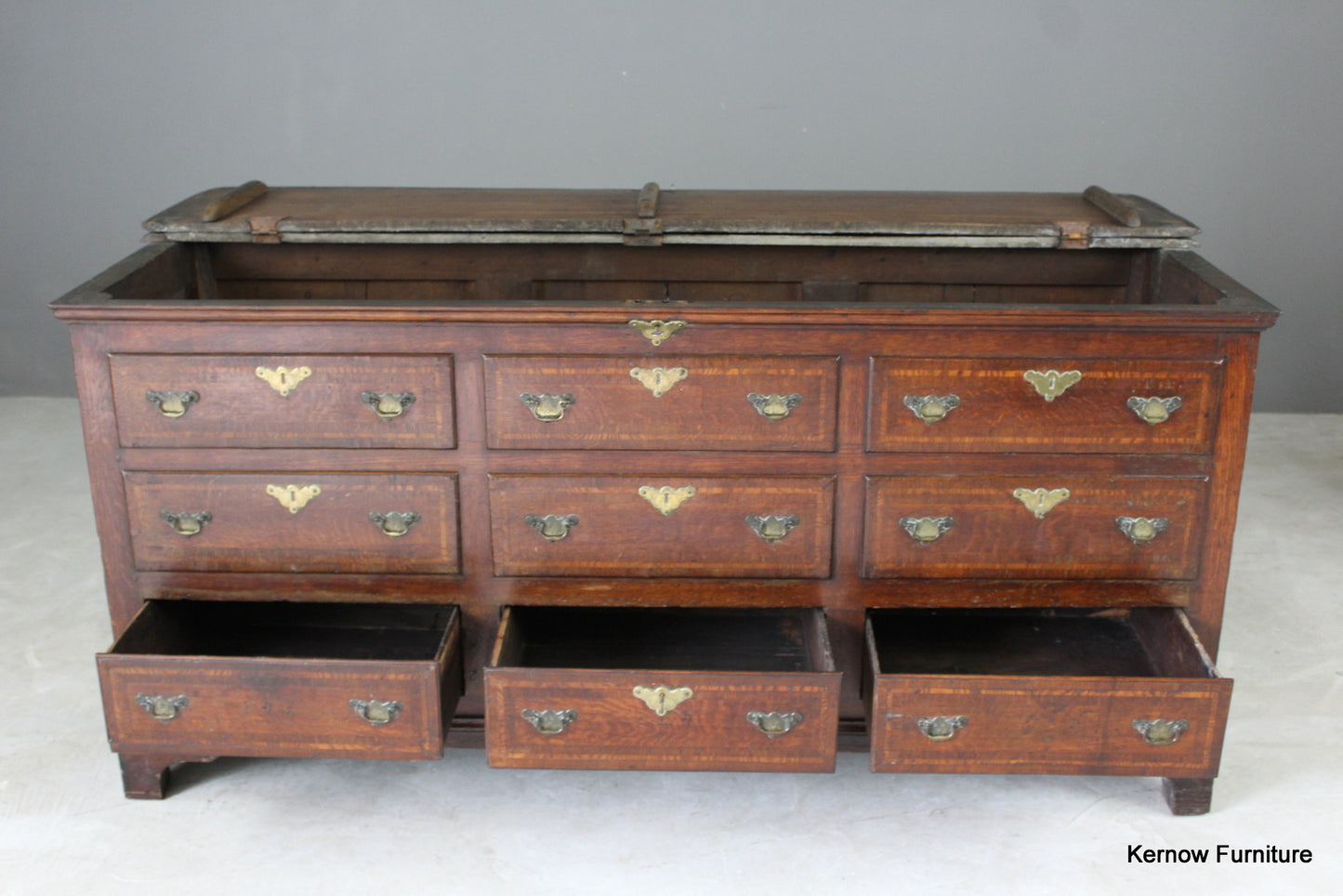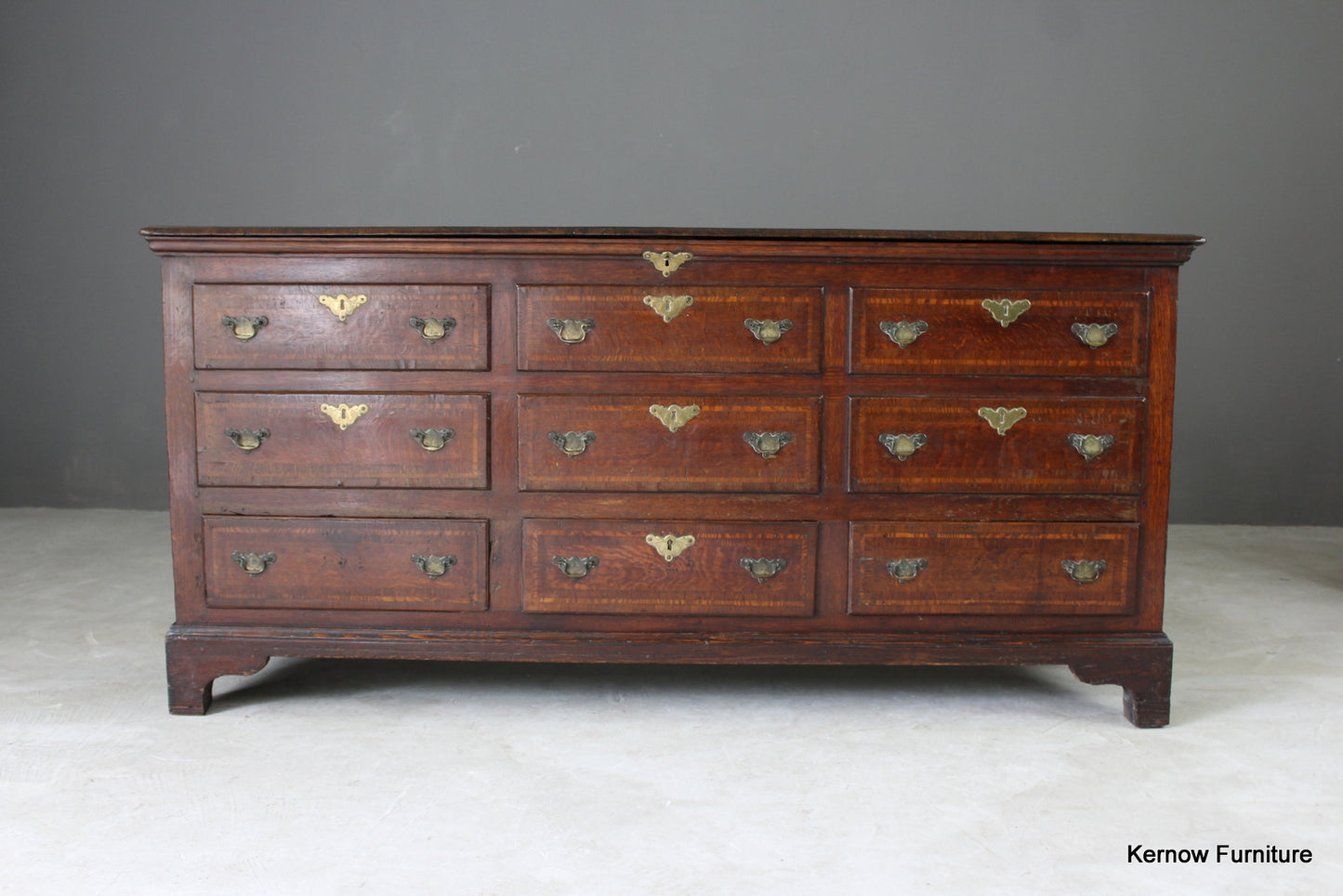 Georgian oak mule chest. Antique George III oak mule chest, the top with a hinged plank lid, to the front are six dummy drawers with three drawers below, crossbanded drawers fronts with brass handles and escutcheons on bracket feet.