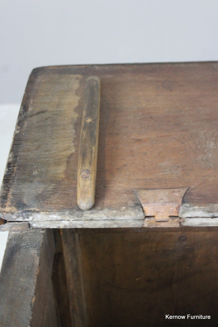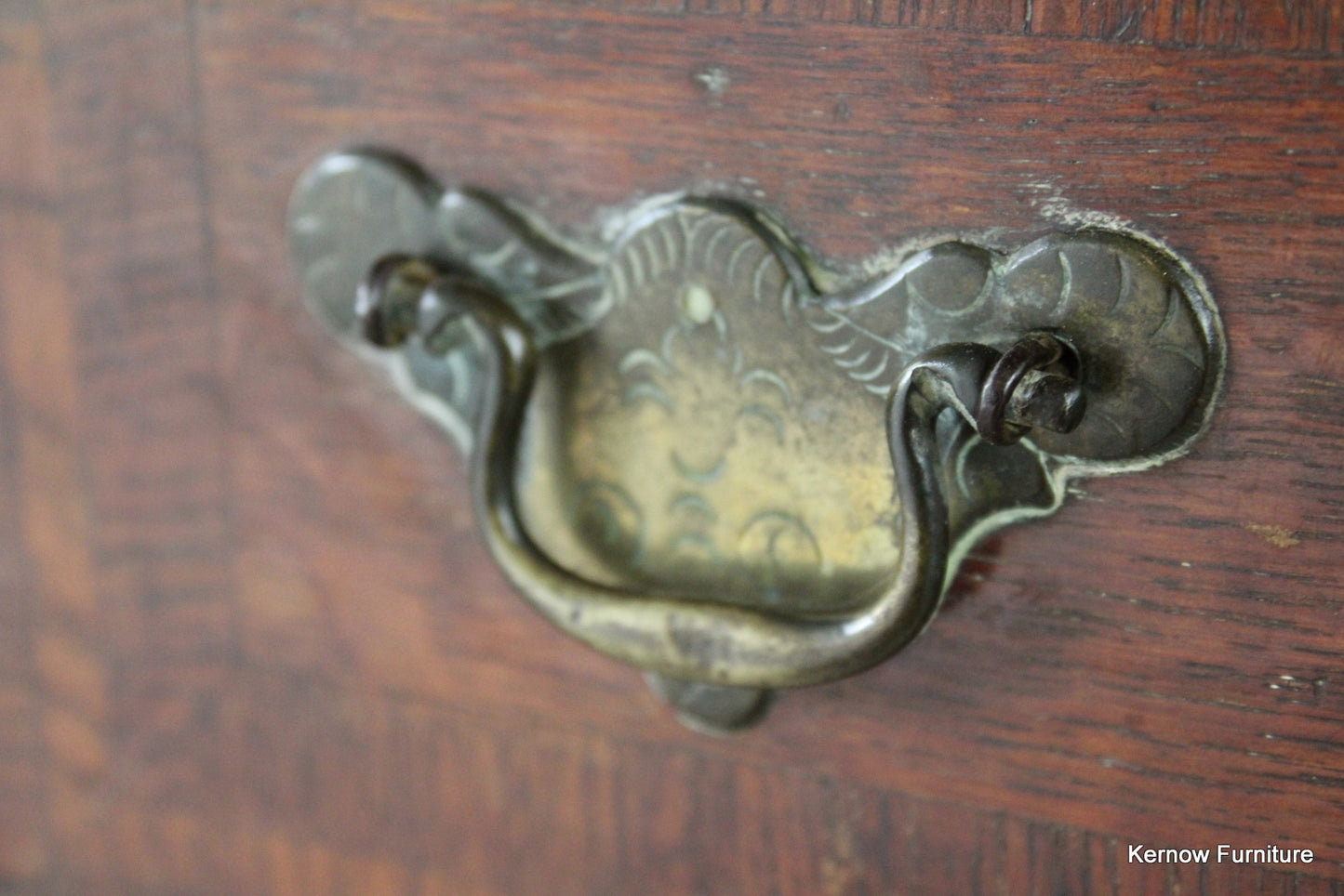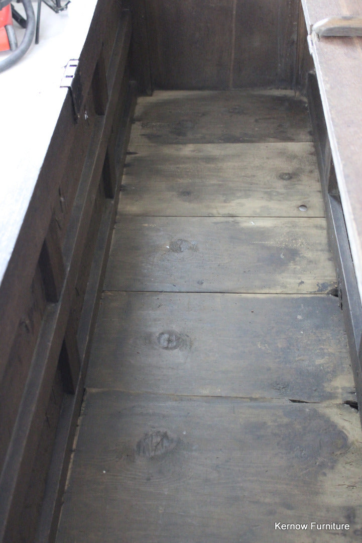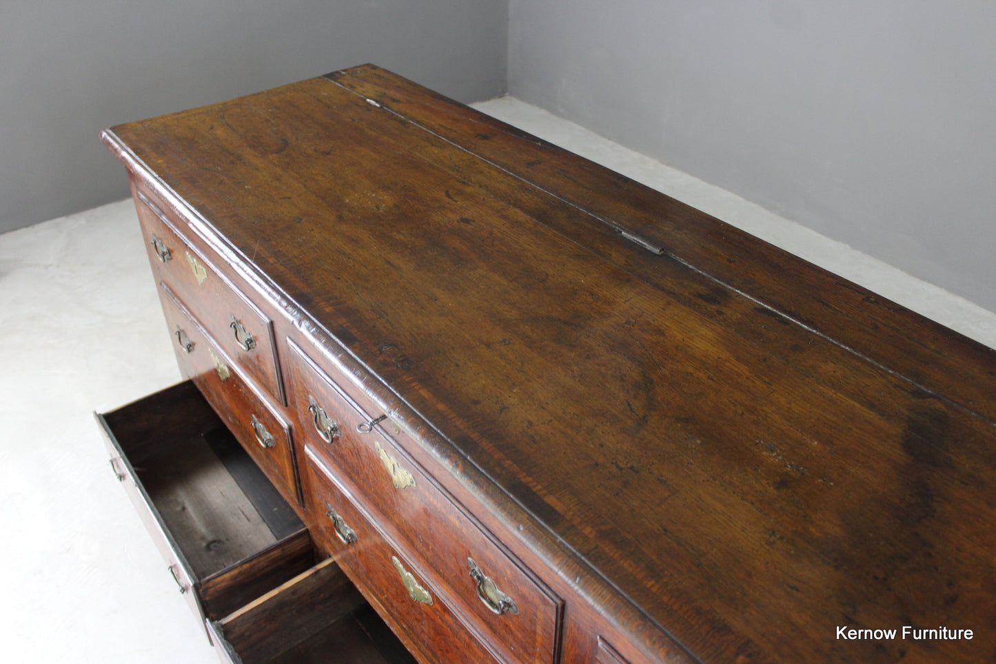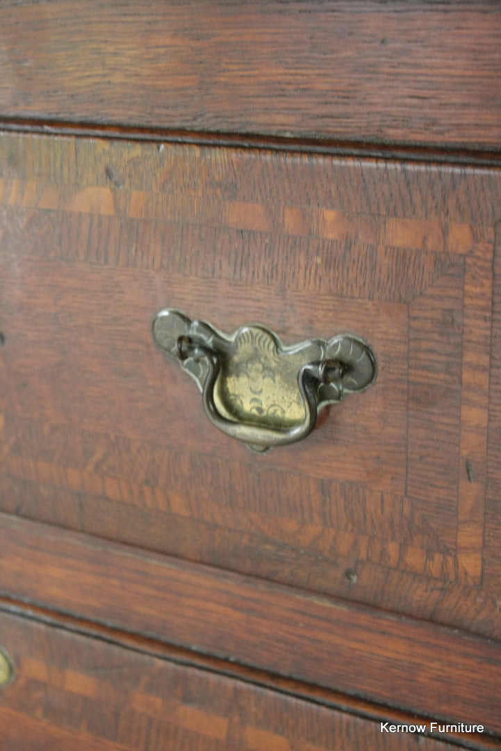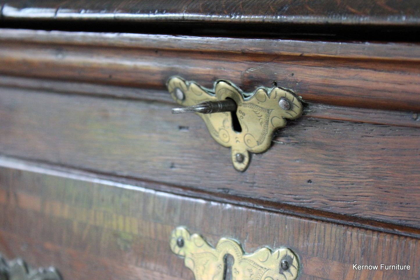 Georgian oak mule chest. Antique George III oak mule chest, the top with a hinged plank lid, to the front are six dummy drawers with three drawers below, crossbanded drawers fronts with brass handles and escutcheons on bracket feet.