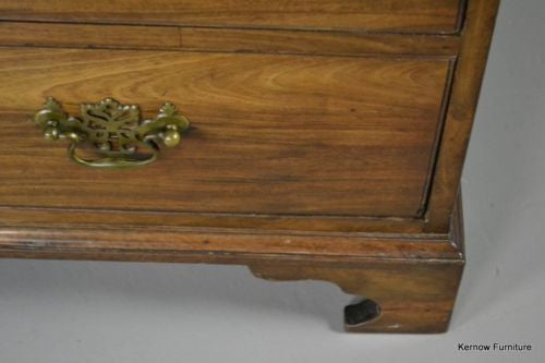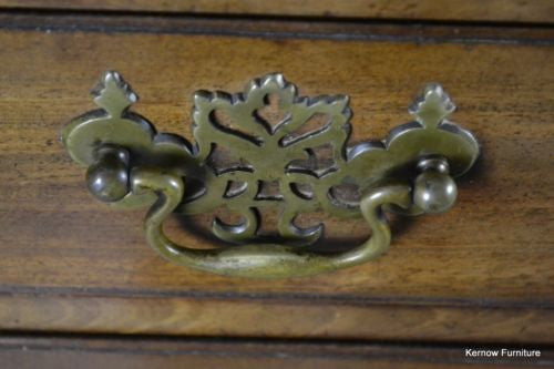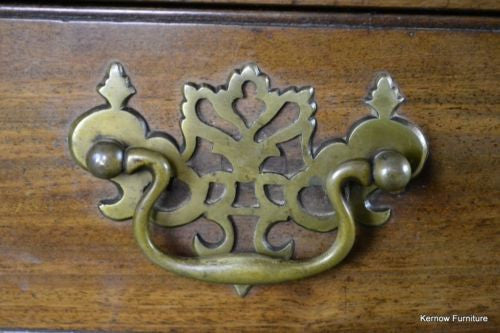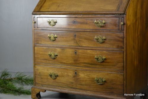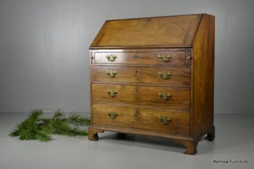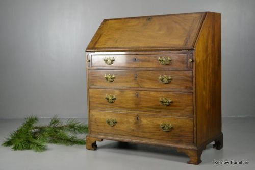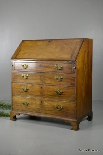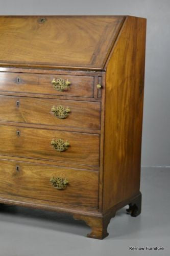 Antique Georgian style mahogany writing bureau. Fall front with fitted interior over 4 graduating drawers with brass handles on bracket feet.