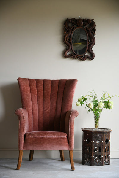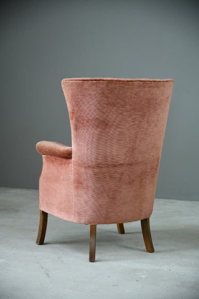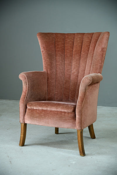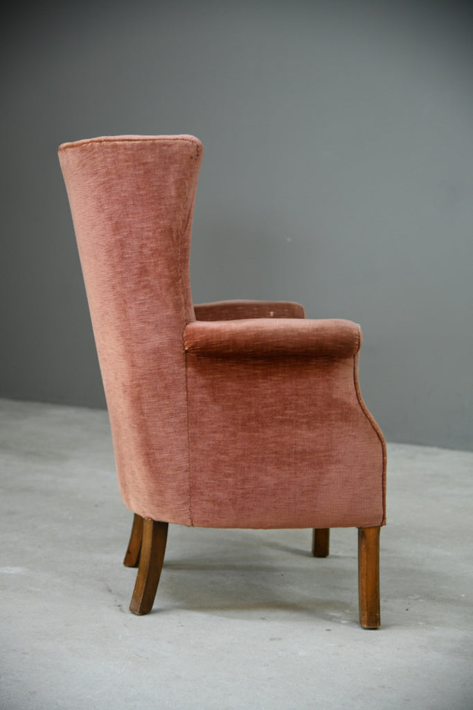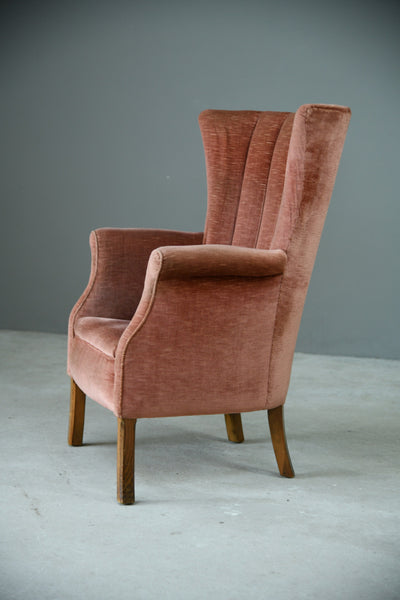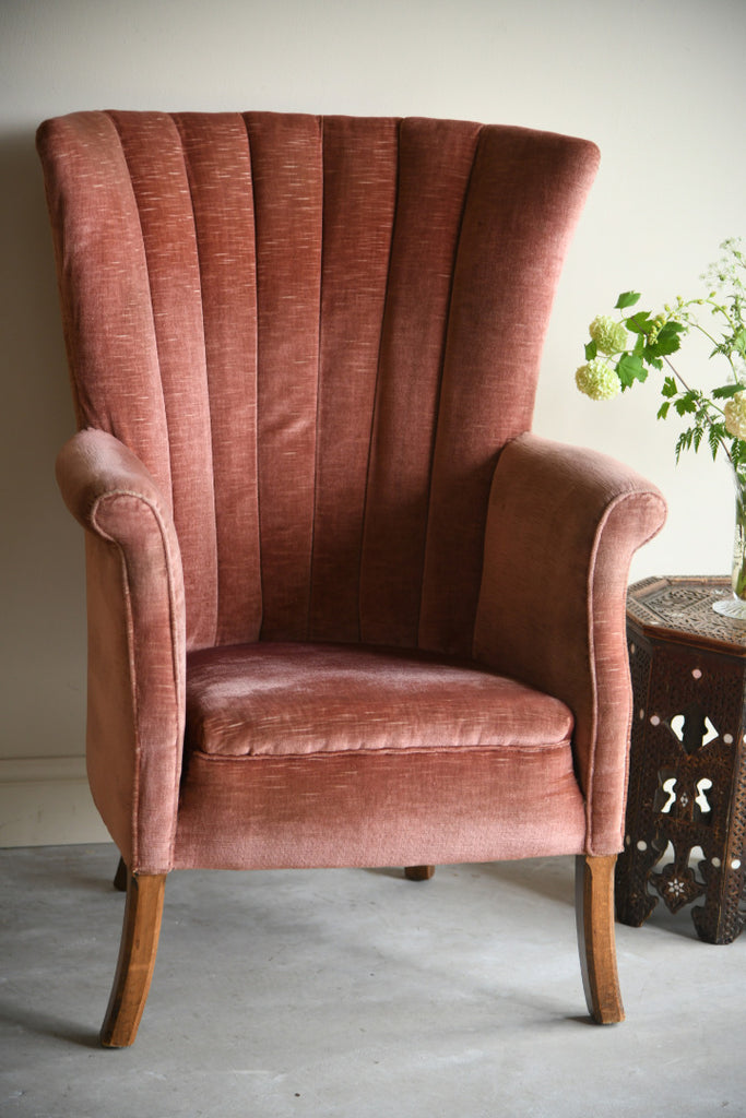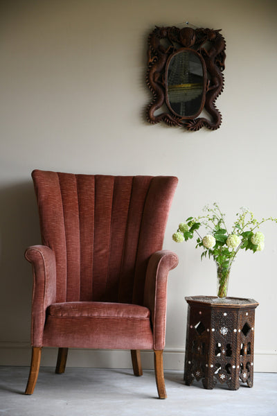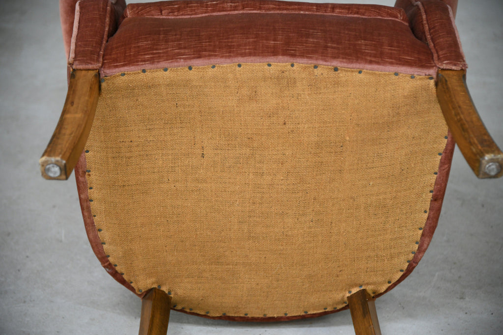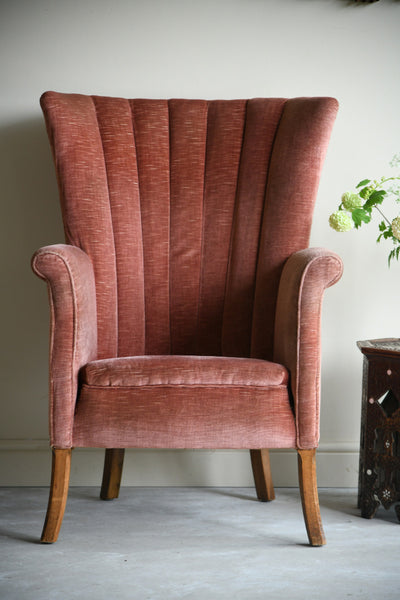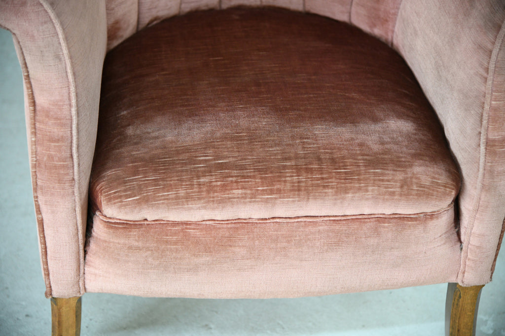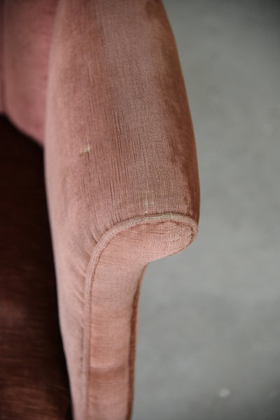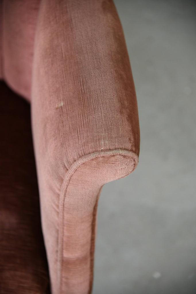 Georgian style upholstered armchair. Early 20th Century armchair with fluted shaped back, upholstered in pink dralon, with sprung seat on short splayed legs.