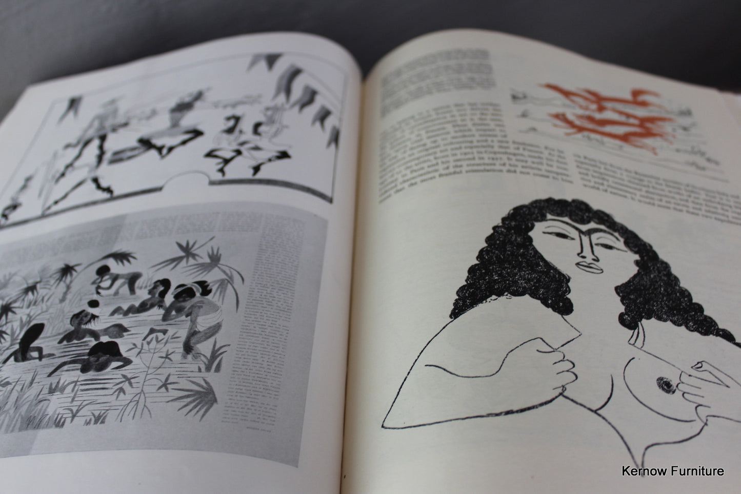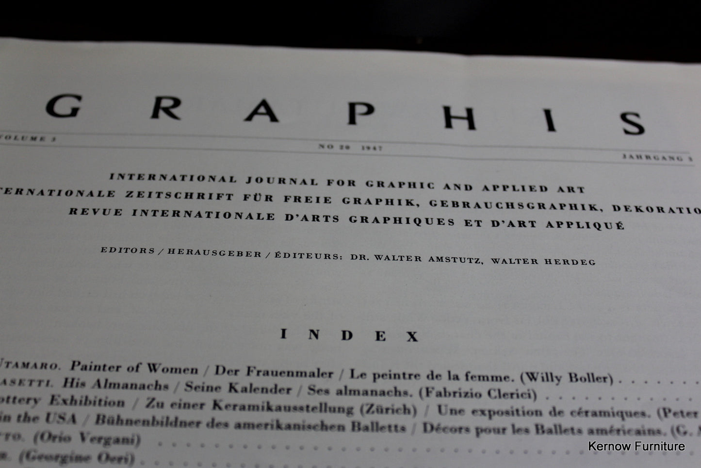 The 20th issue of Graphis magazine features a host of articles on different media, including Notes on a Pottery Exhibition, written by Peter Meyer; Ballet Designs in the USA, by G. Amberg; English Bookplates To-day, by M.F. Severin; American Primitive Painting, by Arnold Rudlinger; Painting Behind Glass, by Wilhelm Sulser; Christmas and New Year's Cards, by Elisabeth Gerold; Paris Packs its Precious Scents, by Mabel Zuppinger; The "Hard Stones": a Dying Art, by Fabrizio Clerici; Illustrious Letter-Headings, by L.F. Gruber; and Tirggels: Zurich's Traditional Sweetmeat, by Edwin Arnet. Artist profiles include Kitagawa Utamaro: Painter of Women, written by Willy Boller; Piero Fornasetti: His Almanachs, by Fabrizio Clerici; Paolo Garretto, by Orio Vergani; Mogens Zieler, by Georgine Oeri; and Balzac: seen by 12 modern artists, by L.F. Gruber.