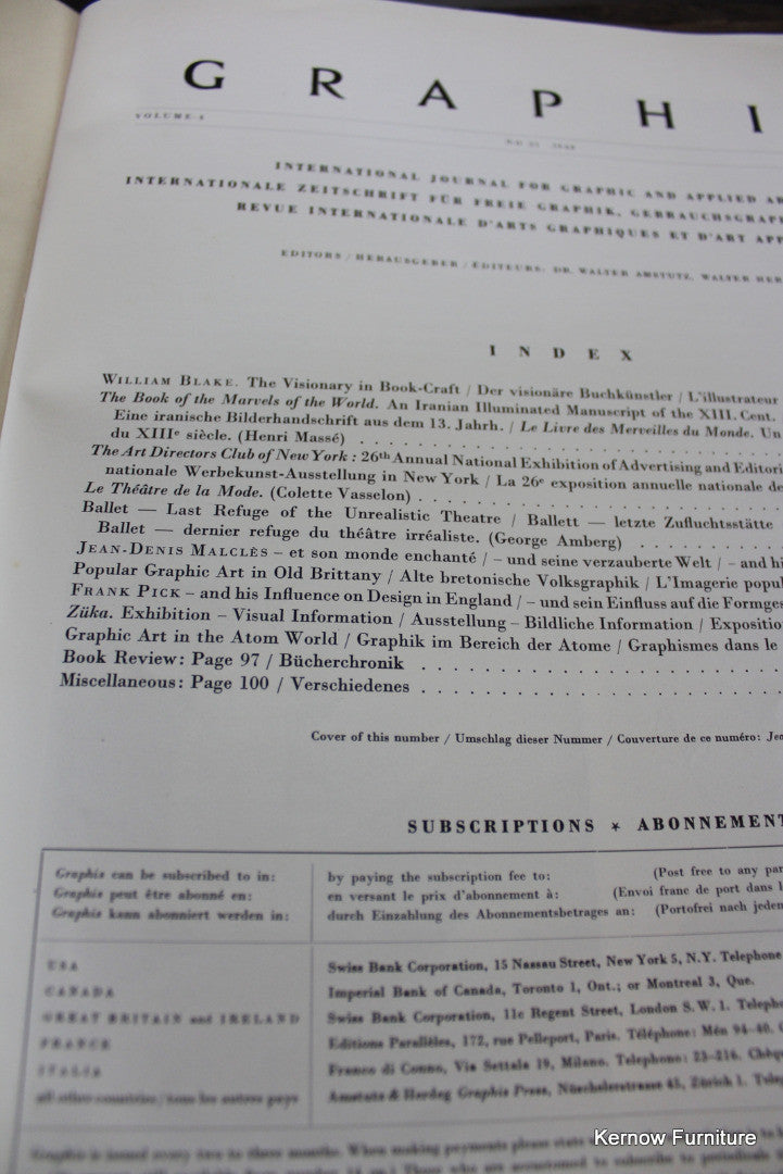 Issue 21 of Graphis magazine features articles on The Book of the Marvels of the World: An Iranian Illuminated Manuscript of the XIII Century, written by Henri Masse; Le Theatre de la Mode, by Colette Vasselon; Ballet ? Last Refuge of the Unrealistic Theatre, by George Amberg; Popular Graphic Art in Old Brittany, by P.L. Duchartre; Zuka: Exhibition ? Visual Information, by G. Oeri; Graphic Art in the Atom World, by Max Bill; and The Art Directors Club of New York: 26th Annual National Exhibition of Advertising and Editorial Art (1947). Artist profiles include William Blake: The Visionary in Book-Craft, by F. Stahly; Jean-Denis Malcles ? and his enchanted world, by C. Vasselon; and Frank Pick ? and his Influence on Design in England, by Ch. Barman.