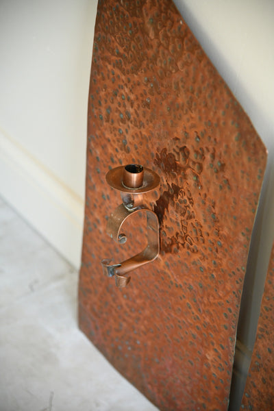 Hammered Copper Wall Sconce. Early - mid 20th Century wall sconce, large hammered copper panel with scrolled copper candle sconce