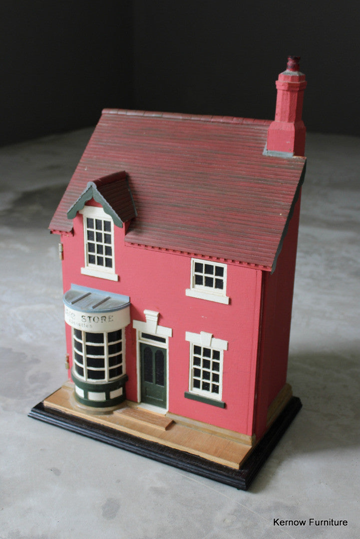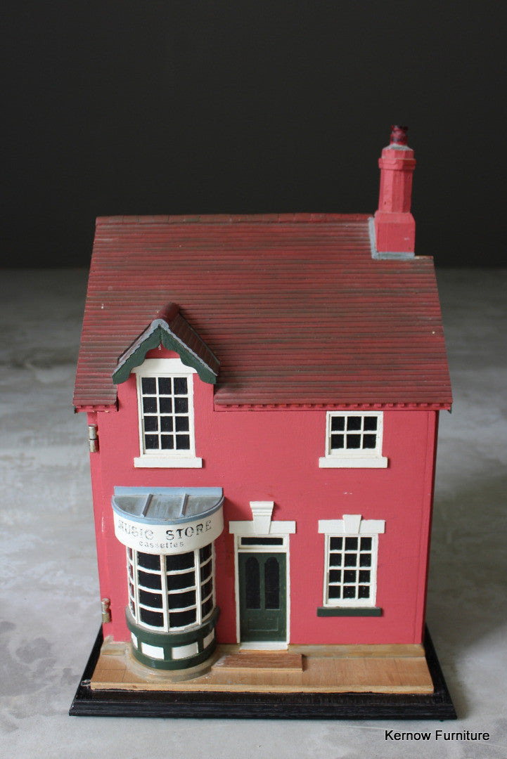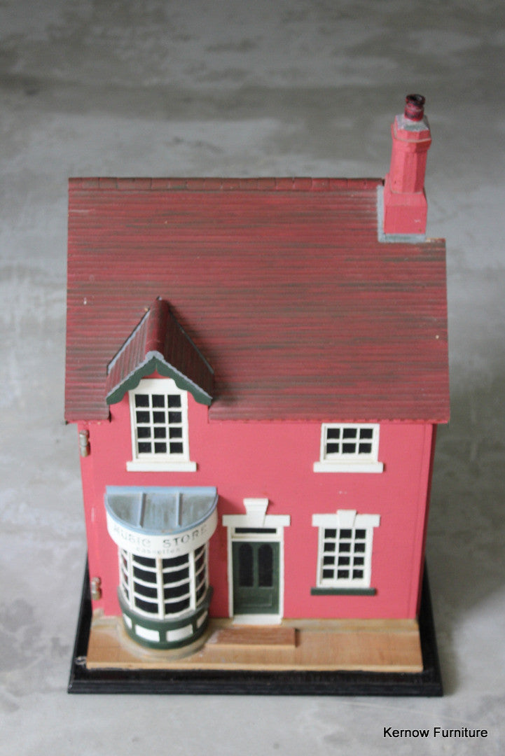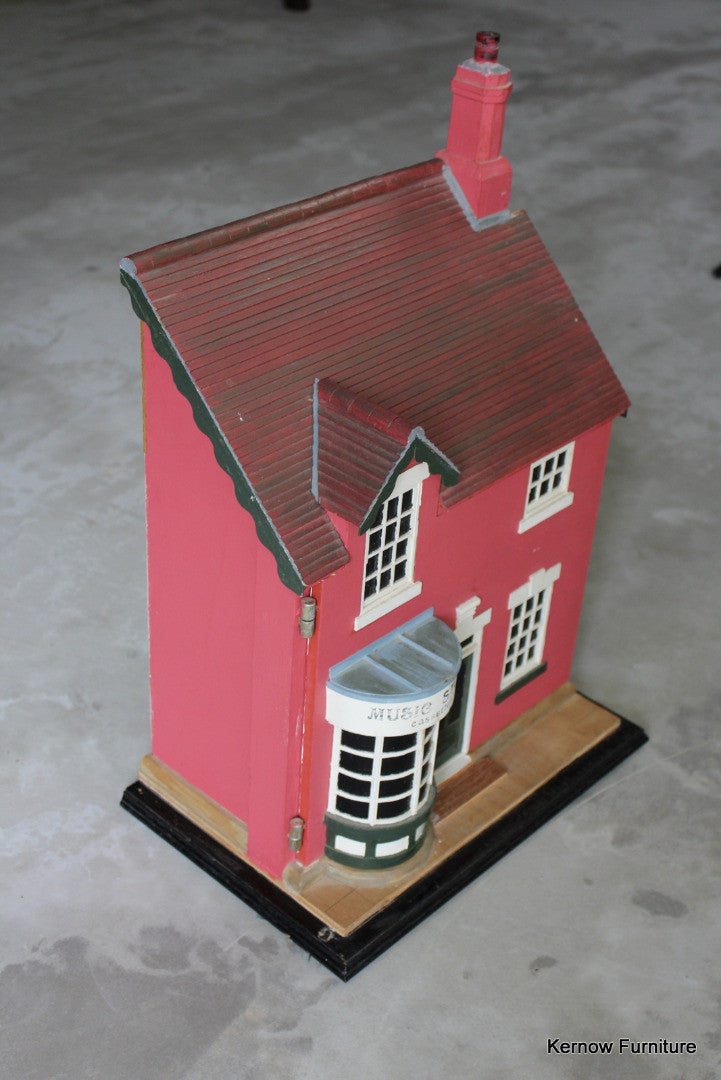 Hand made dolls house. Hand made music store, wooden dolls house with painted exterior, single hinged door and 2 floors inside.