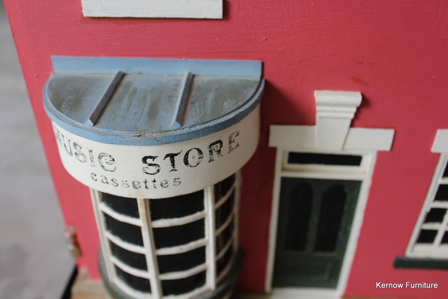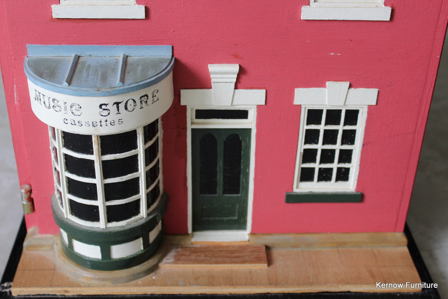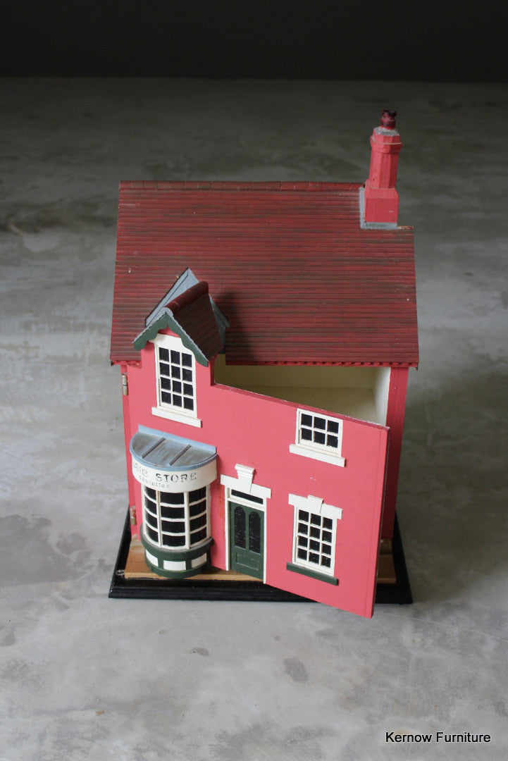 Hand made dolls house. Hand made music store, wooden dolls house with painted exterior, single hinged door and 2 floors inside.
