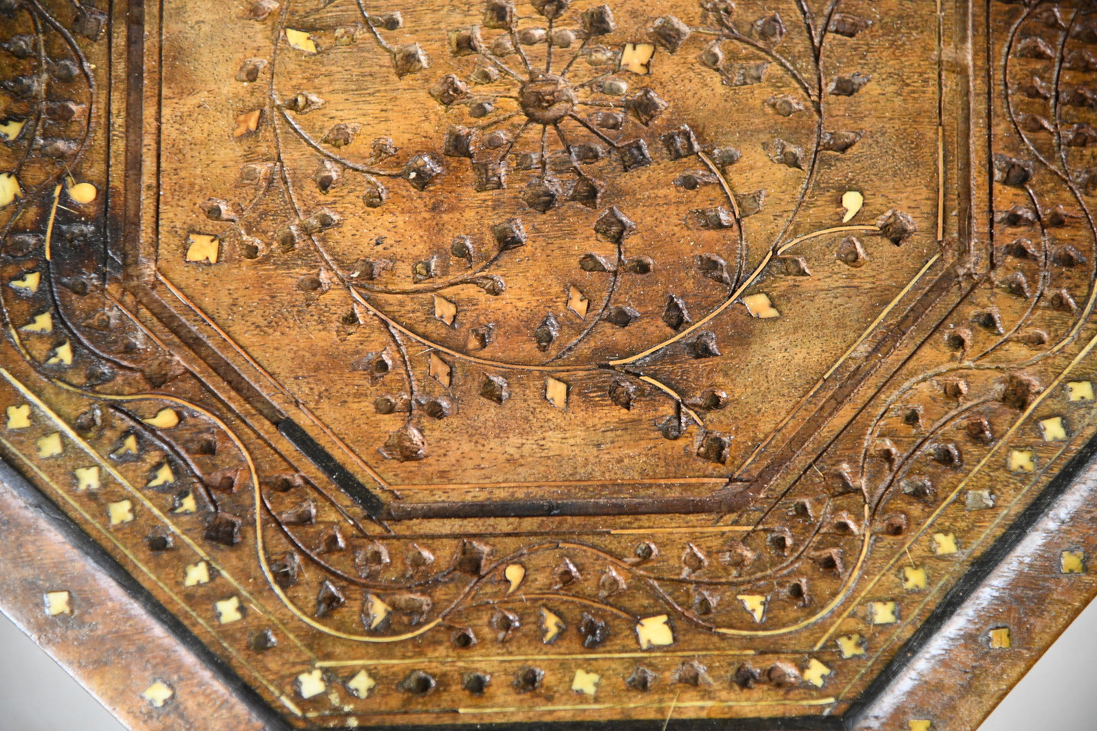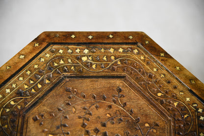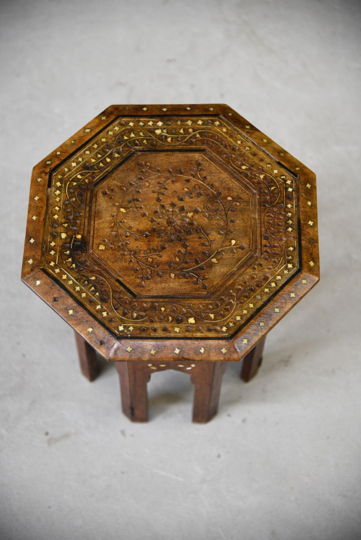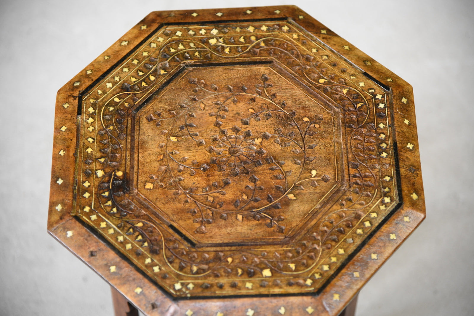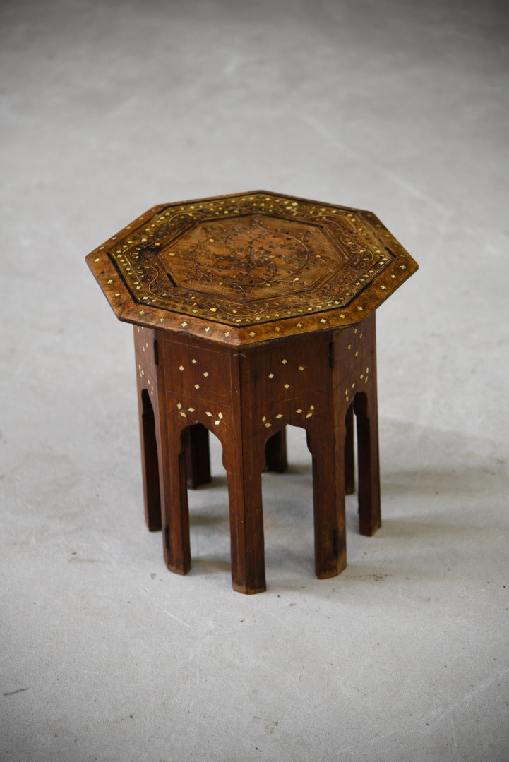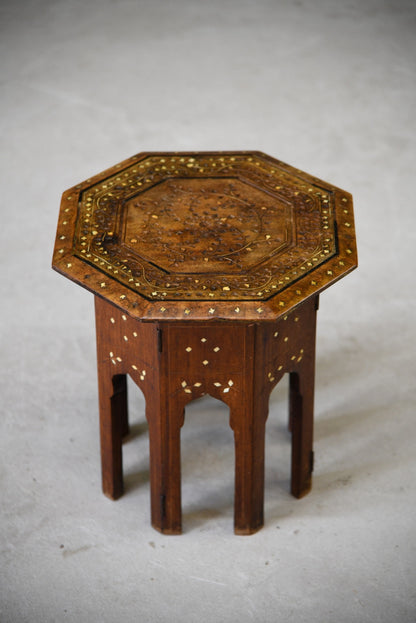Inlaid Eastern Table. Small Indian side table, octagonal top with decorative inlay on folding stand.