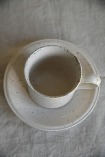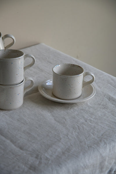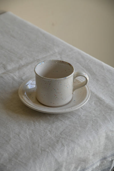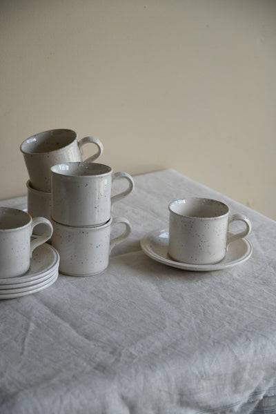 John Tams Confetti Cups & Saucers. Set of six 1980s cups and saucers, cream ceramic with multicoloured speckle glaze.