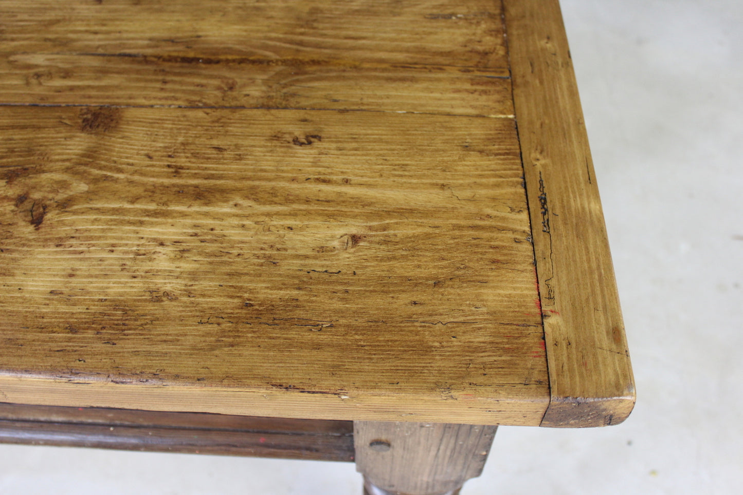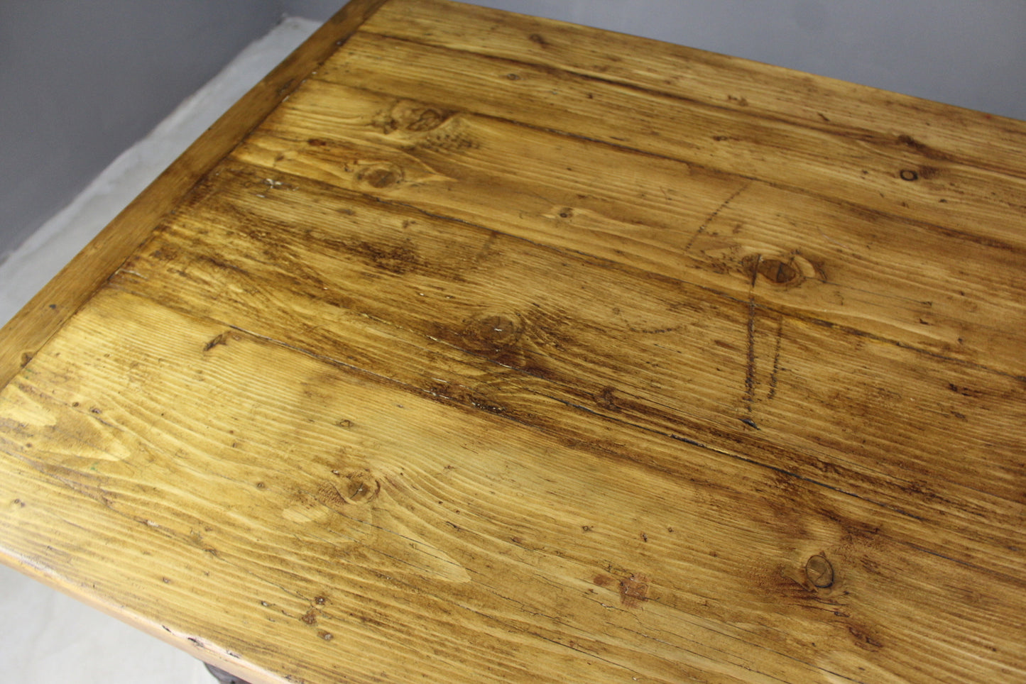 Condition: Solid condition, some wood filler in the top, lots of age and wear to the pine top. At the moment the top is loose as it is very difficult to move with the top fixed as it's so heavy. I can supply some brackets and blocks that will just need a few screws to locate and secure the top to the base.
