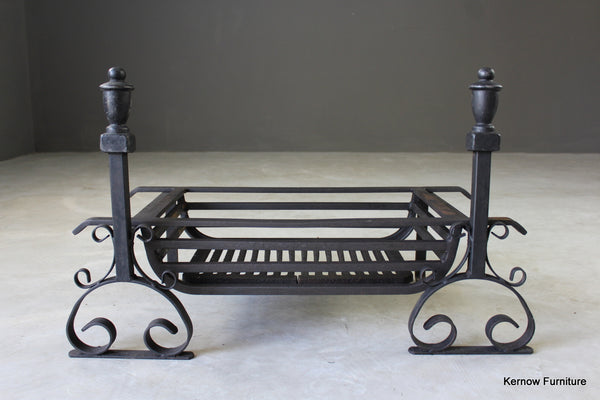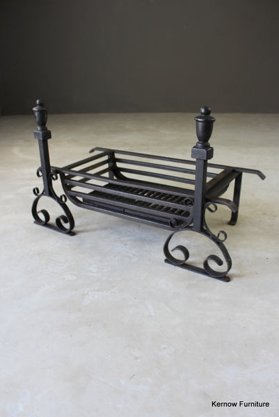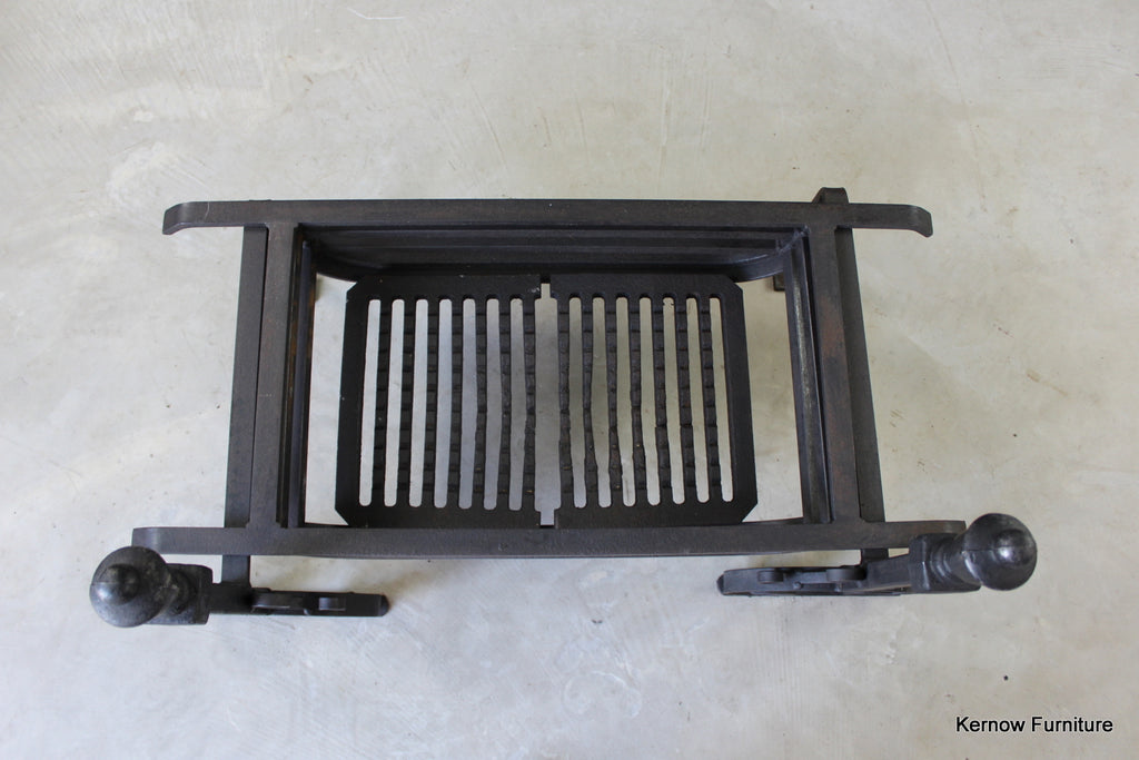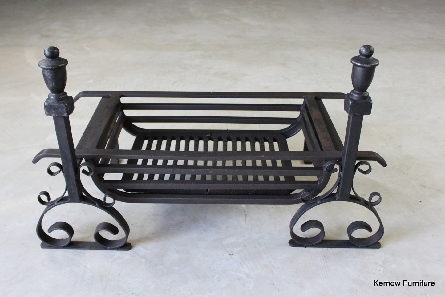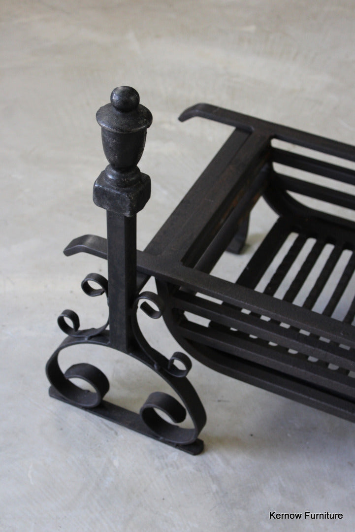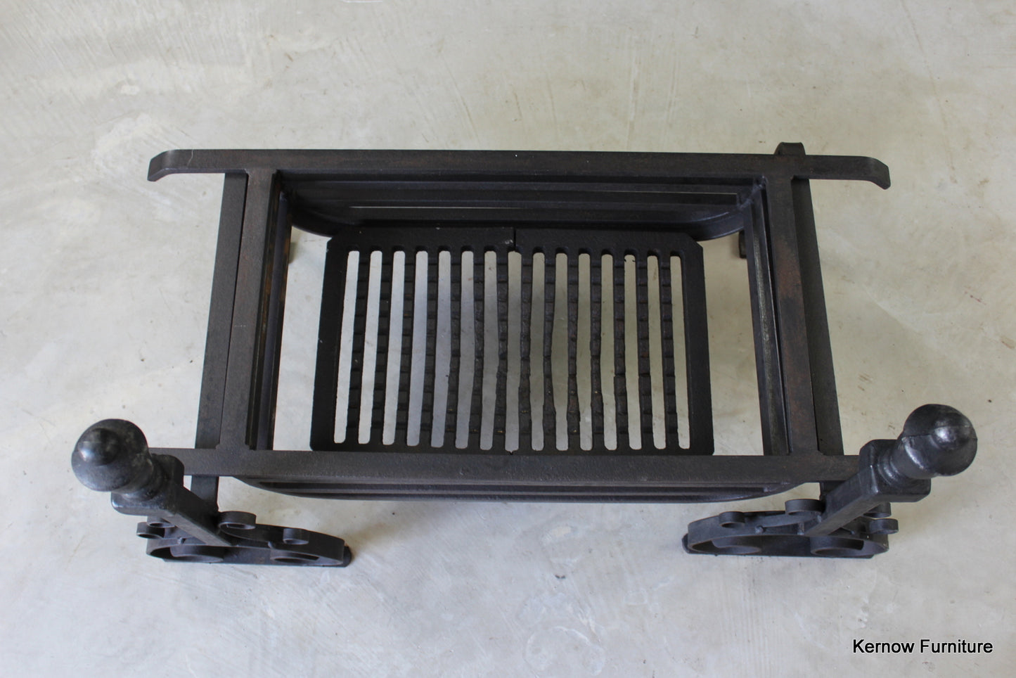 Large antique style cast iron fire grate. Pair andirons with large basket.