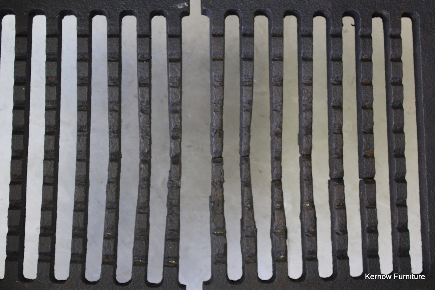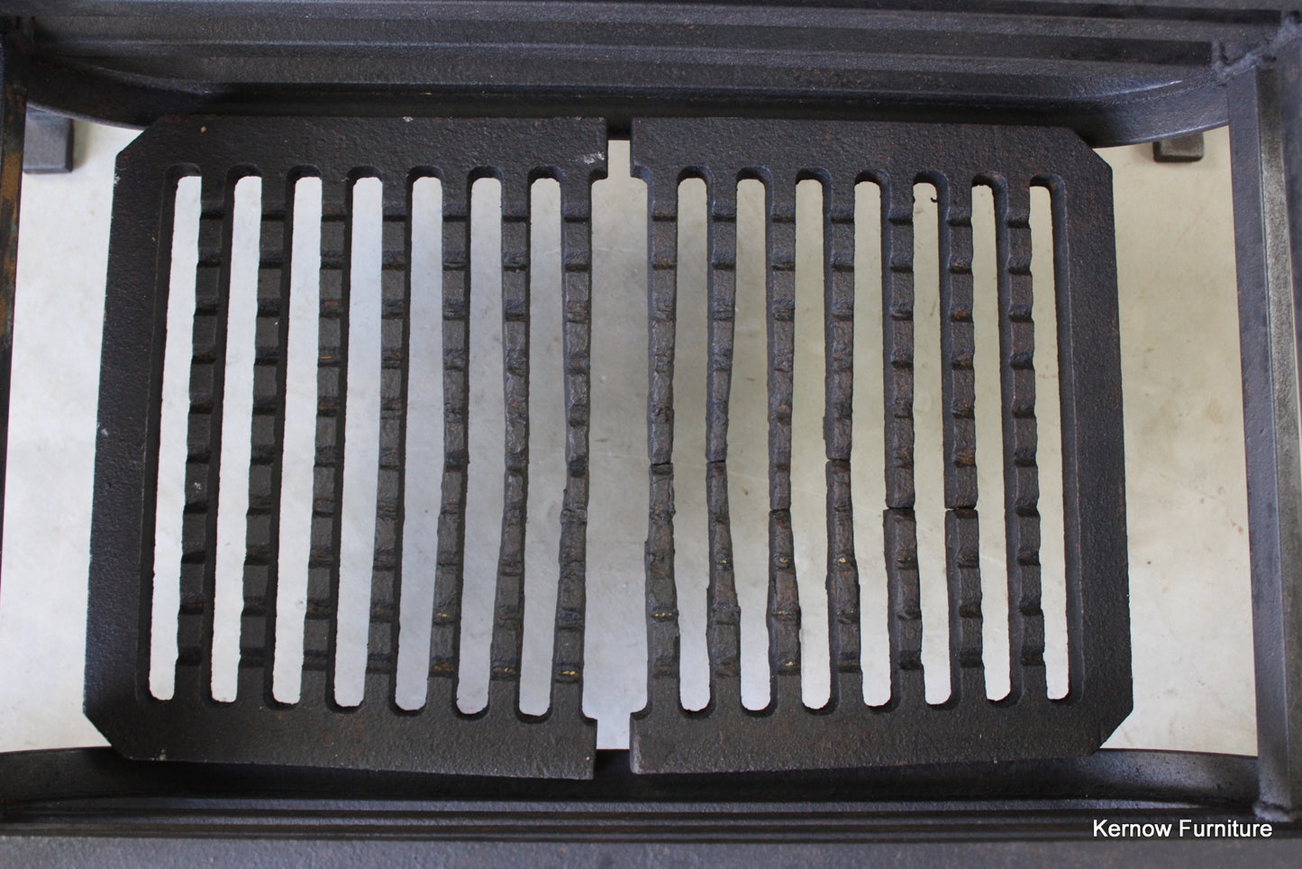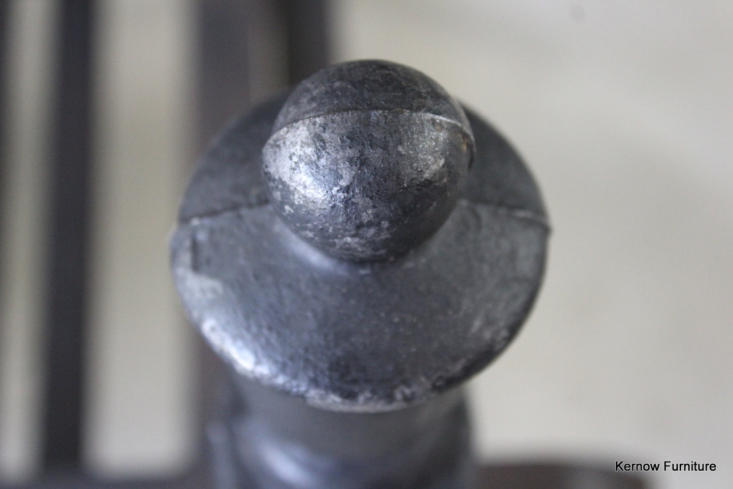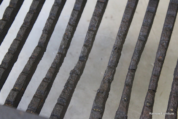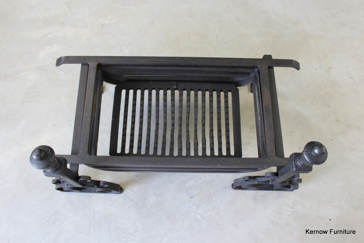 Large antique style cast iron fire grate. Pair andirons with large basket.