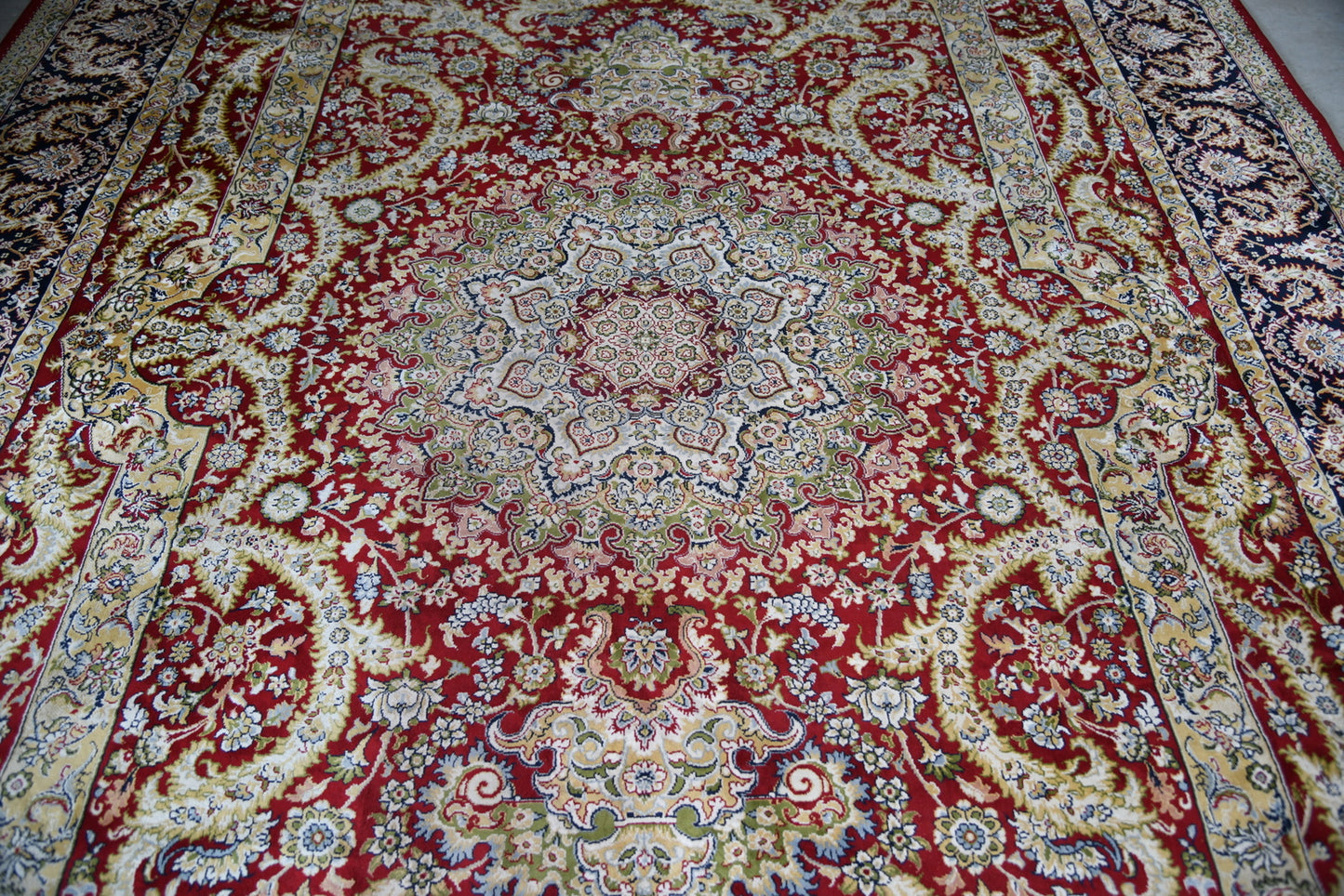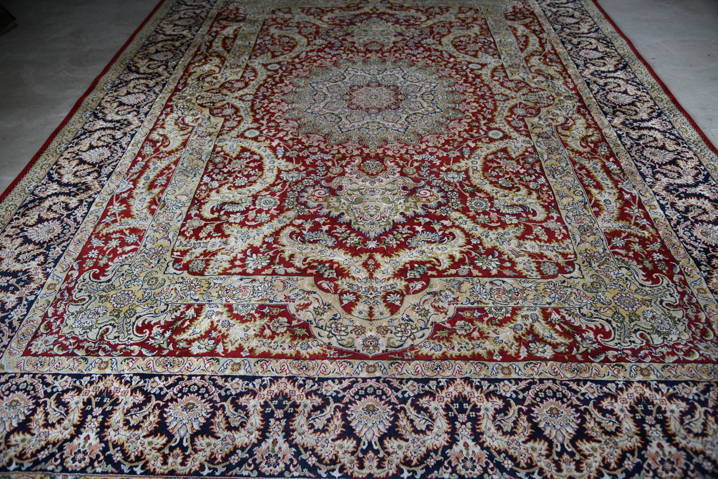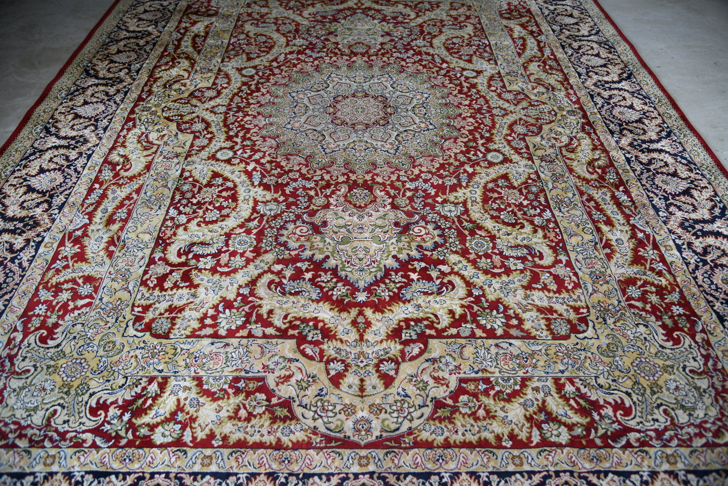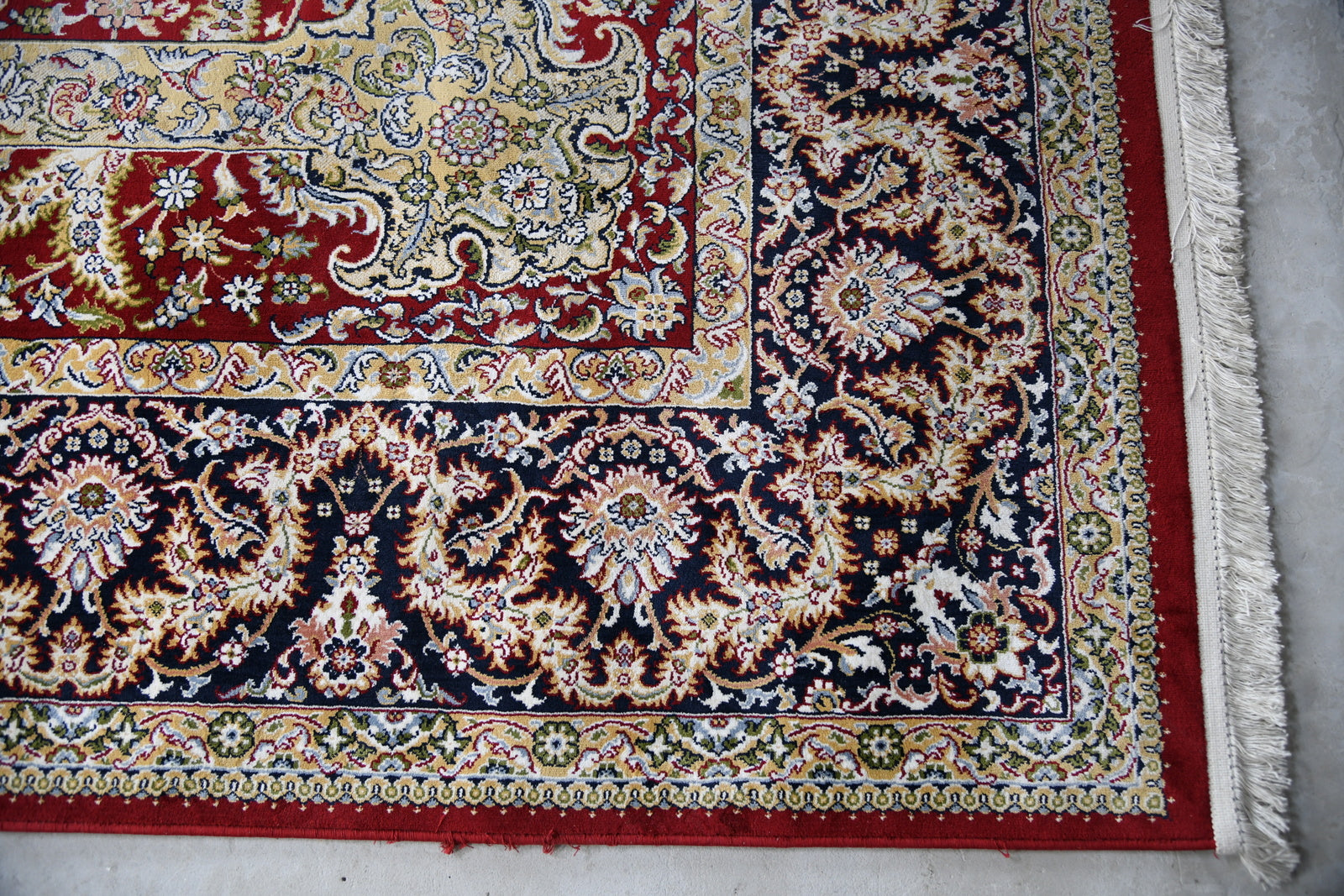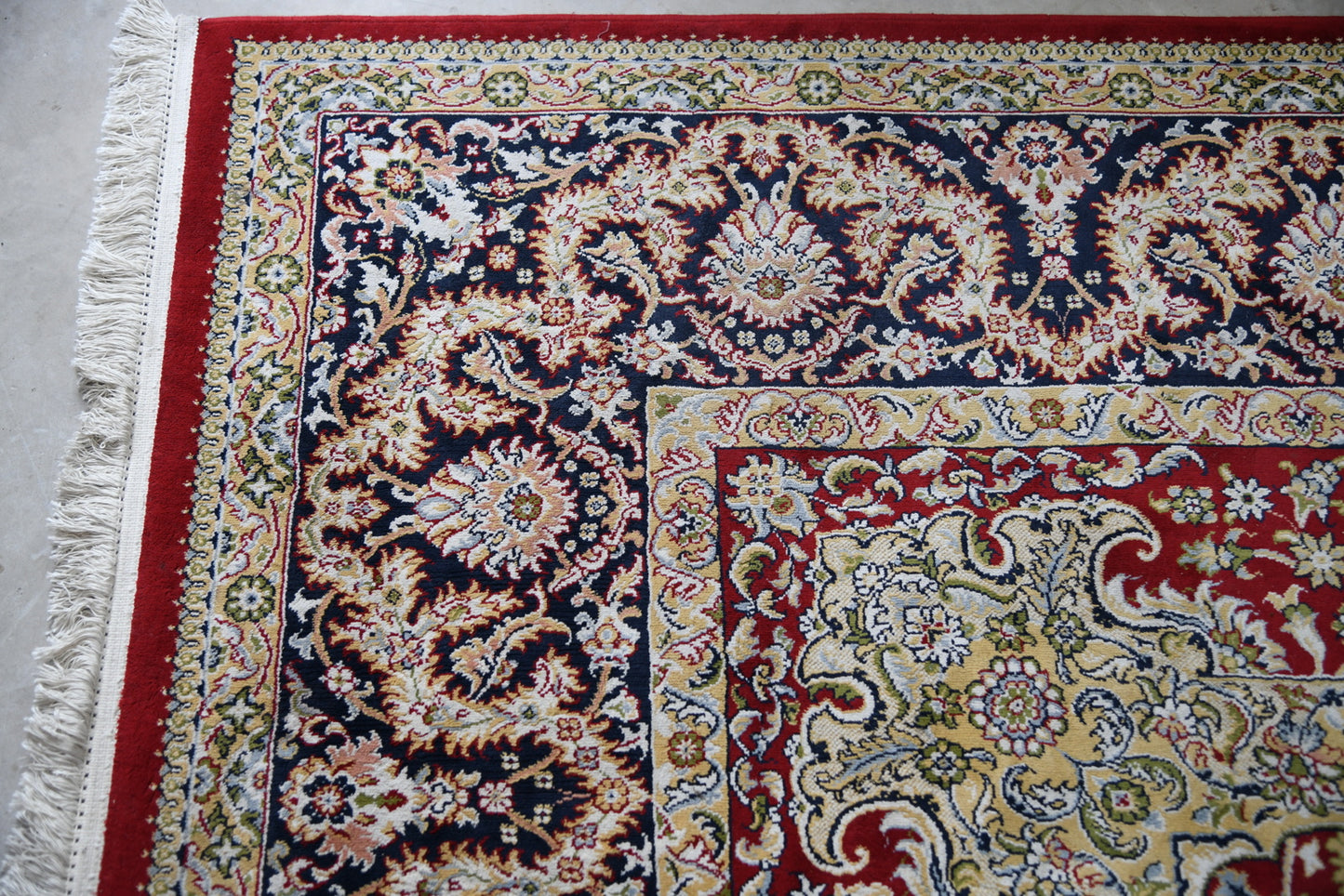 Large Indian Rug. 20th Century large Indian rectangular rug with central medallion & floral decoration on red and blue ground.