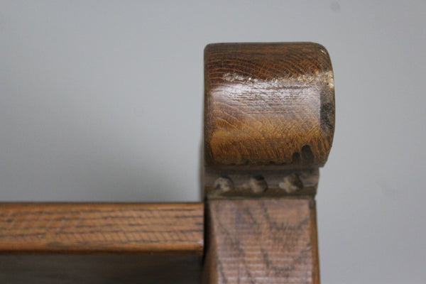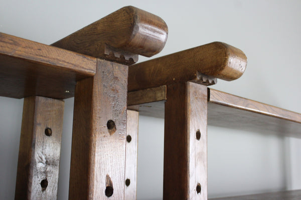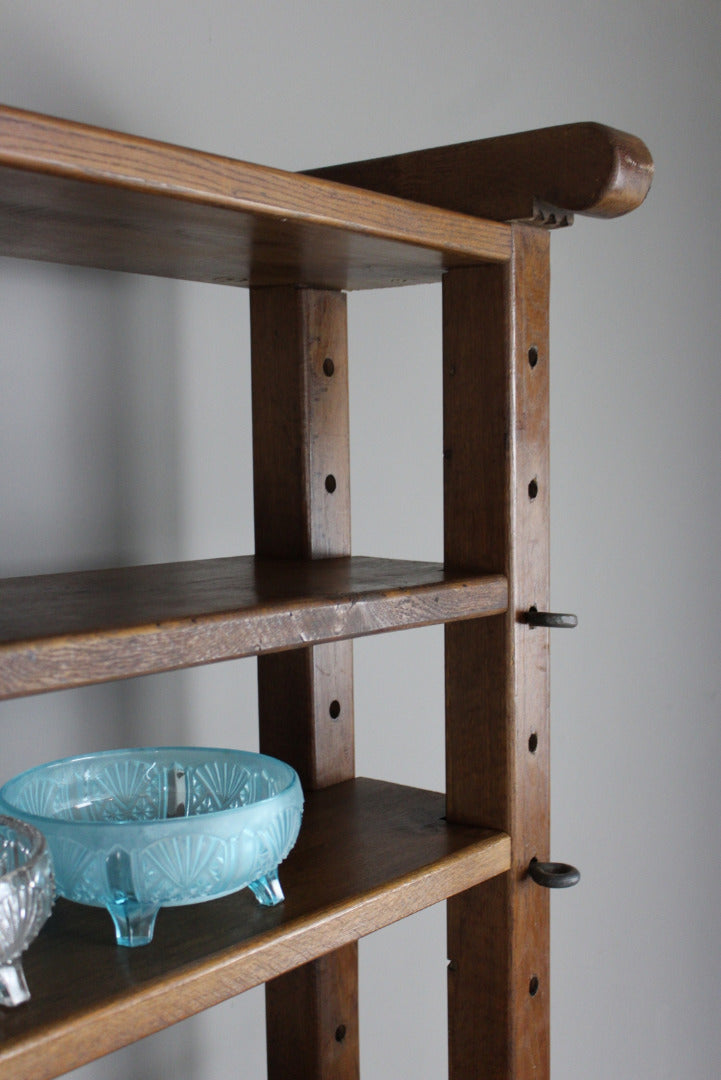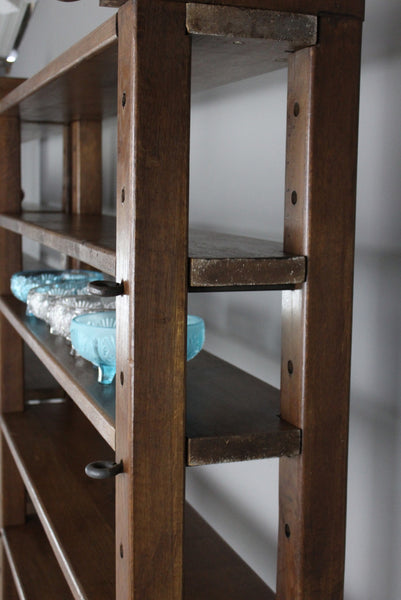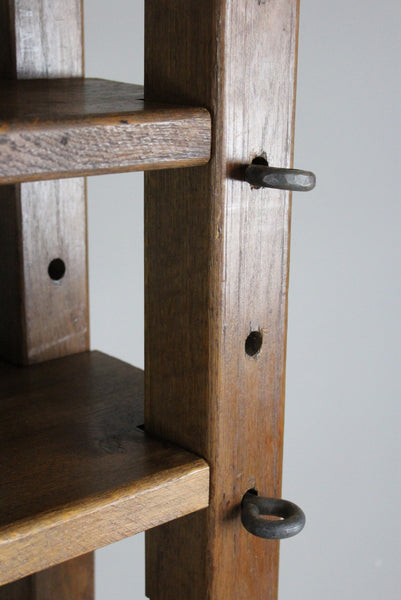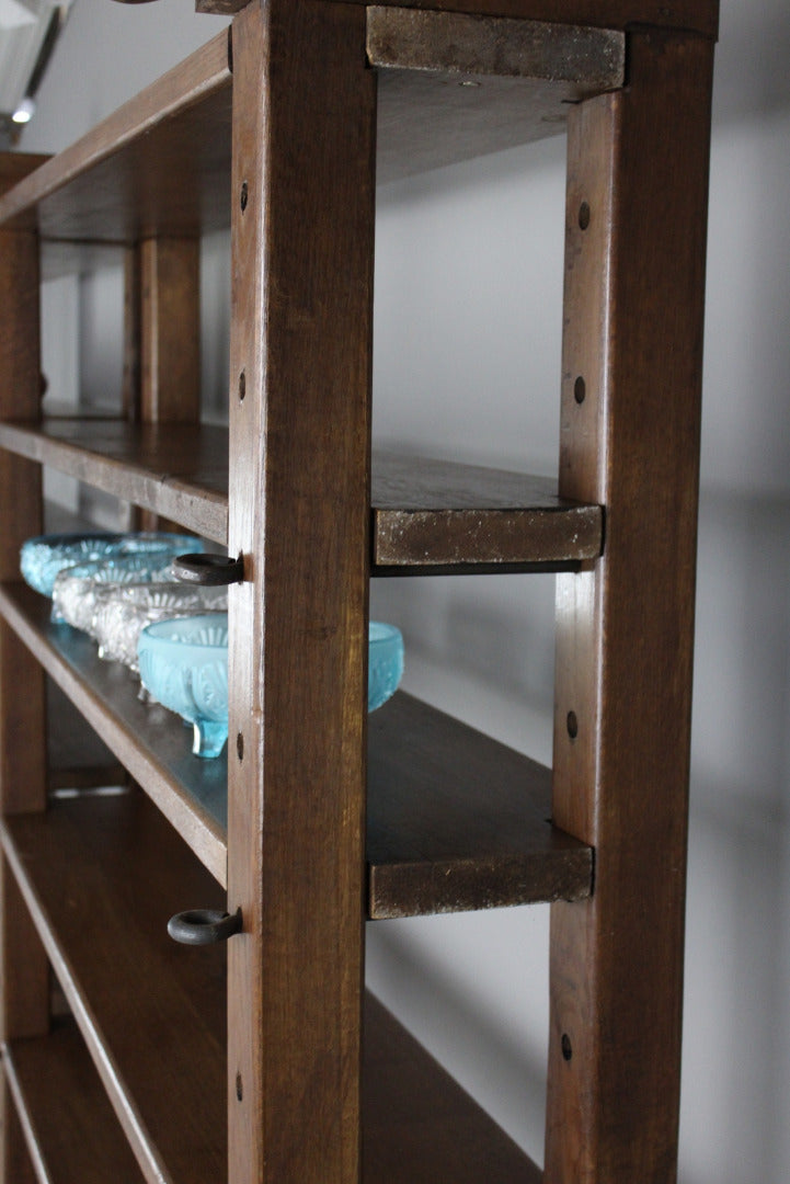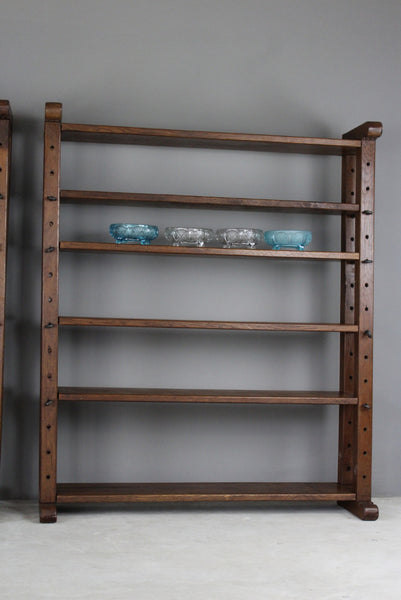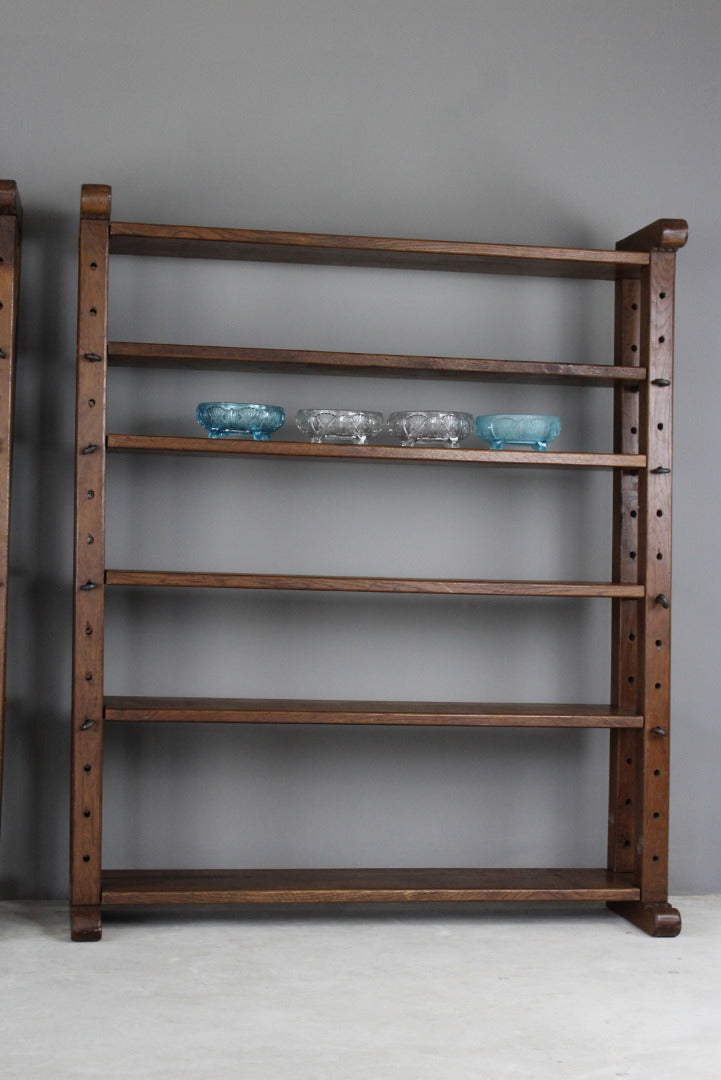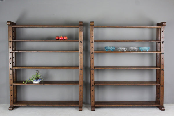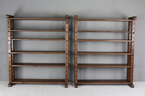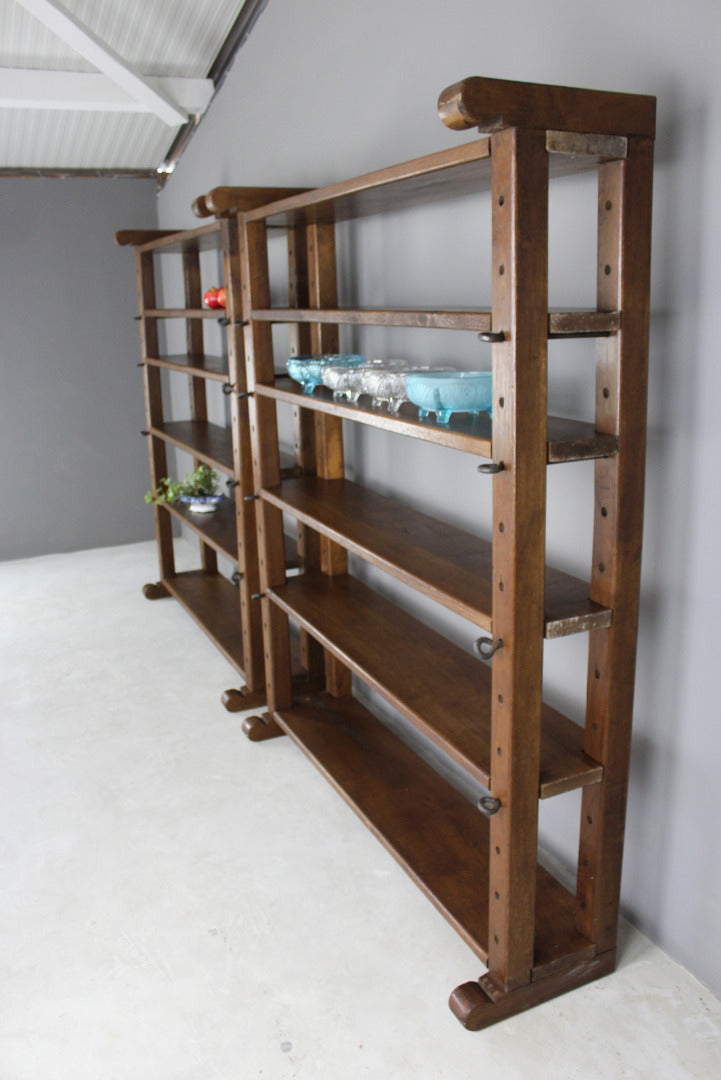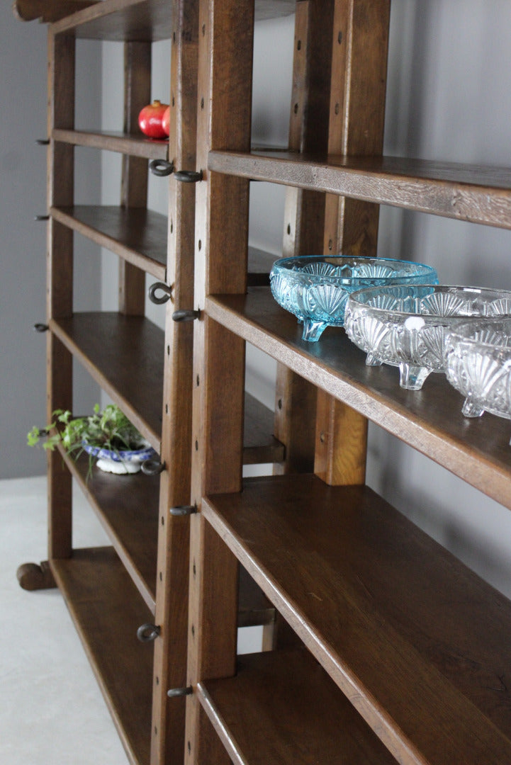 Large oak bookcase. 20th Century solid chunky oak freestanding shelving units each with 4 solid oak shelves with cast iron pins.