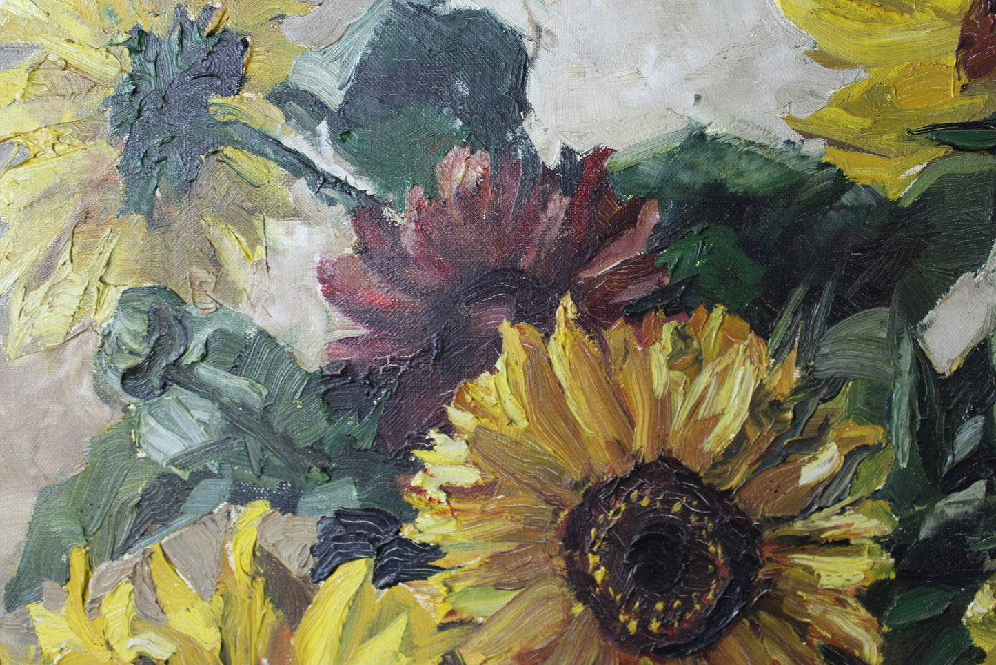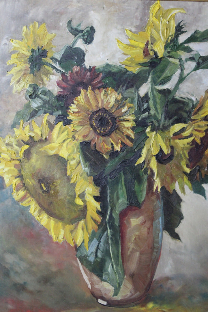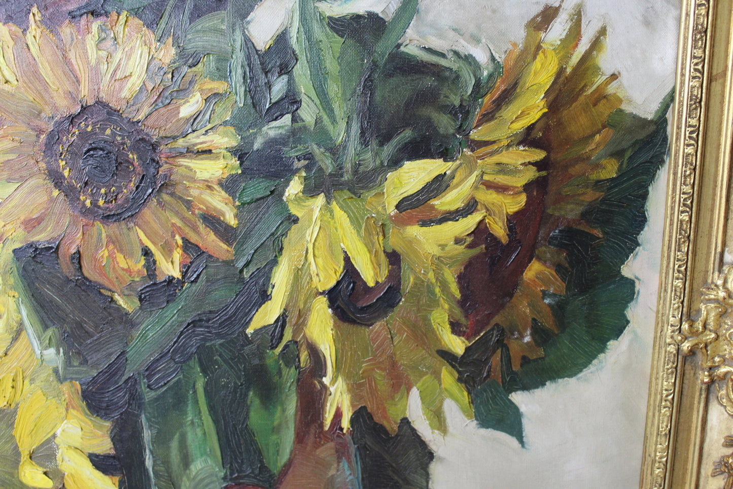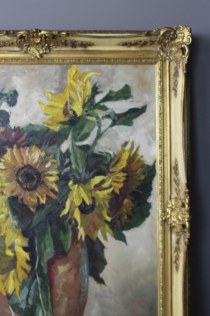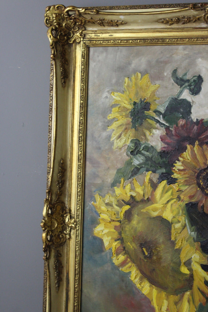 Large still life pictures. 20th Century continental oil on canvas still life of sunflowers in ornate gilt frame.