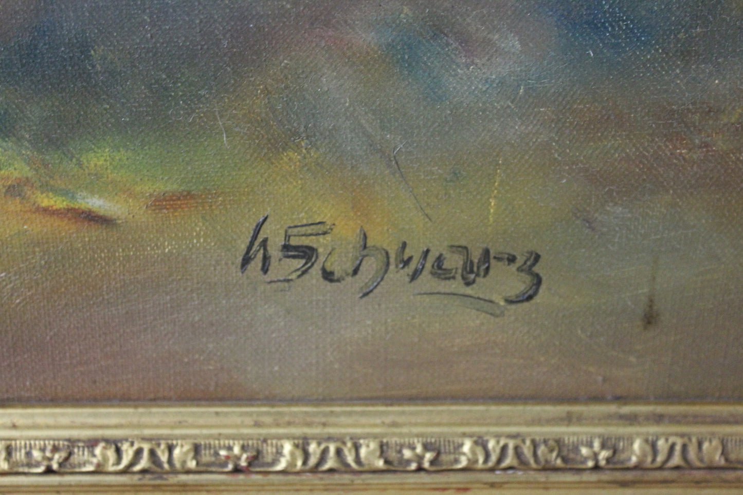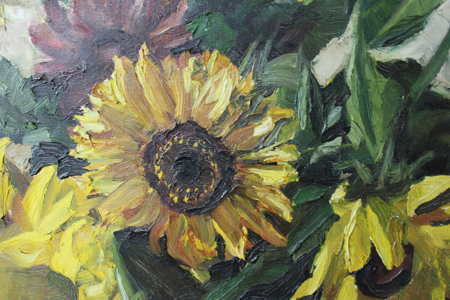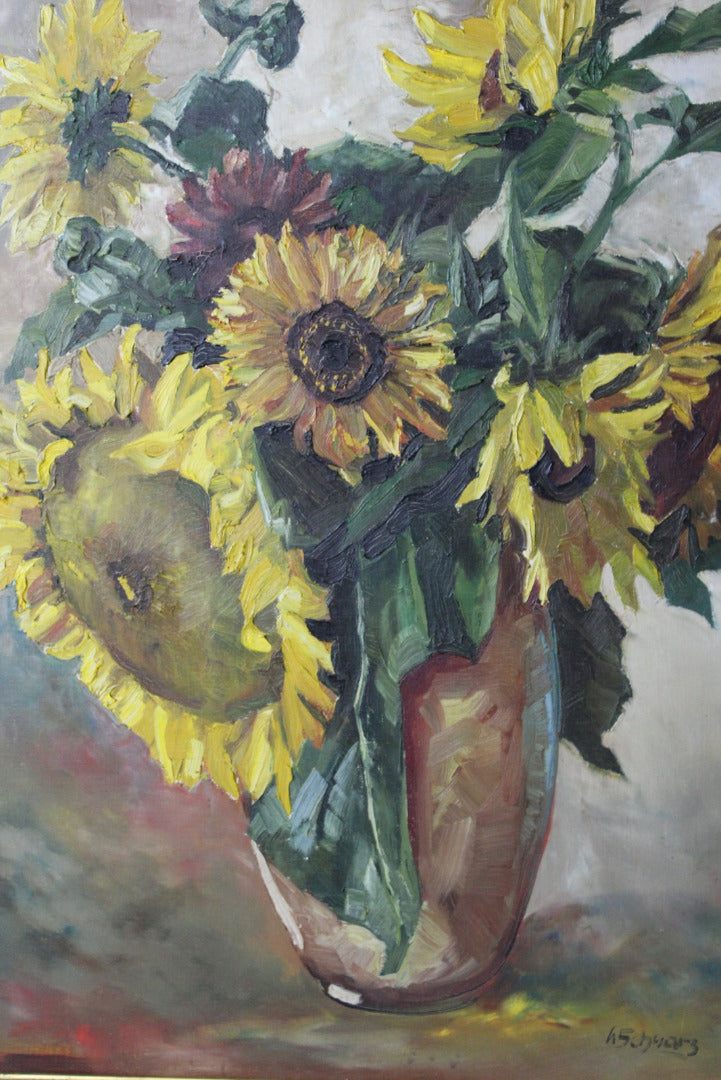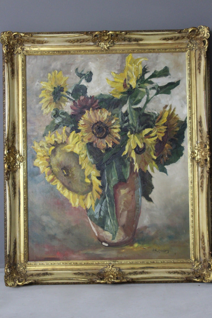 Large still life pictures. 20th Century continental oil on canvas still life of sunflowers in ornate gilt frame.