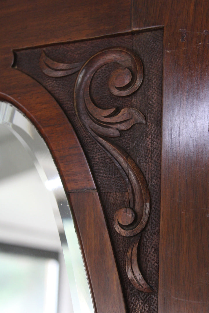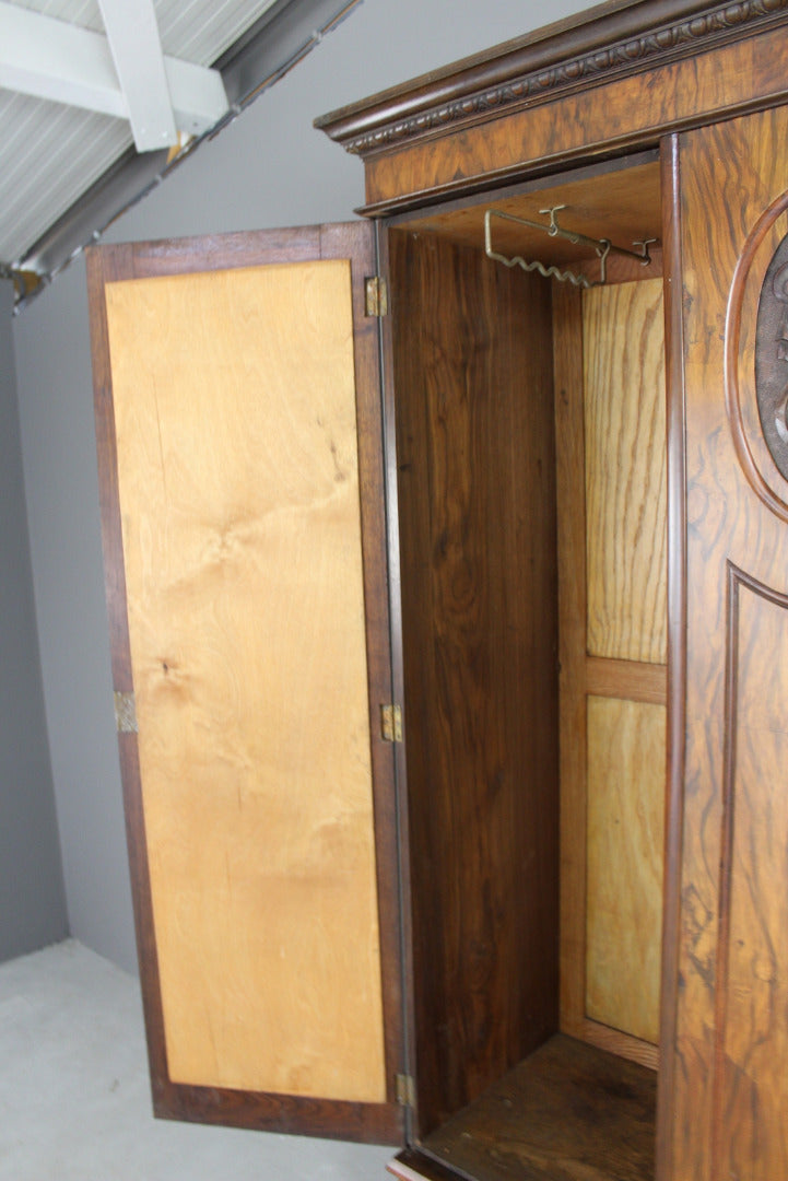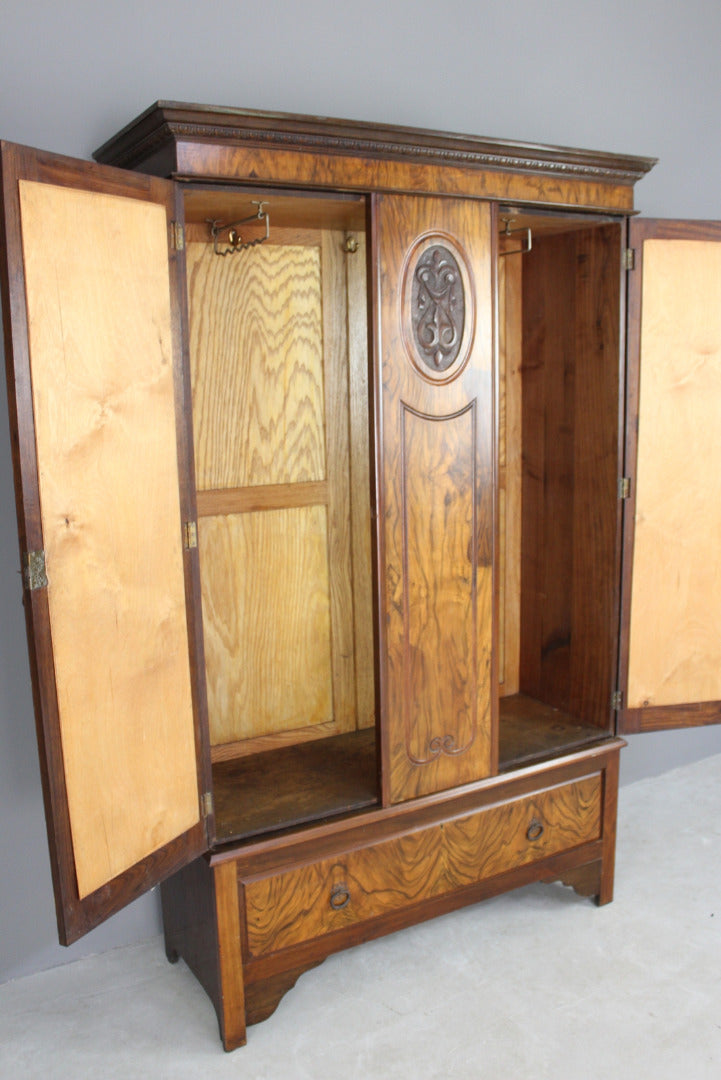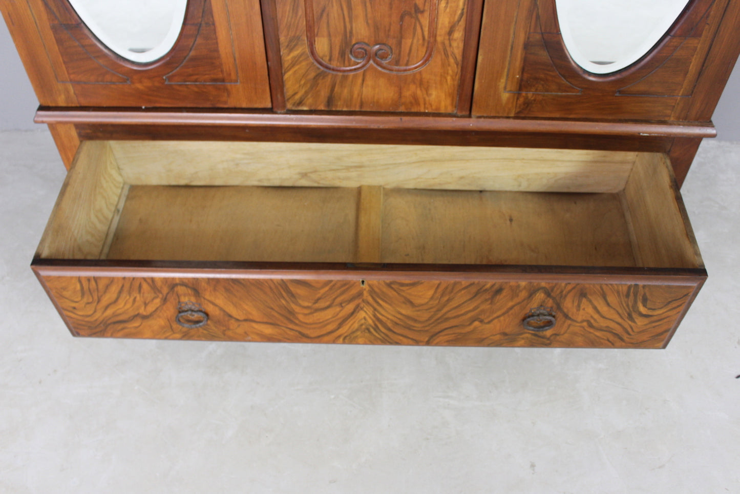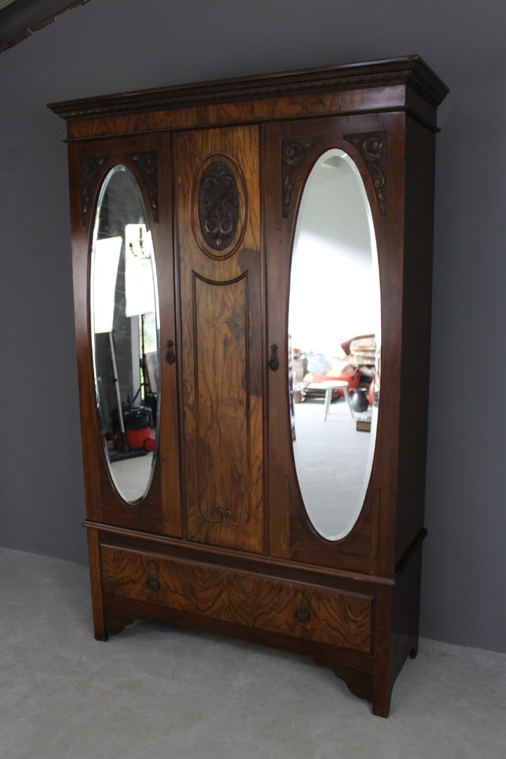 Late Victorian walnut wardrobe. Antique wardrobe, pair of doors with bevel edge oval mirror, extending internal hanging rails that run front to back, single drawer in the base.