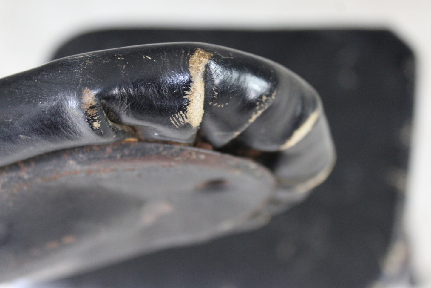 Condition: Lots of age and wear, later black leather covering to the seat and back, missing one of the black rubber feet.