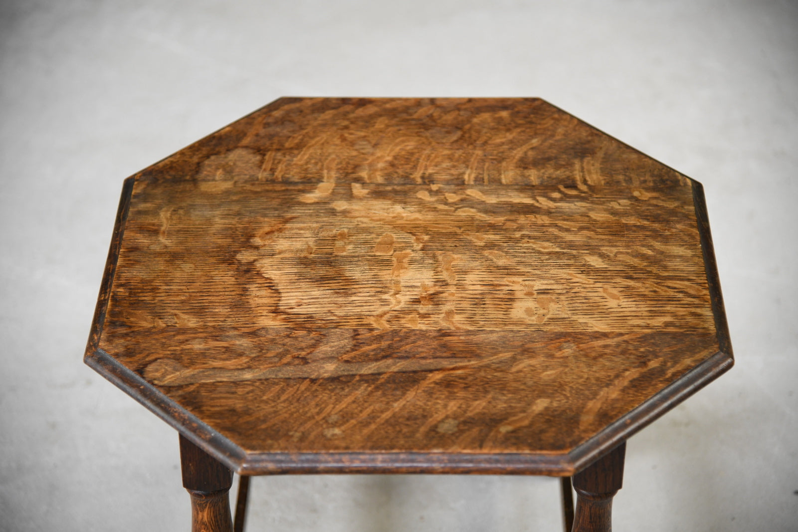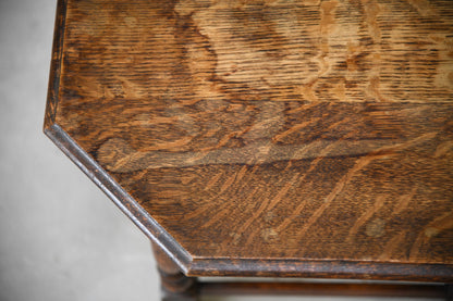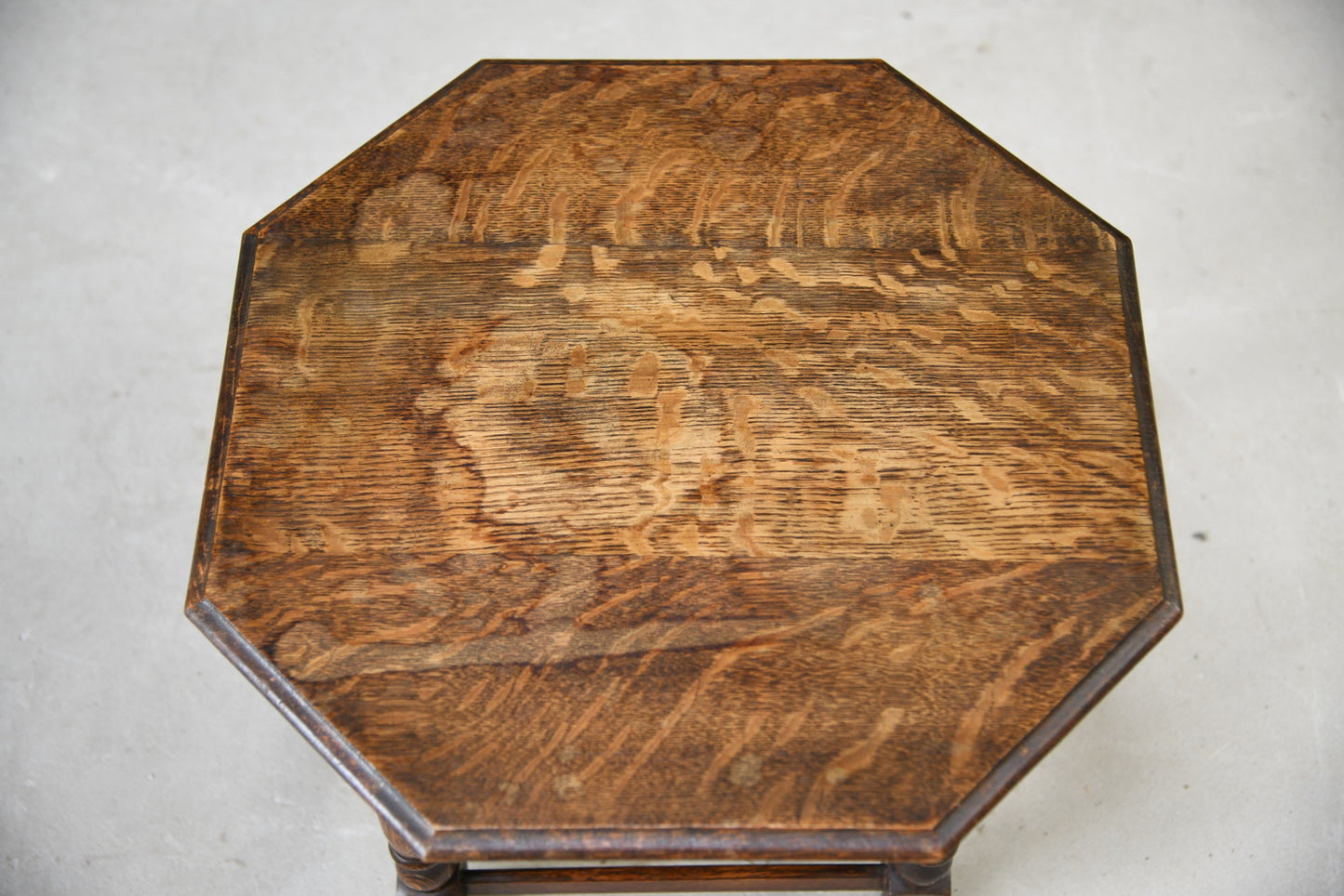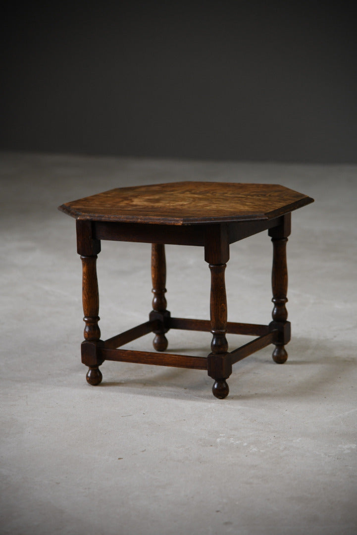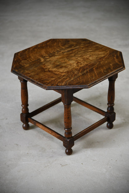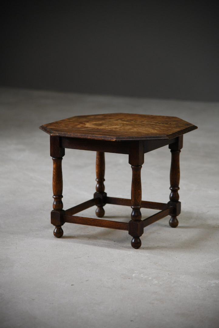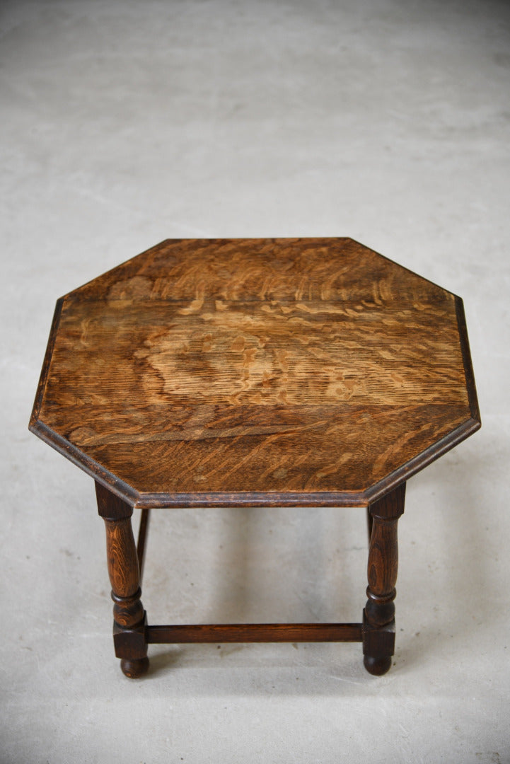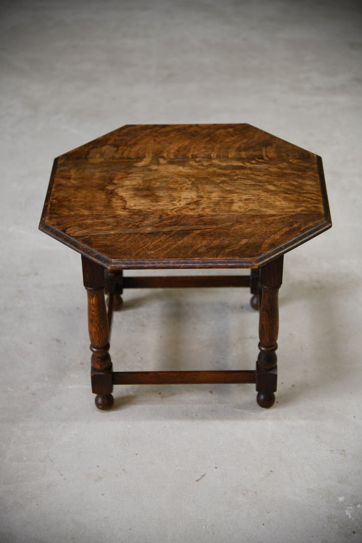 Oak Coffee table. Small solid oak coffee table, solid wood octagonal top with moulded edge on turned legs, joined by square stretchers.