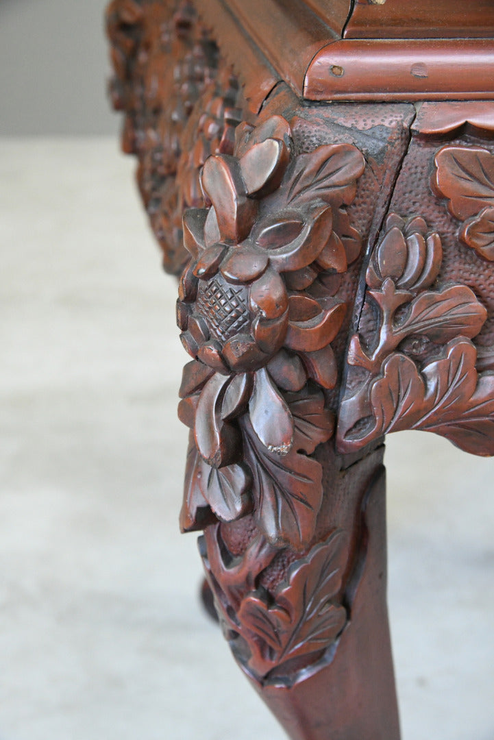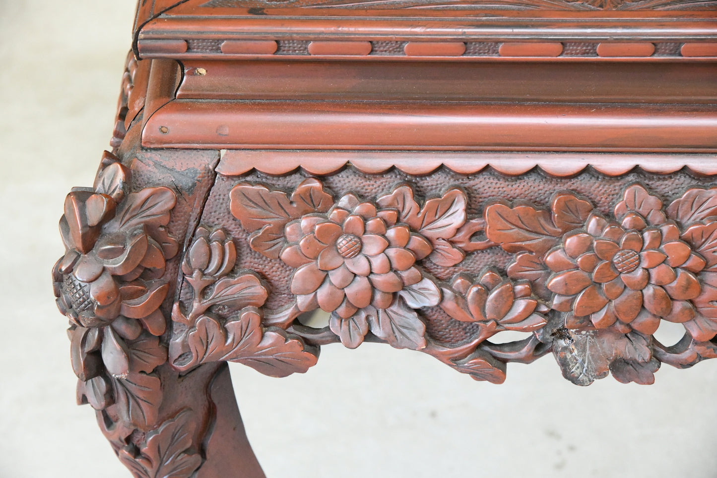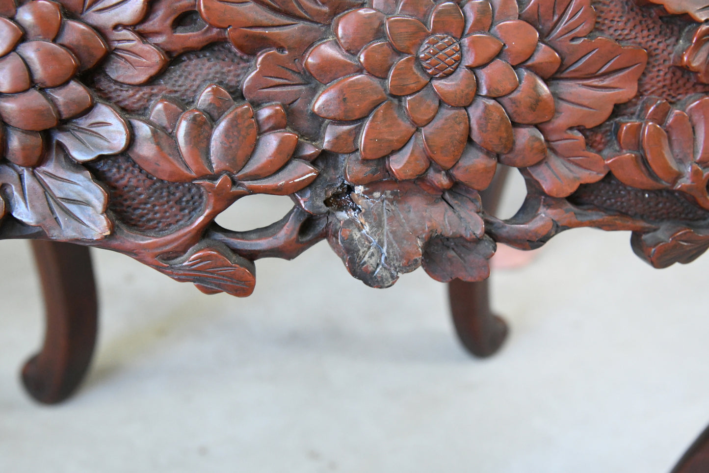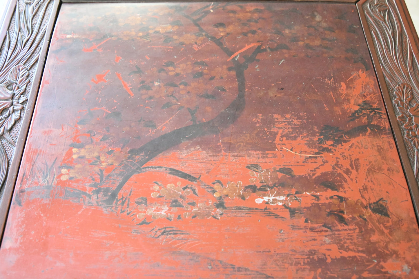 20th Century Oriental red lacquer square section stand or table, the top painted with a blossoming tree and within an iris carved surround and frieze on cabriole legs