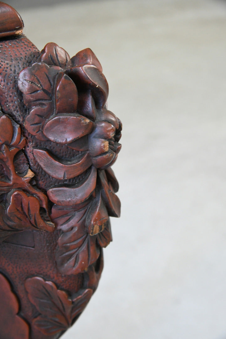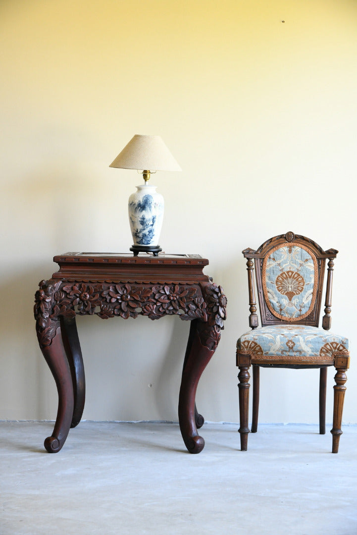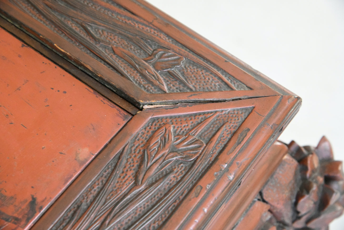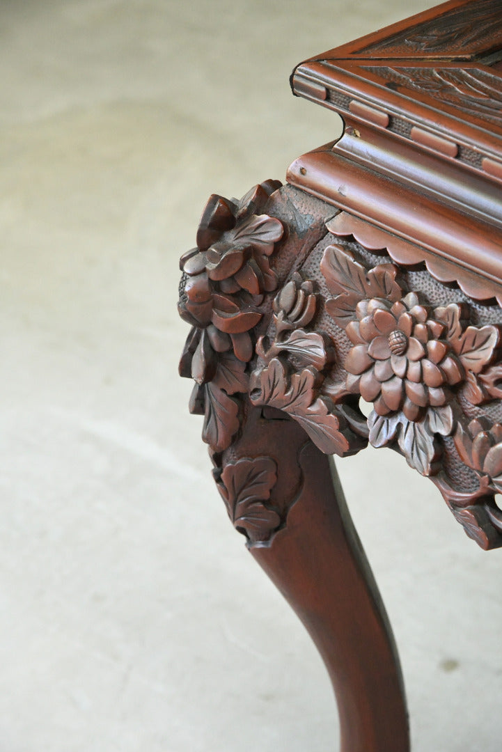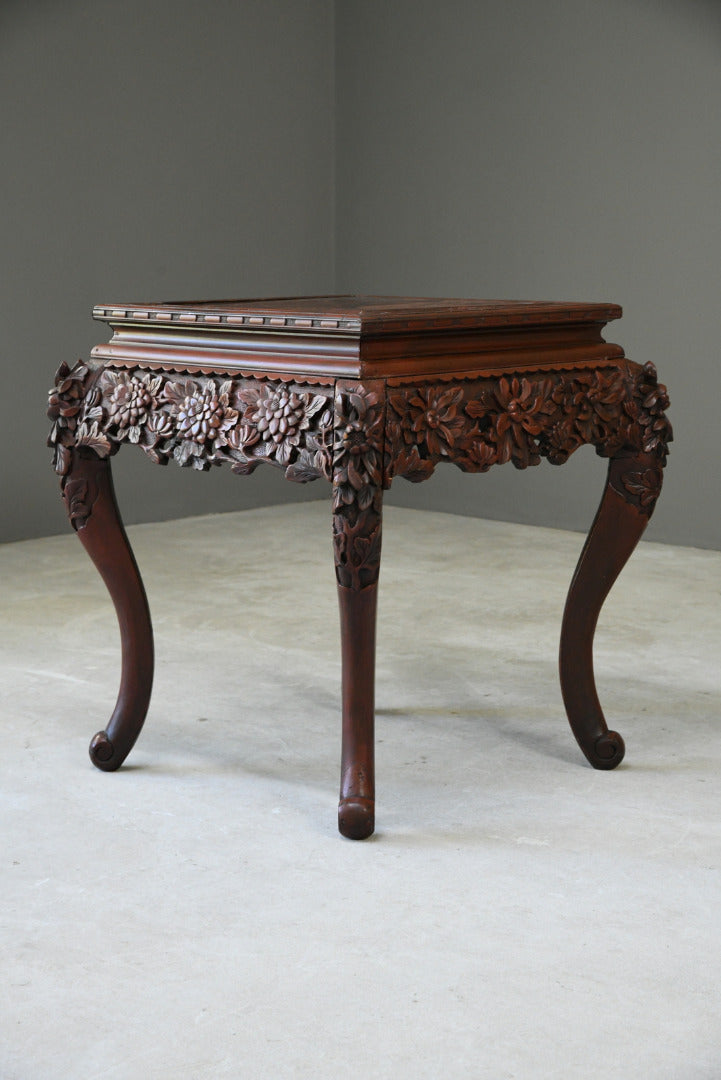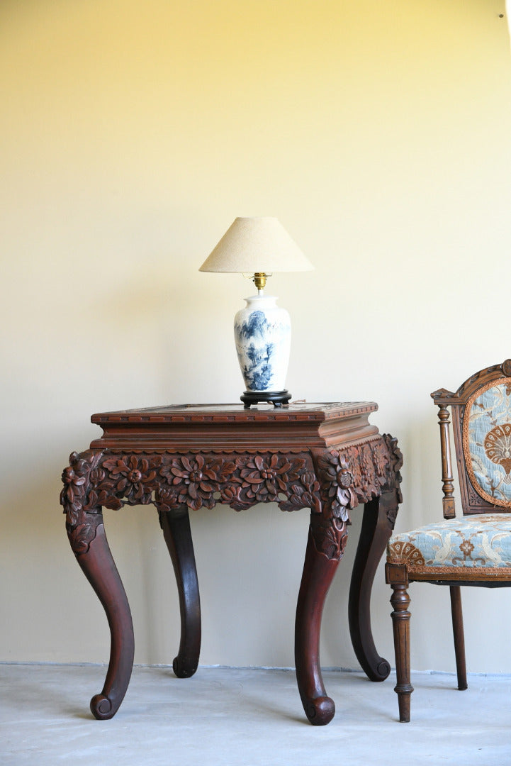 20th Century Oriental red lacquer square section stand or table, the top painted with a blossoming tree and within an iris carved surround and frieze on cabriole legs