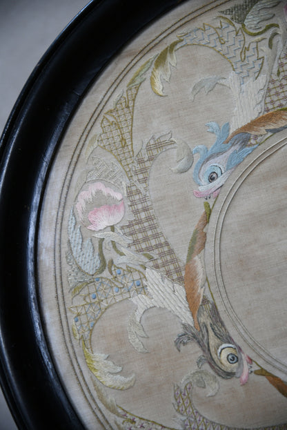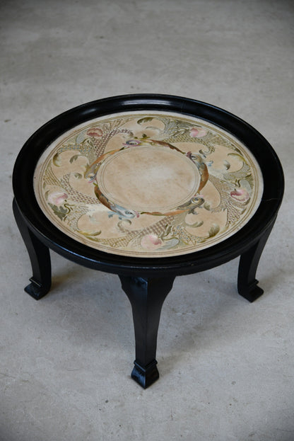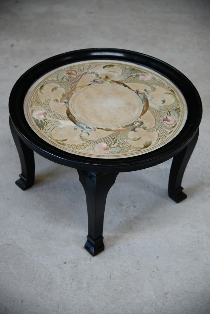 Oriental Coffee Table. Early 20th Century small round coffee table, ebonised frame with glazed top above a circular silk embroidered panel decorated with stylised fish and foliage, on cabriole legs.