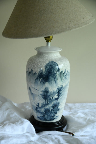 Oriental Lamp. Oriental style lamp, blue and white with crackle glaze & on wooden stand. Please note the shade is not included.