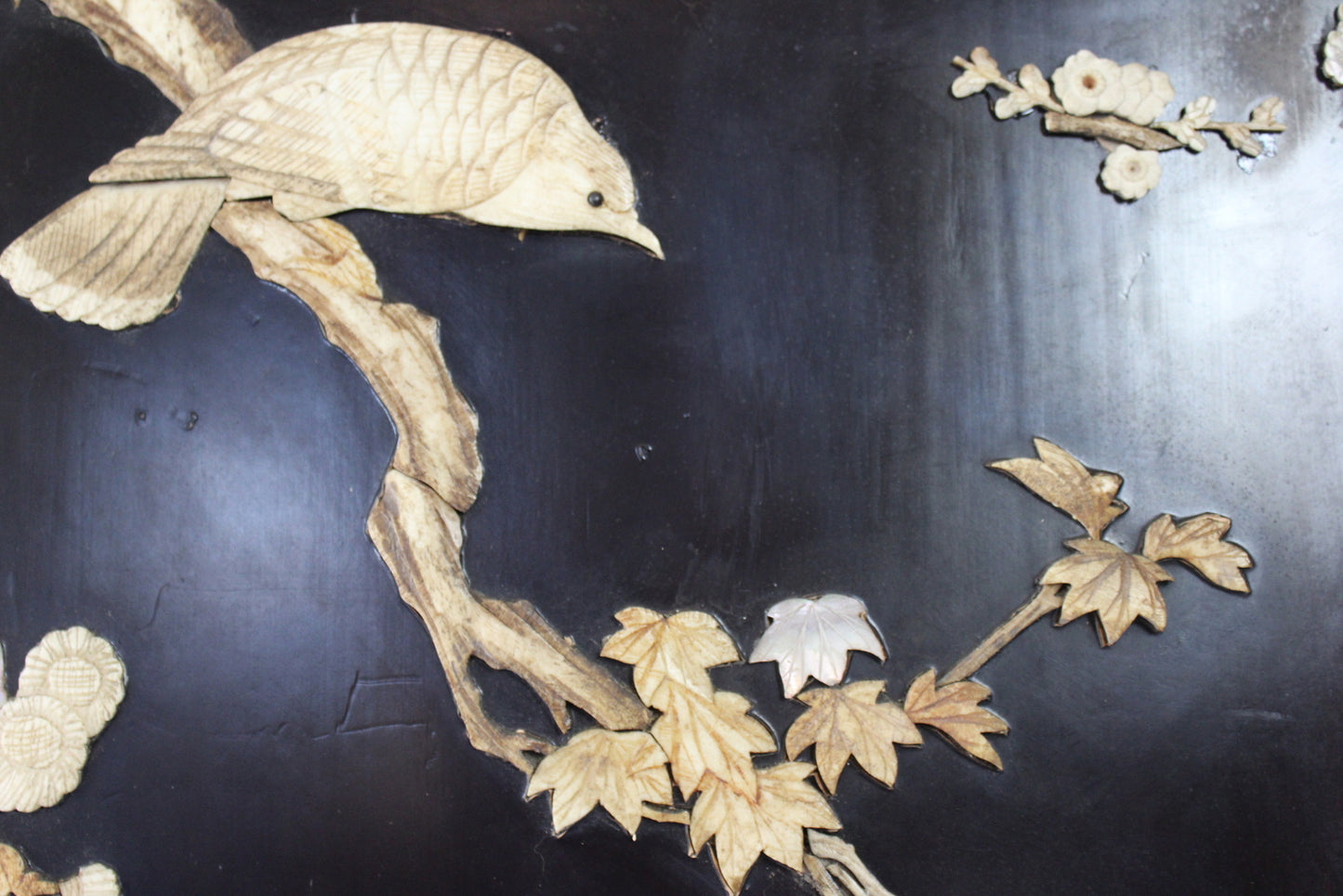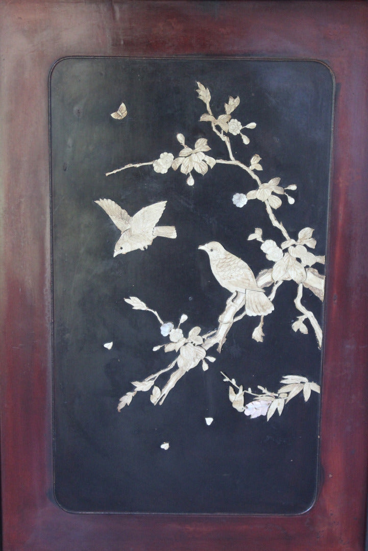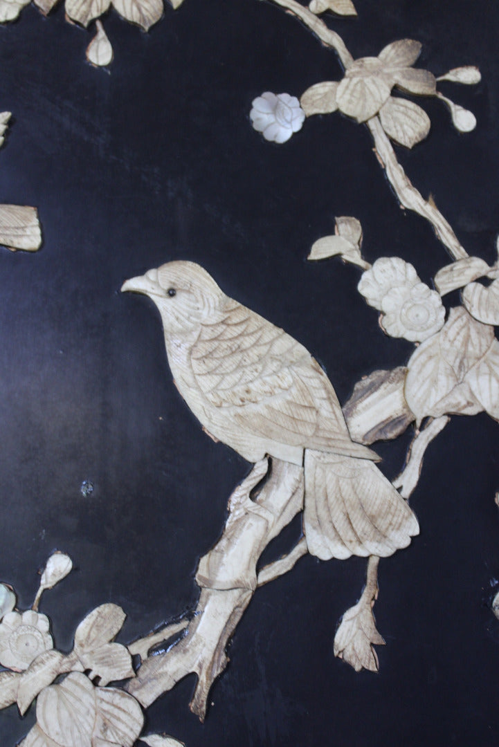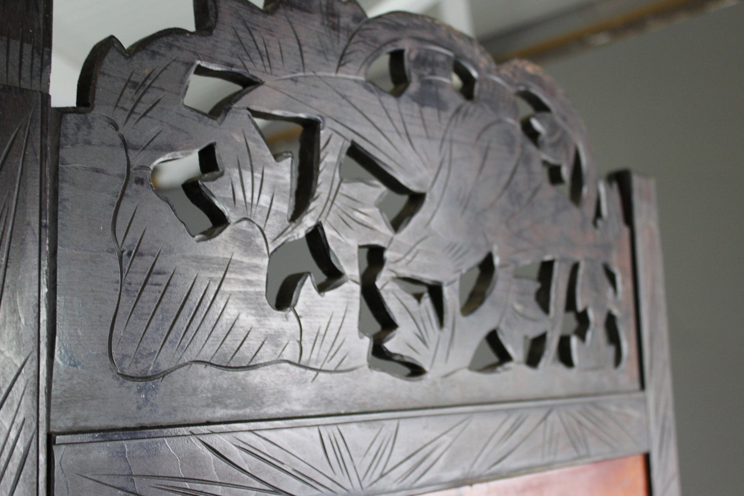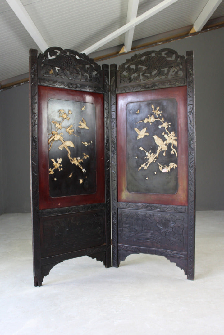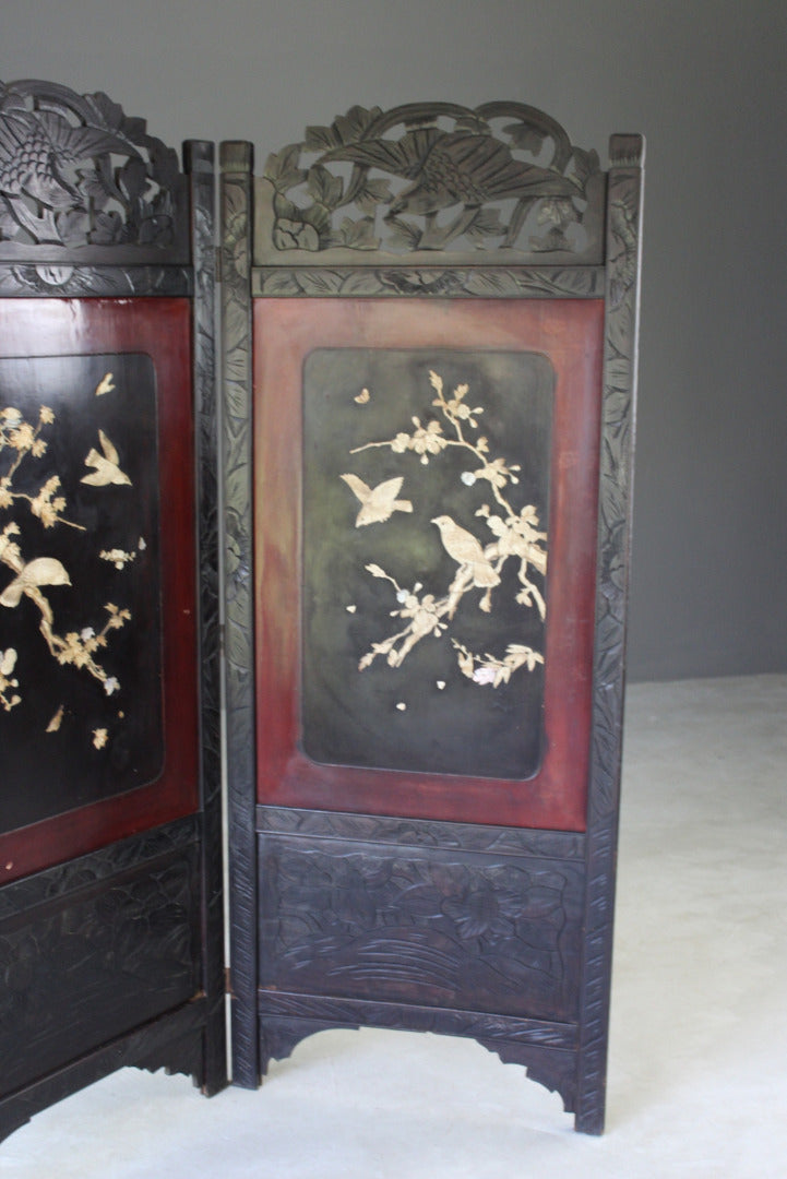 Oriental screen. Two panel folding screen with ebonised pierced frame, panels of carved bone and mother of pearl decoration of trees and birds.