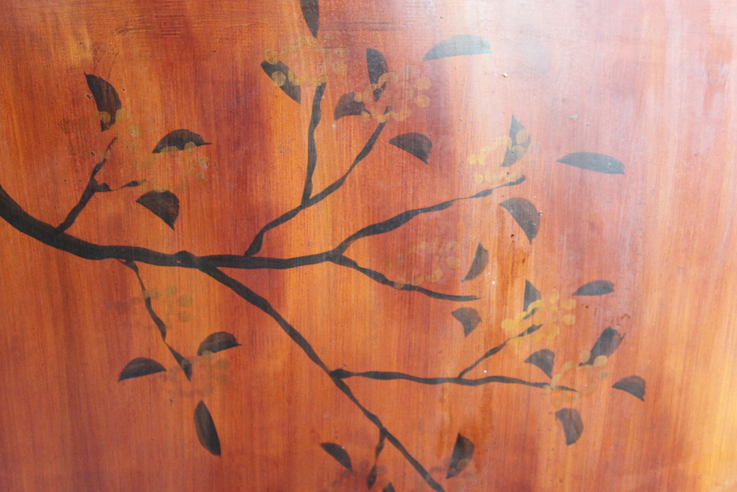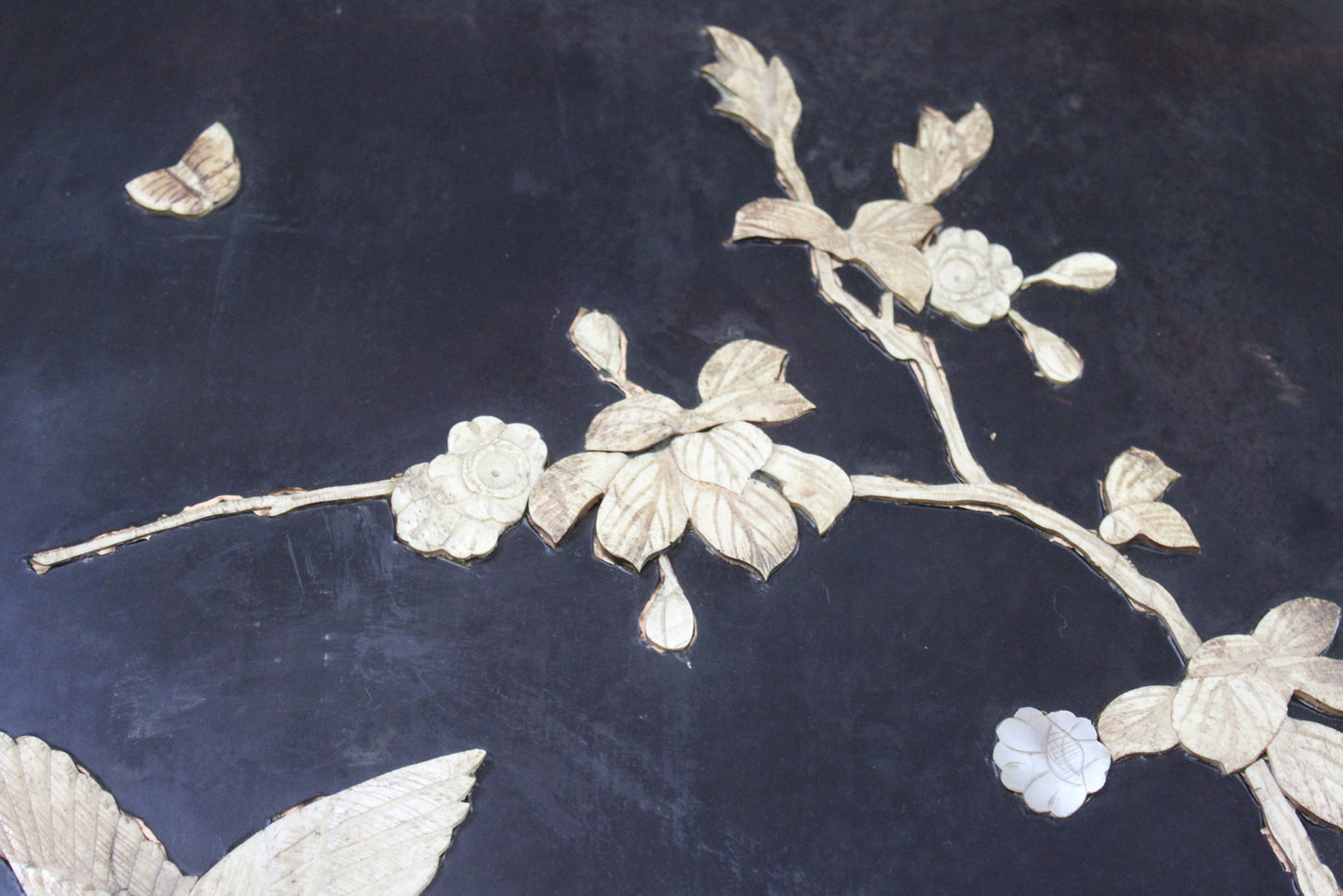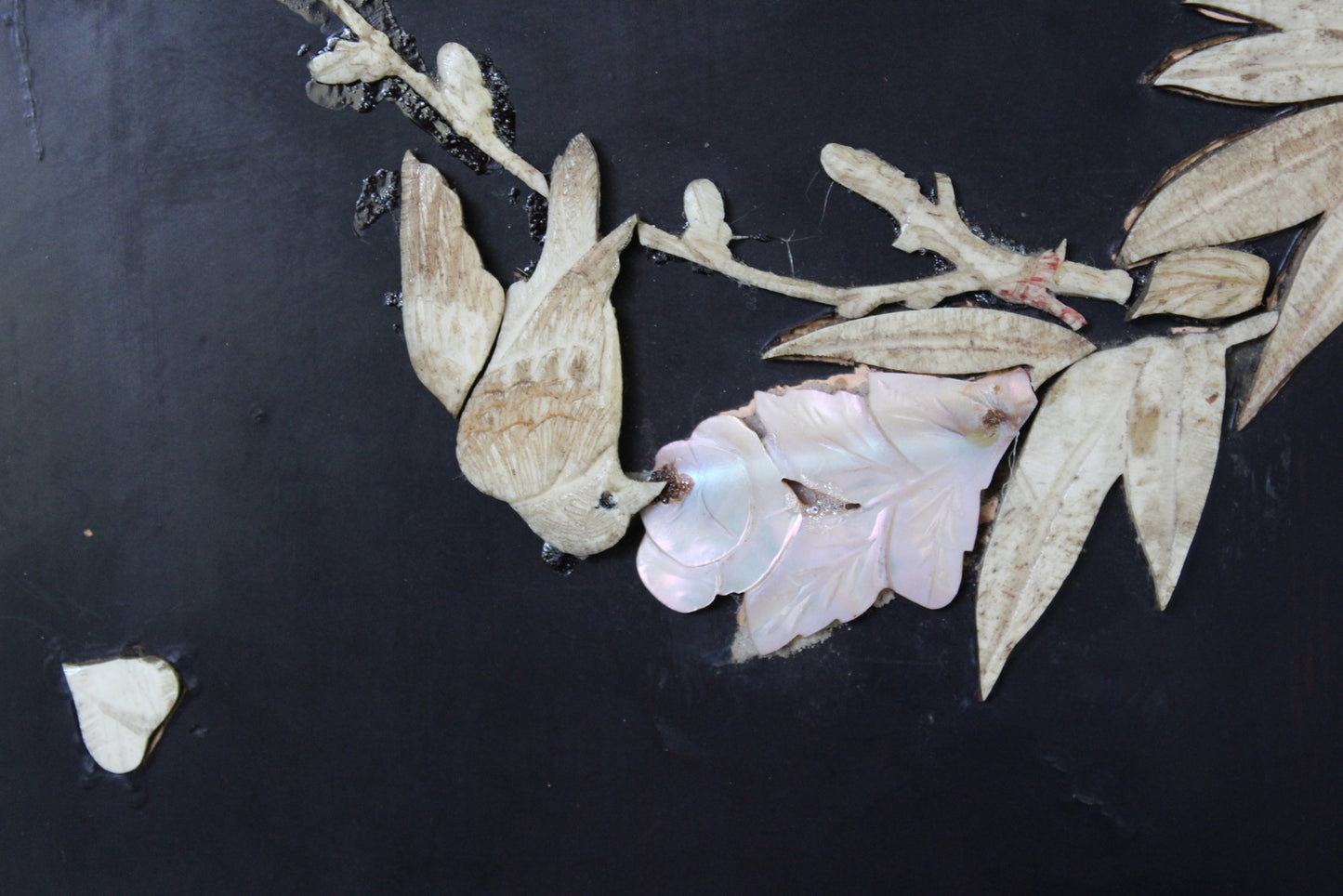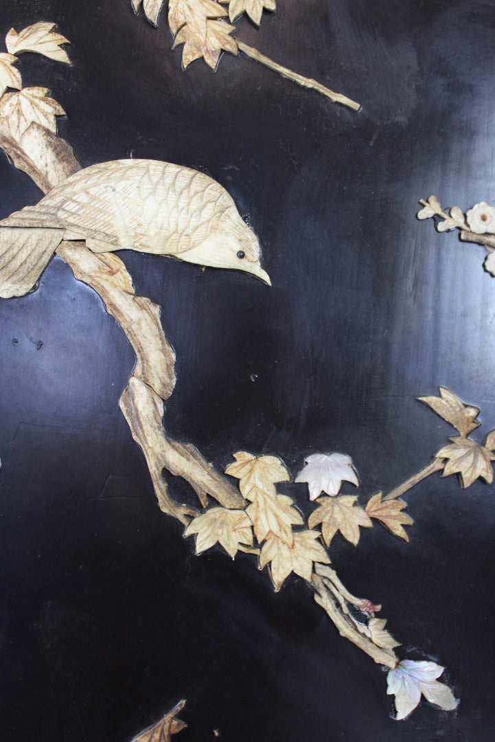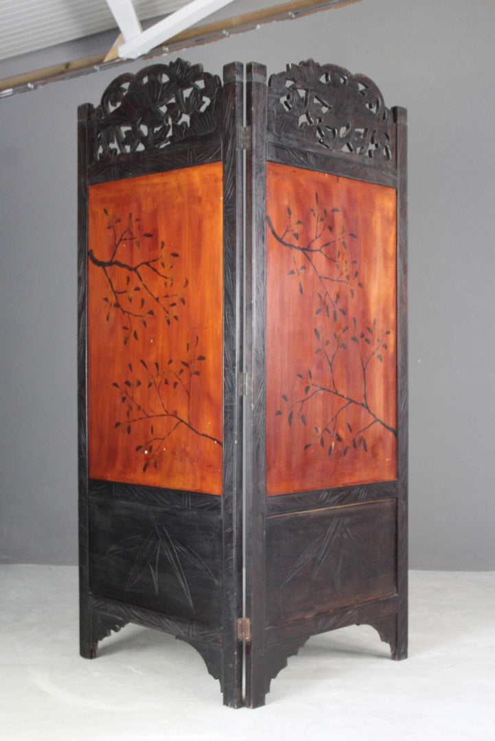Oriental screen. Two panel folding screen with ebonised pierced frame, panels of carved bone and mother of pearl decoration of trees and birds.