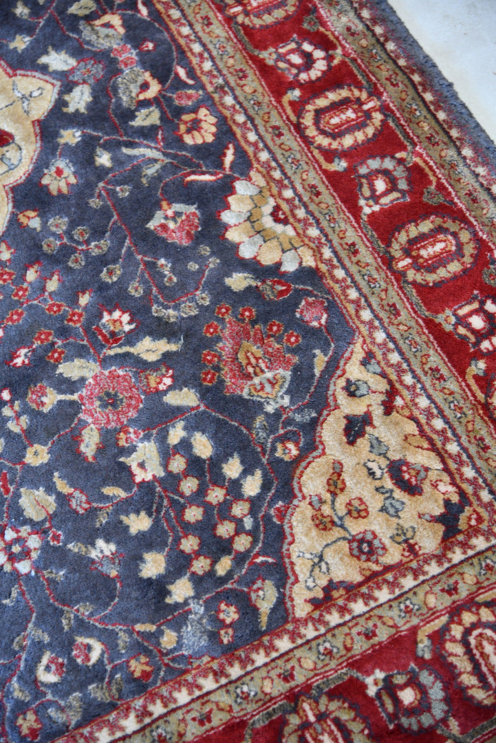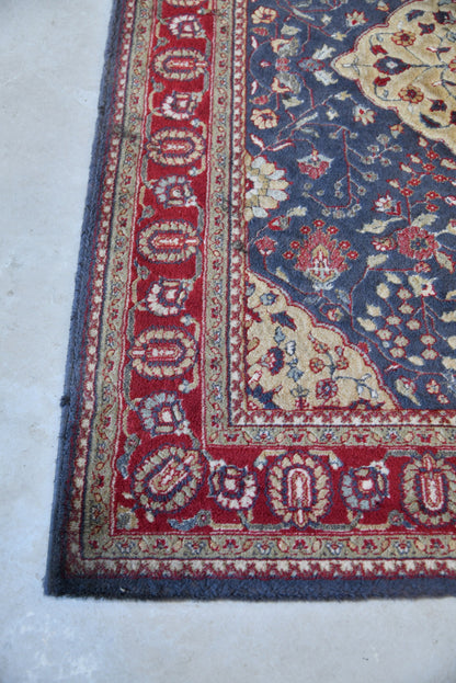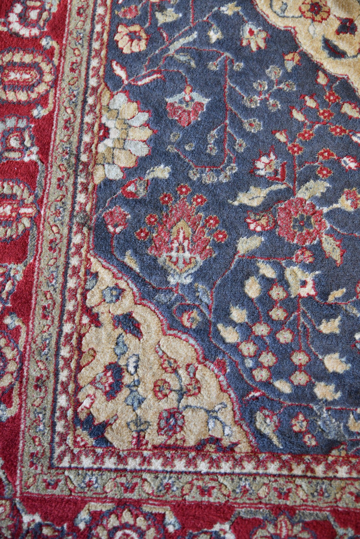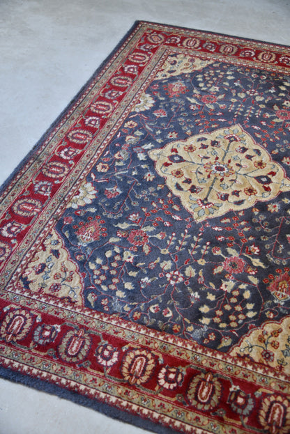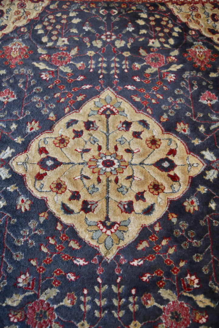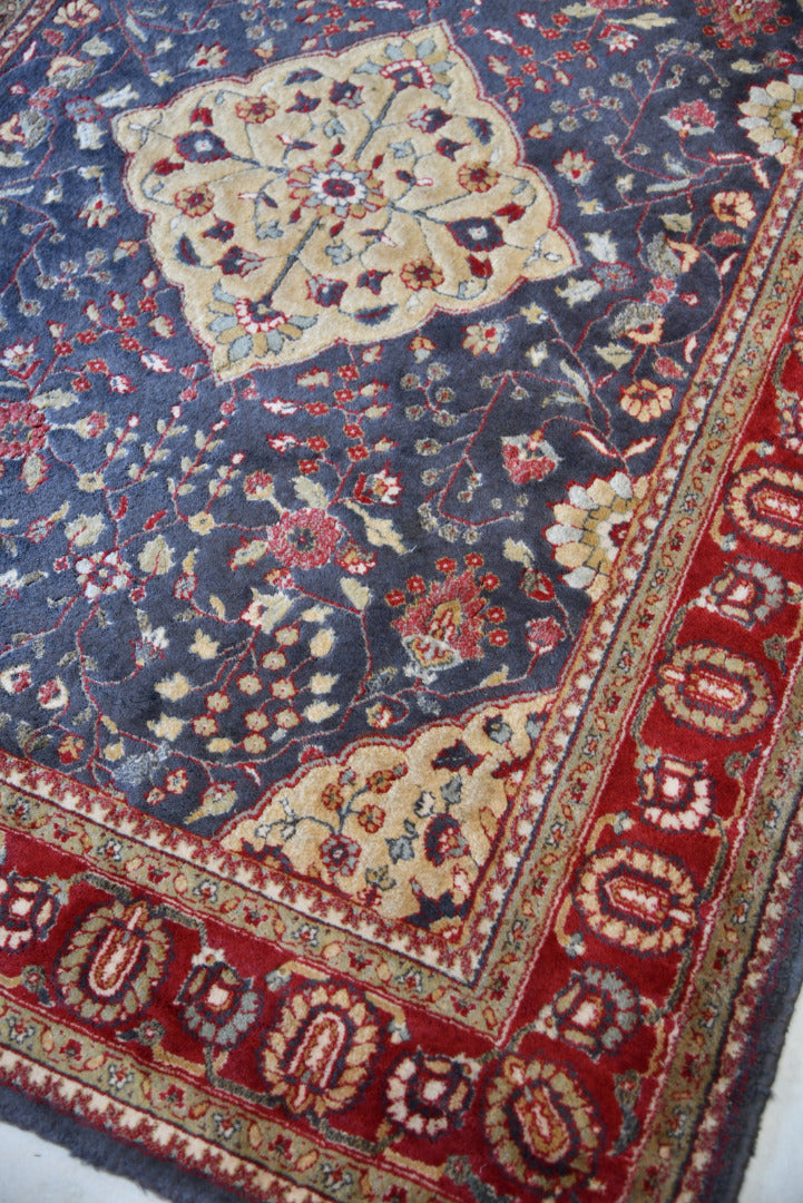 Oriental style wool rug. 20th century wool rug with central flower filled medallion on a flower filled blue ground with spandrels within multiple borders.