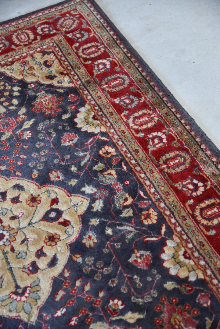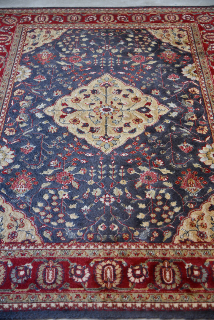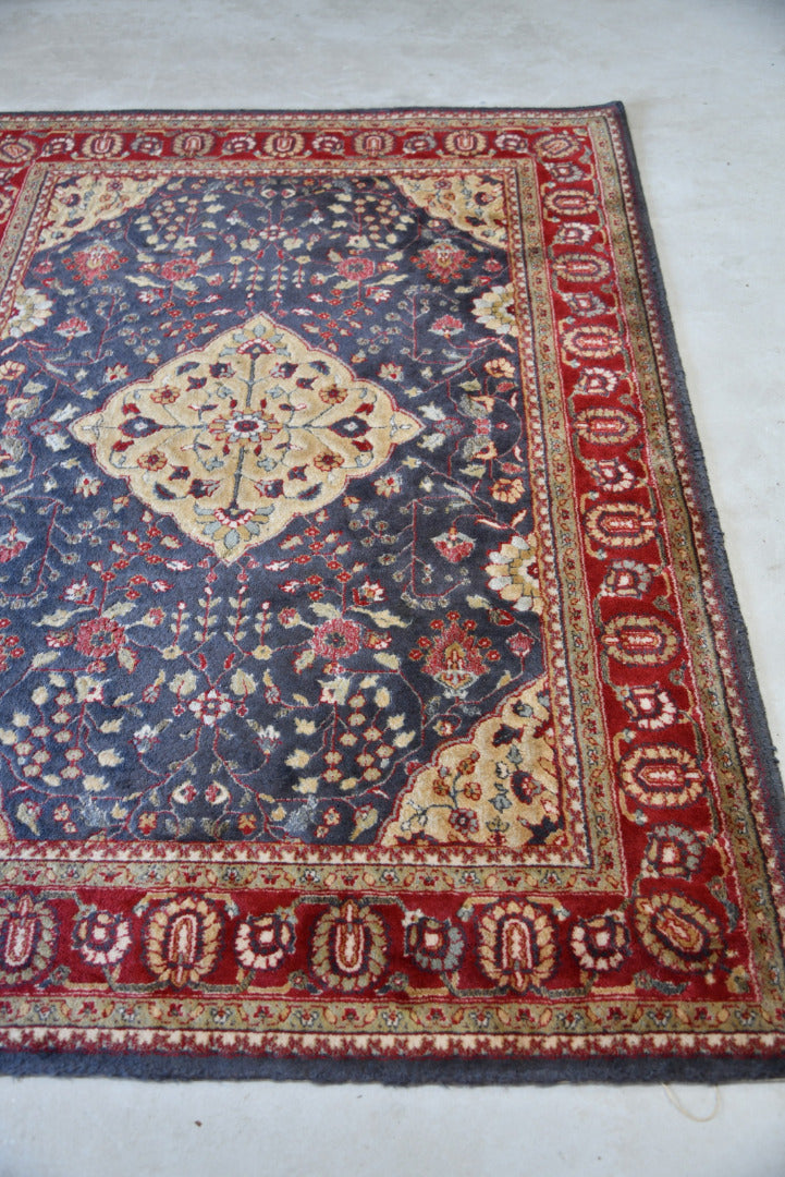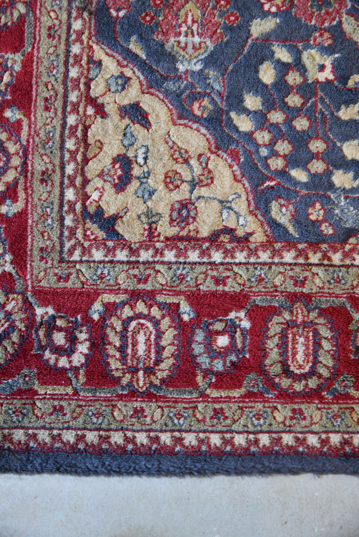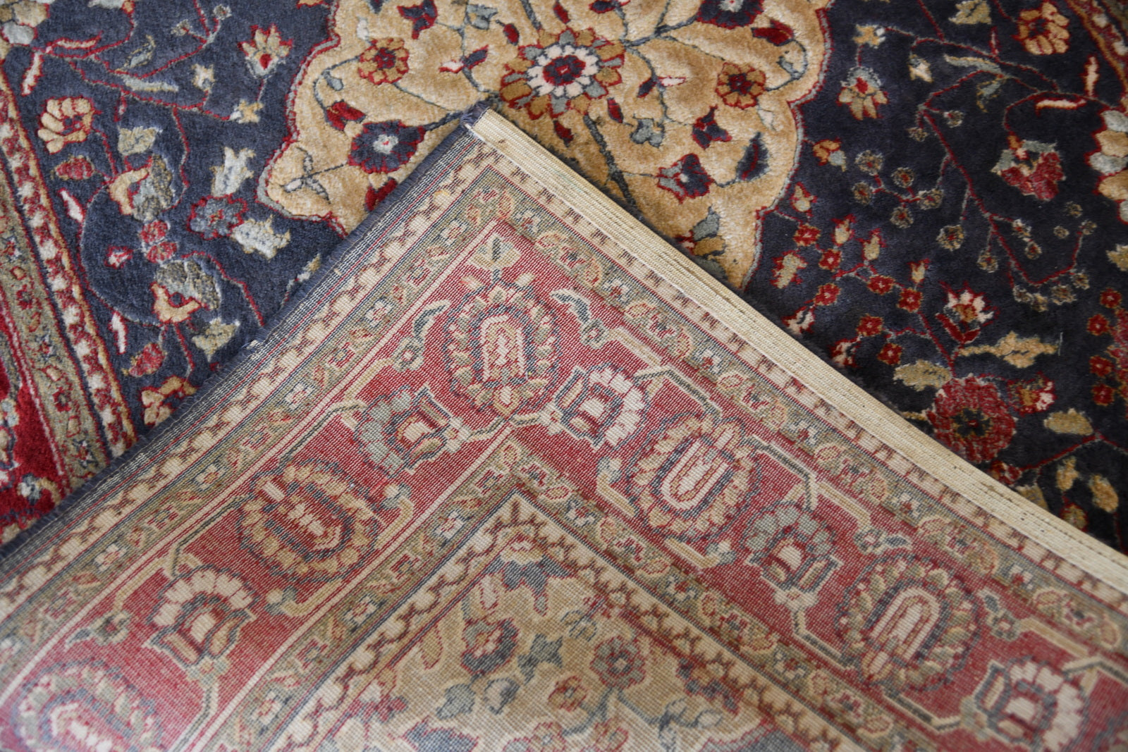 Oriental style wool rug. 20th century wool rug with central flower filled medallion on a flower filled blue ground with spandrels within multiple borders.