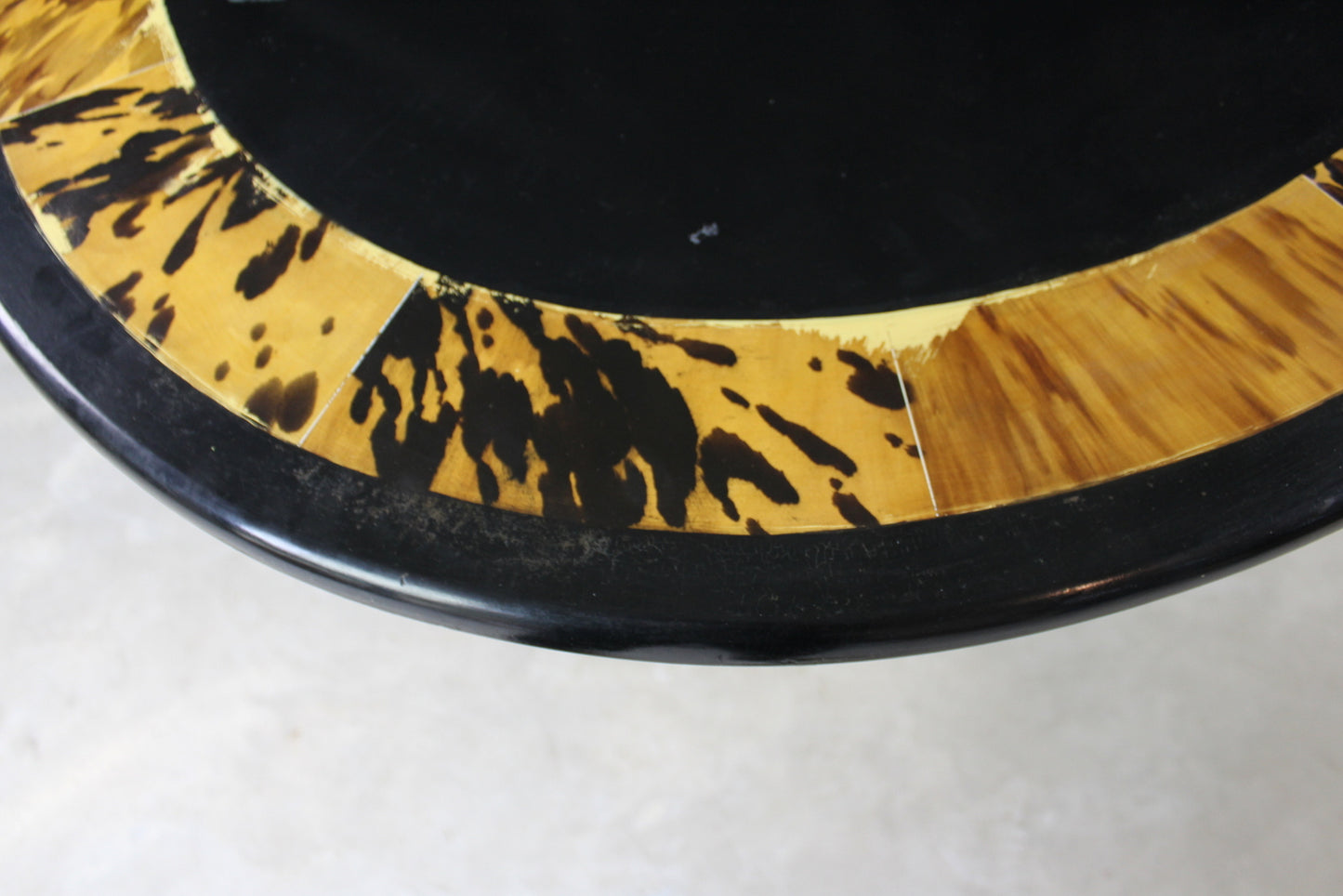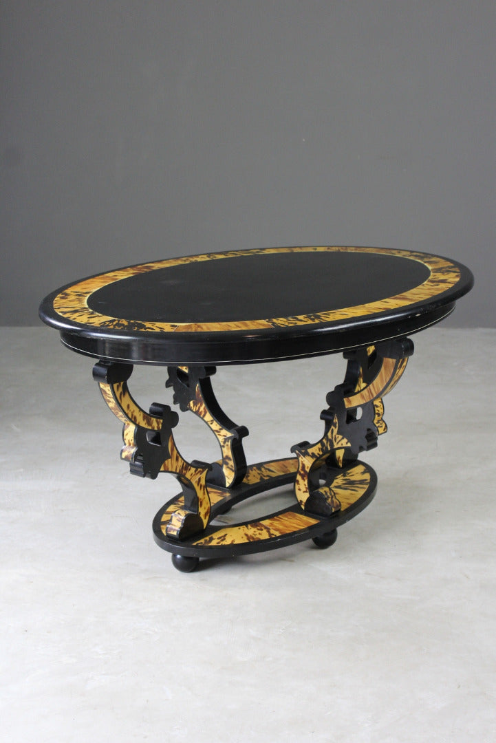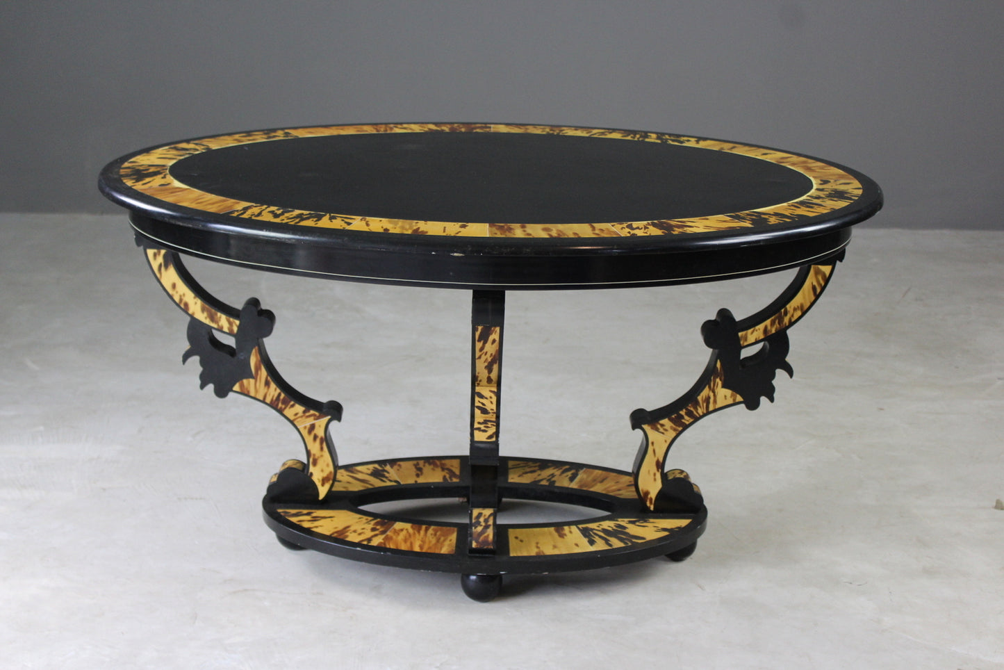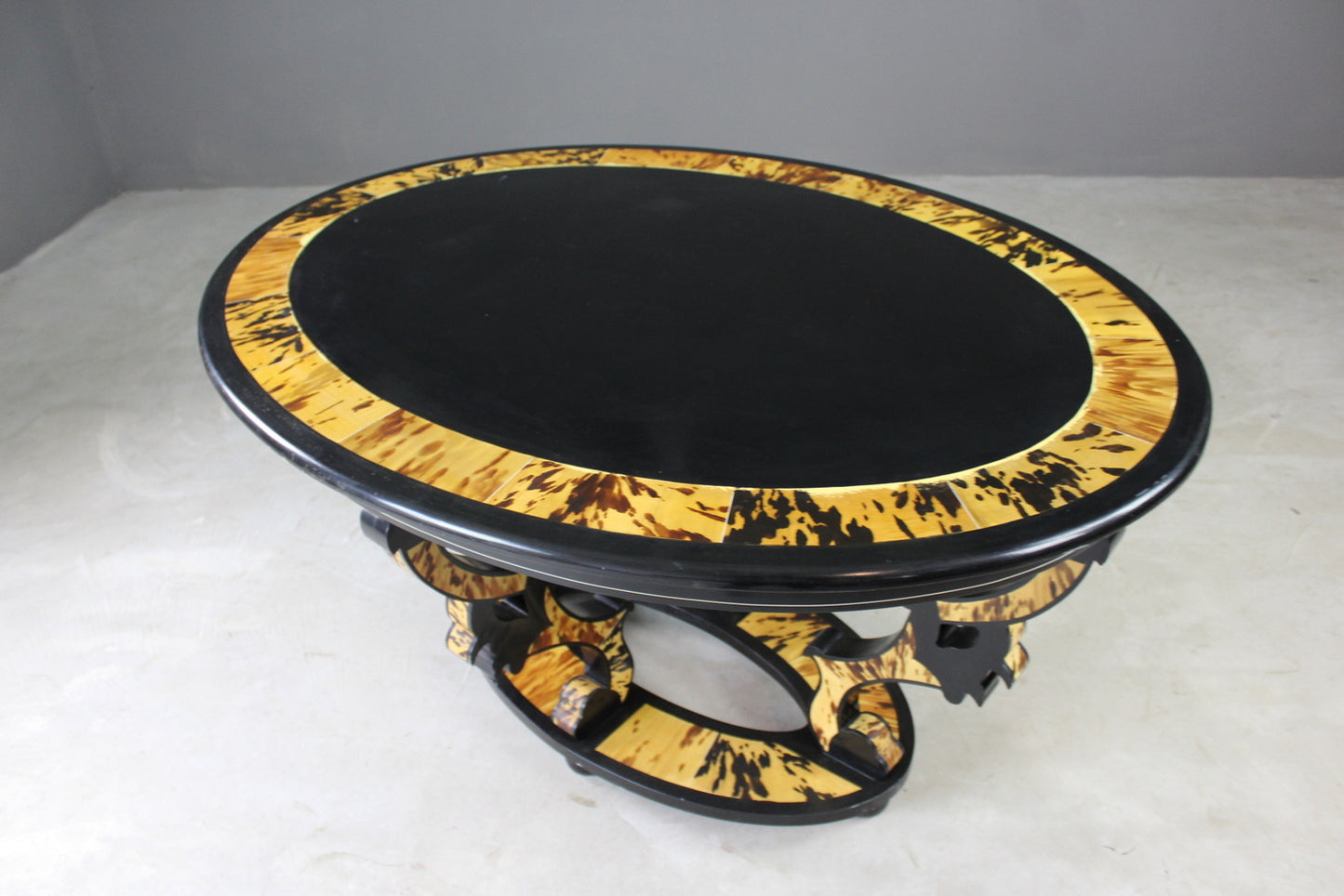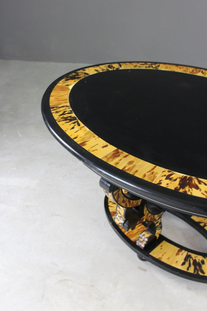 Oval Black & Tortoiseshell Effect Centre Table. Black lacquer finish with tortoiseshell effect border and finish to the shaped legs and base.