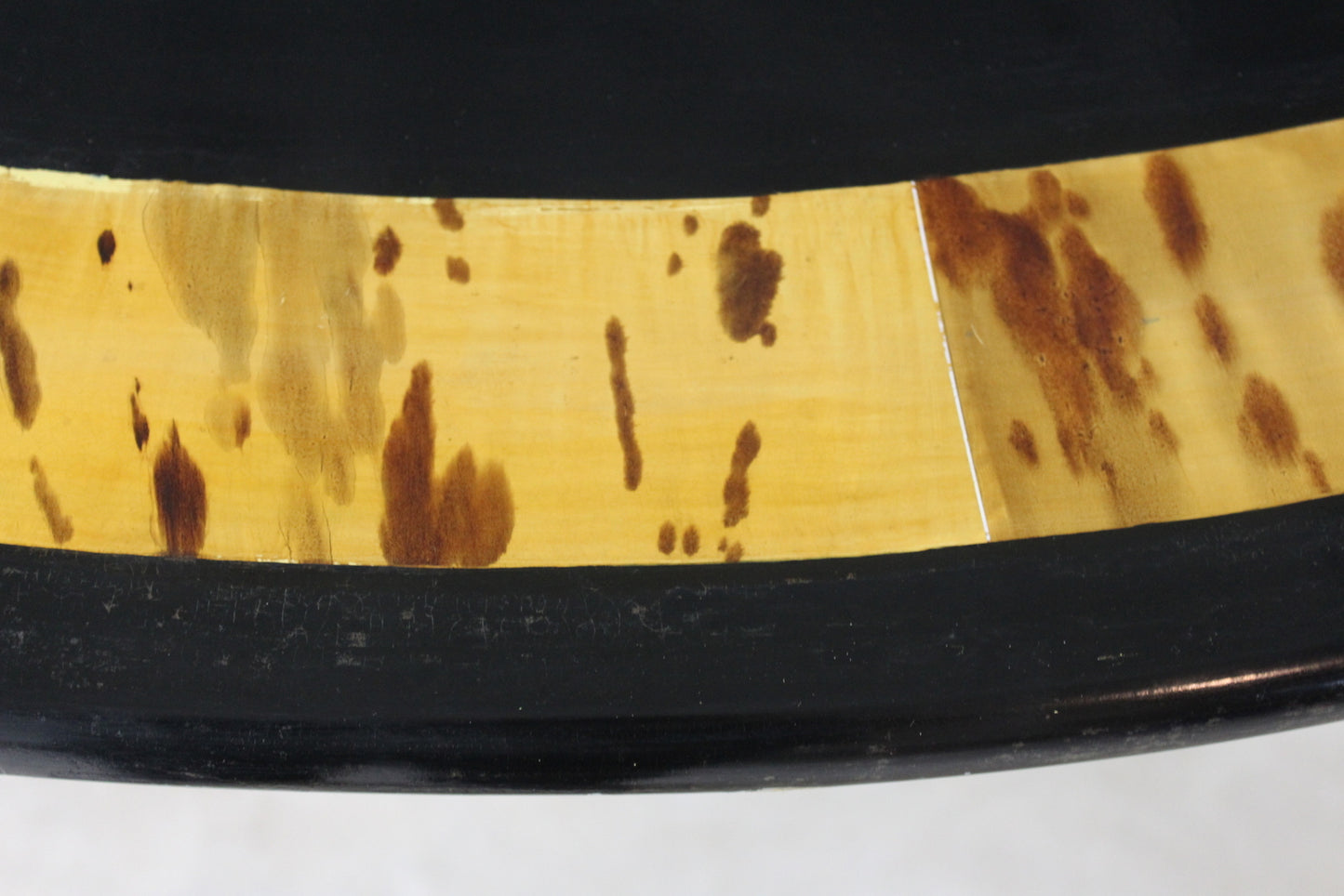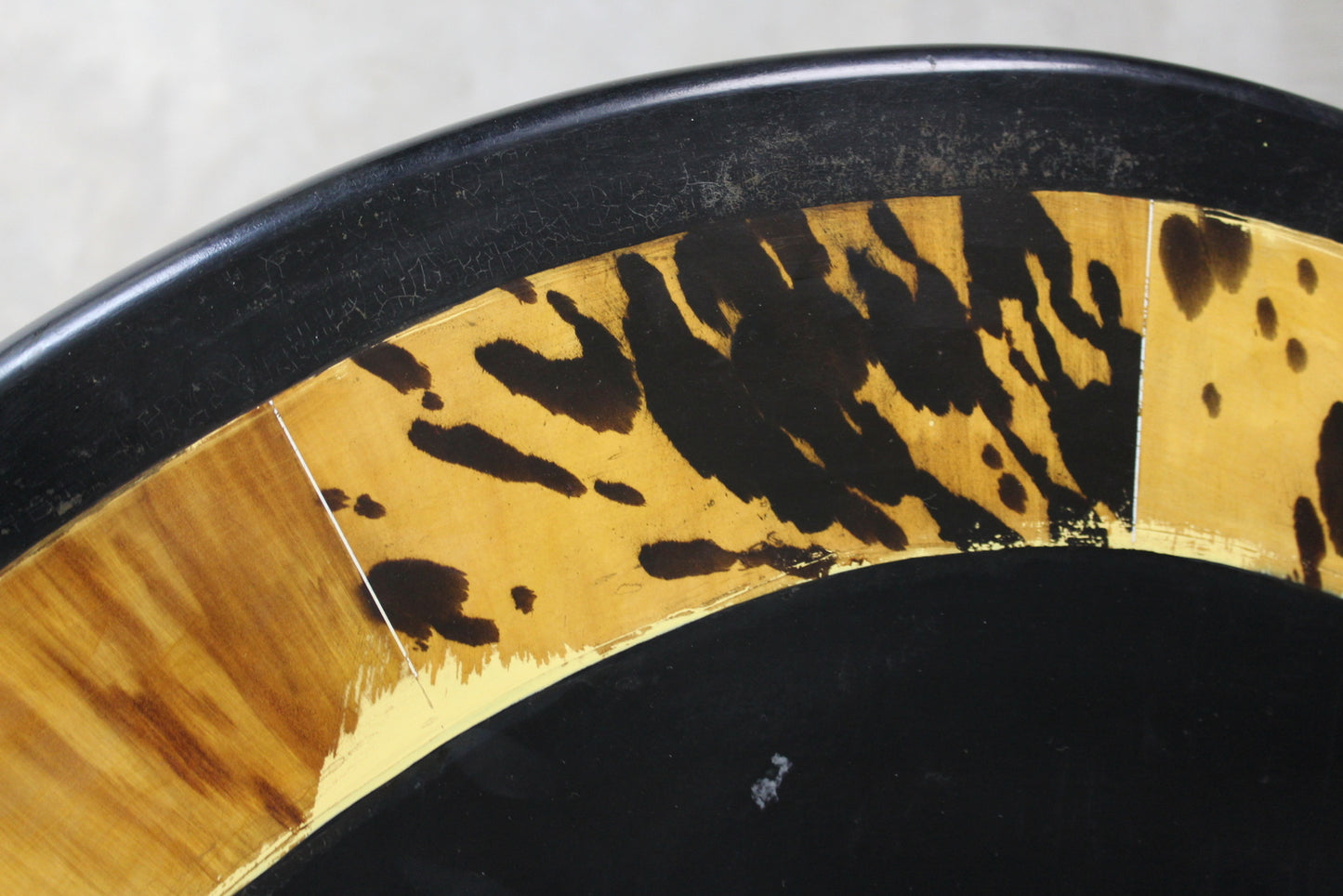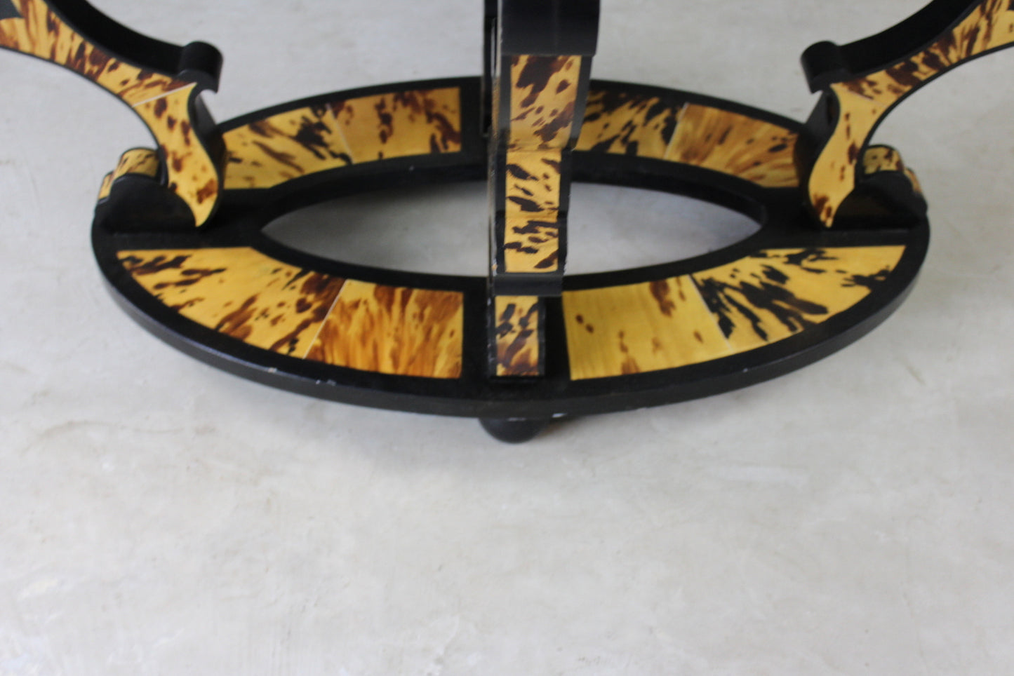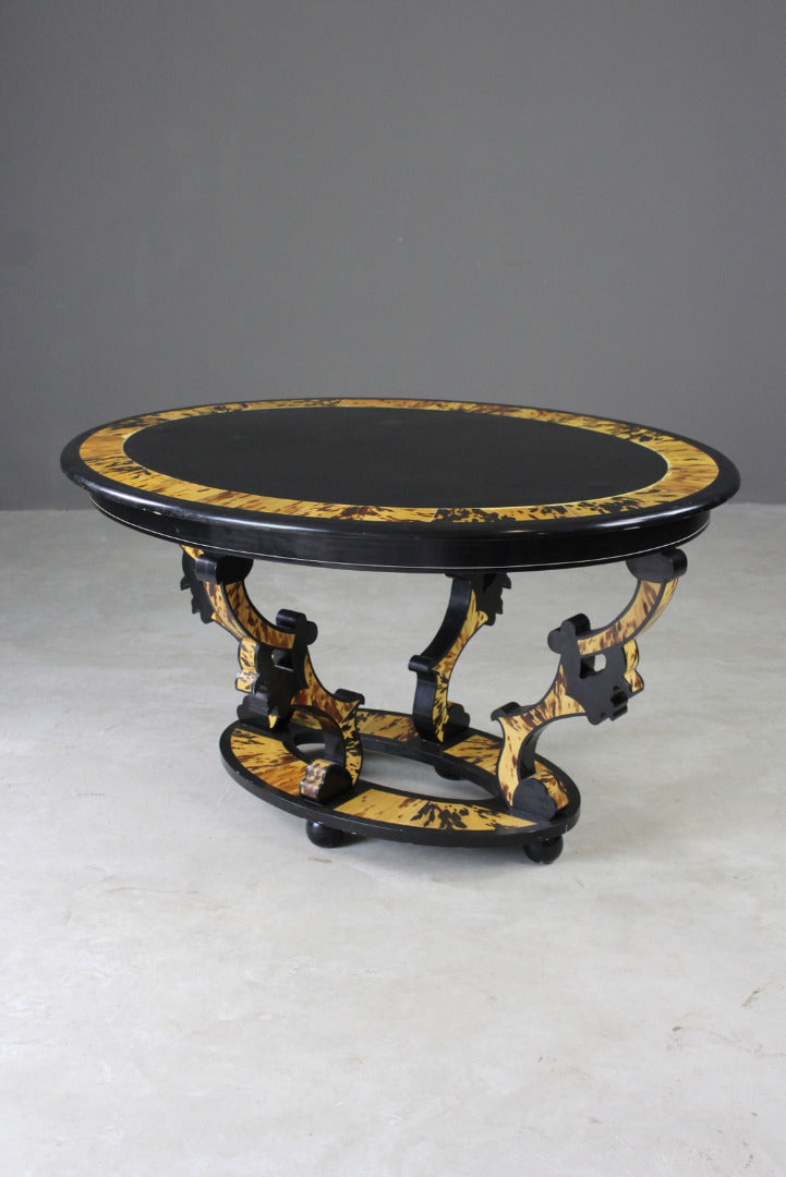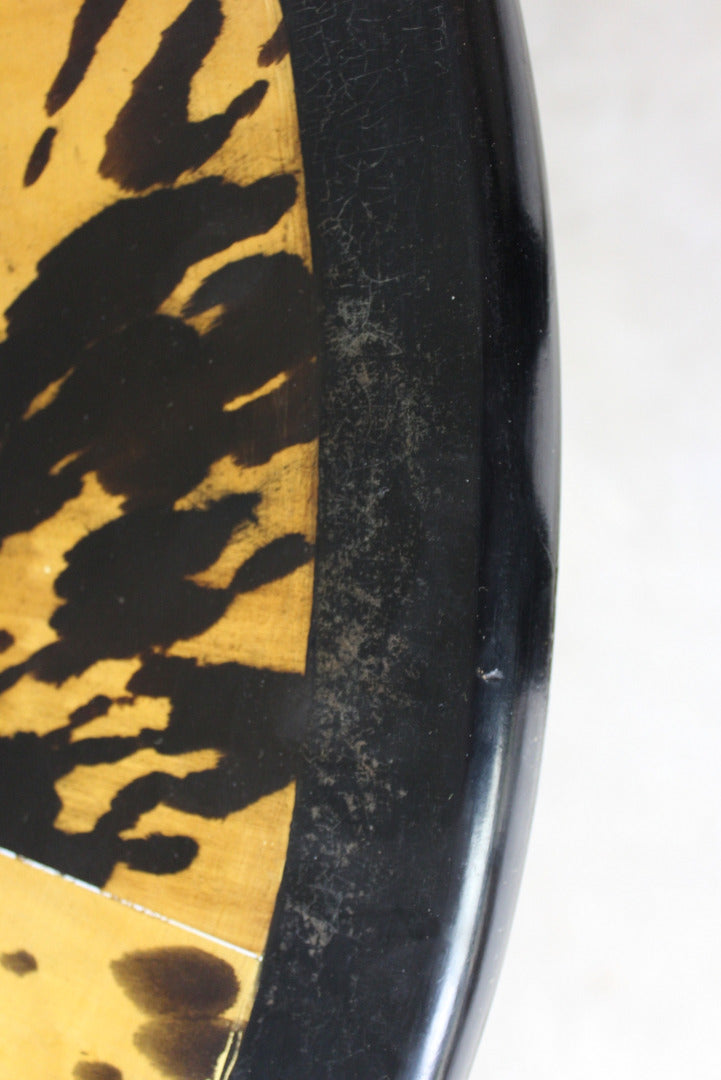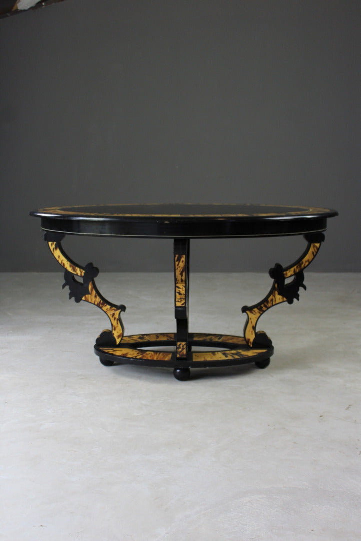Oval Black & Tortoiseshell Effect Centre Table. Black lacquer finish with tortoiseshell effect border and finish to the shaped legs and base.