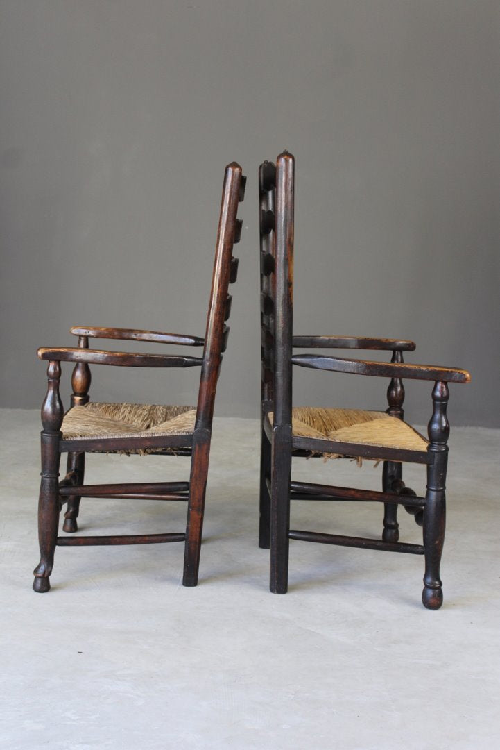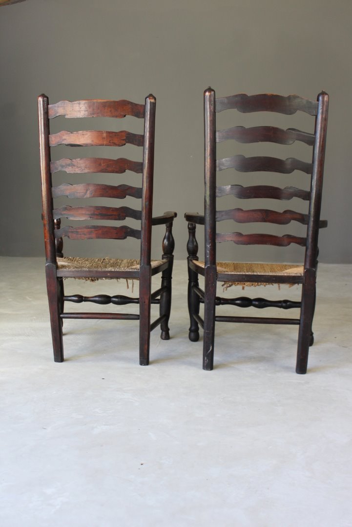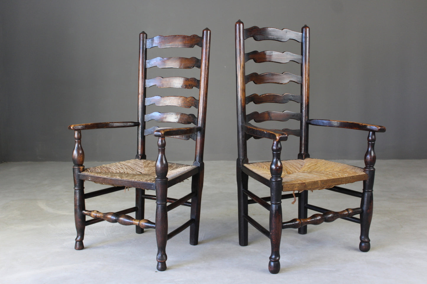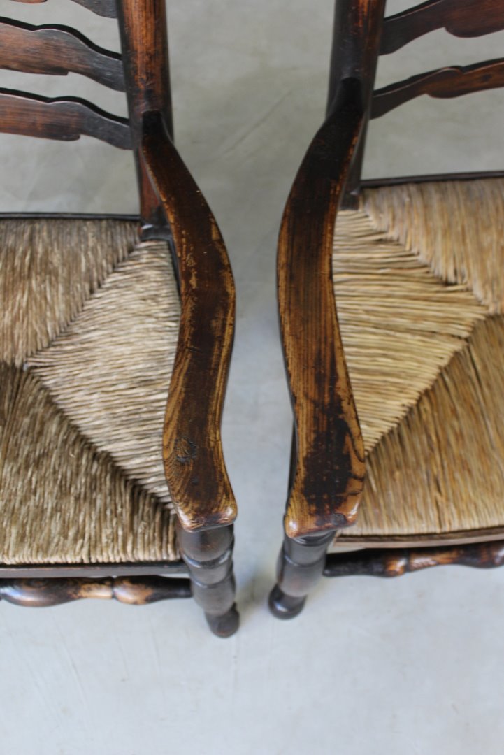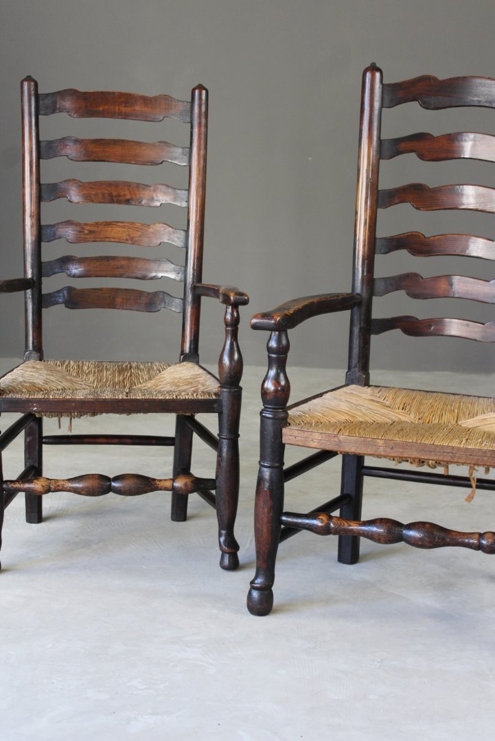 Pair antique elm ladderback carver chairs. Victorian elm ladderback carver chairs with rush seat on turned legs. Find more antique dining chairs here.