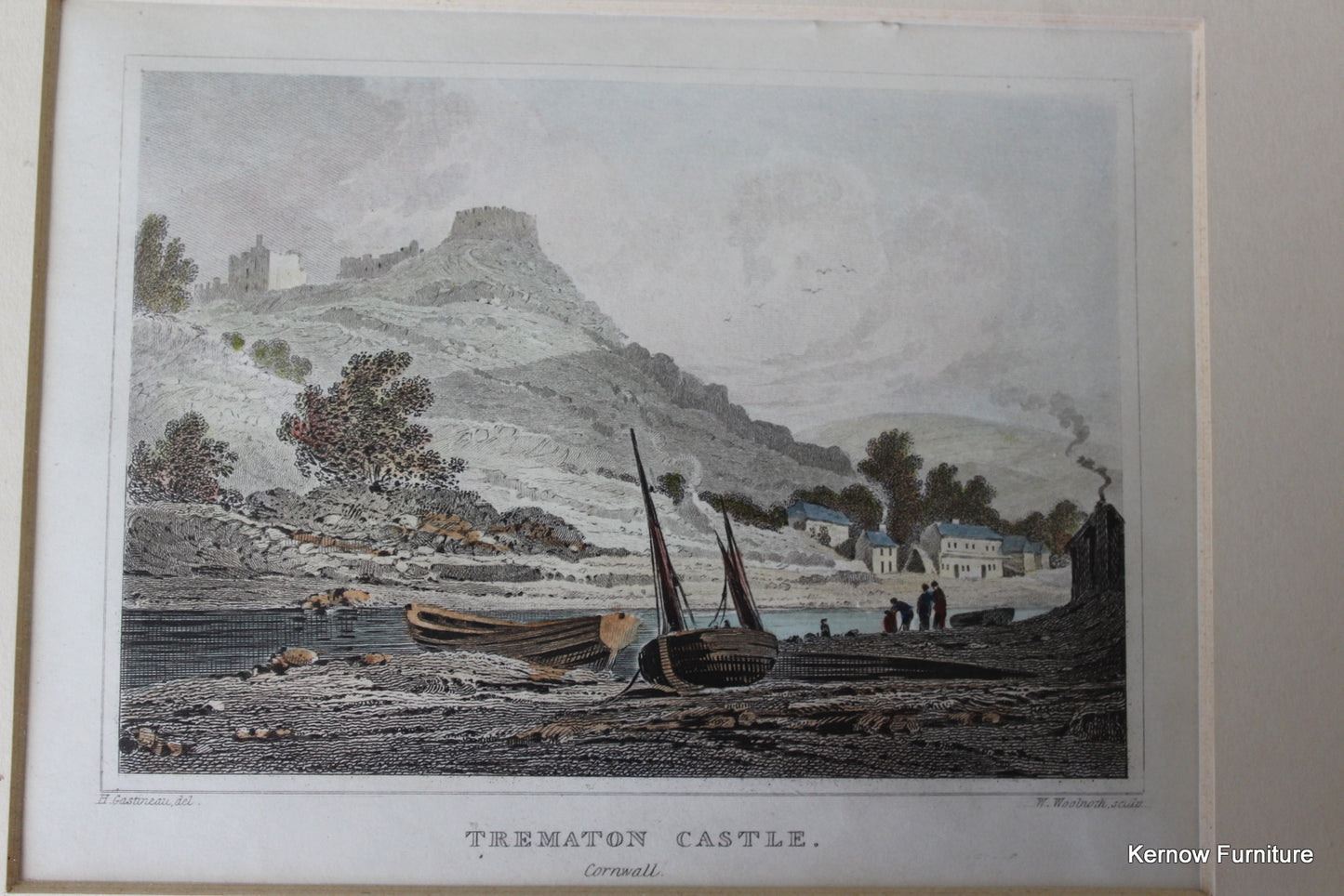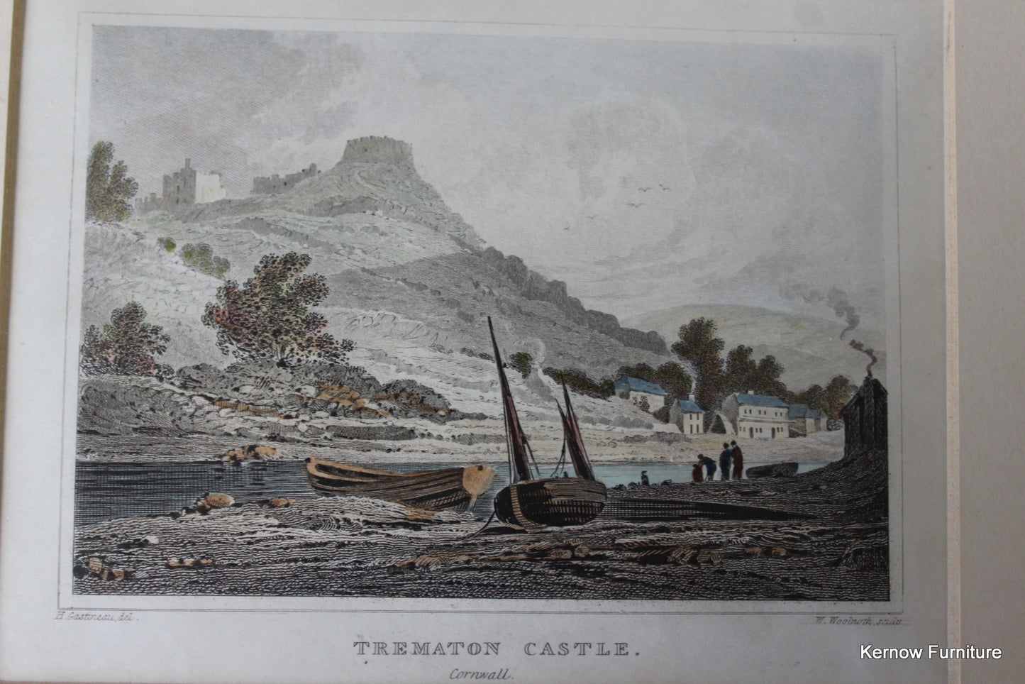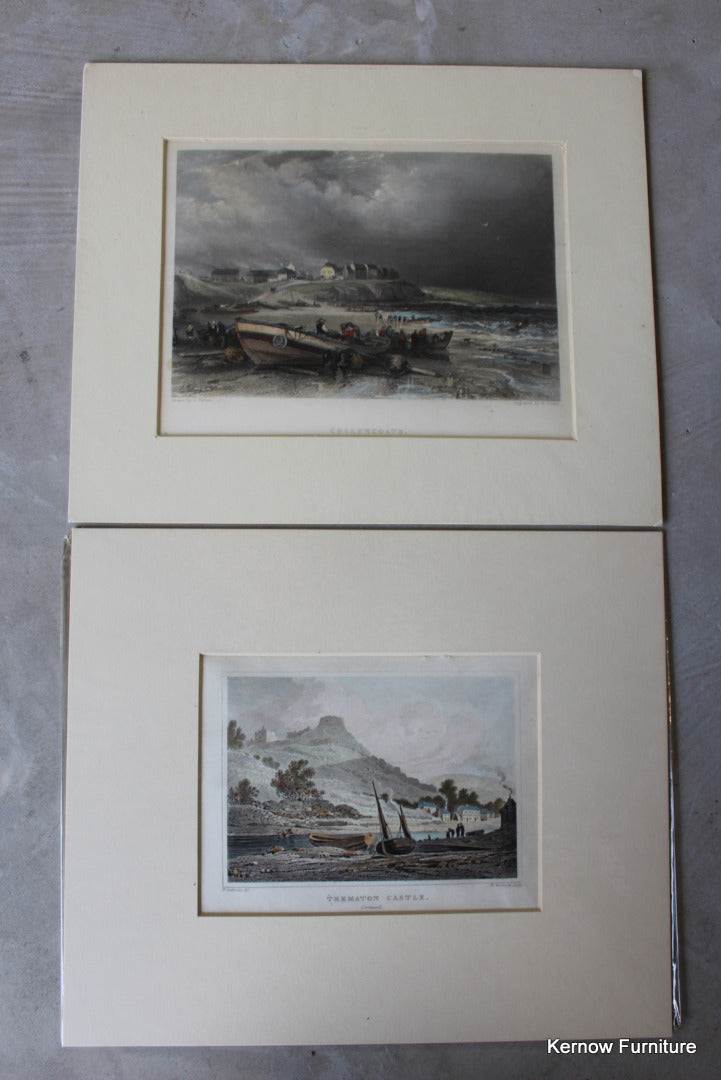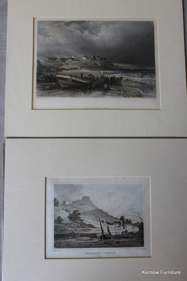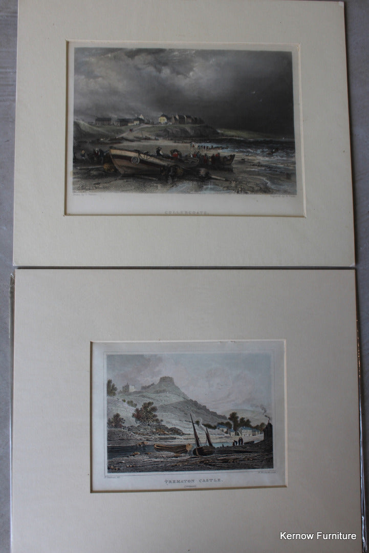 Pair antique engravings. Mounted, not framed, Cullercoats & Trematon castle.