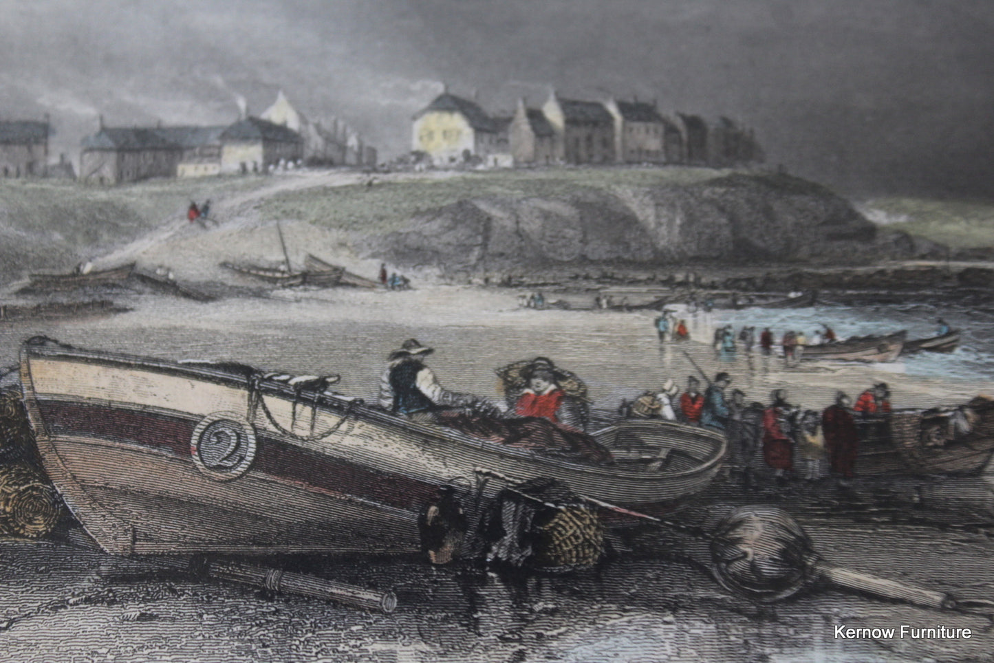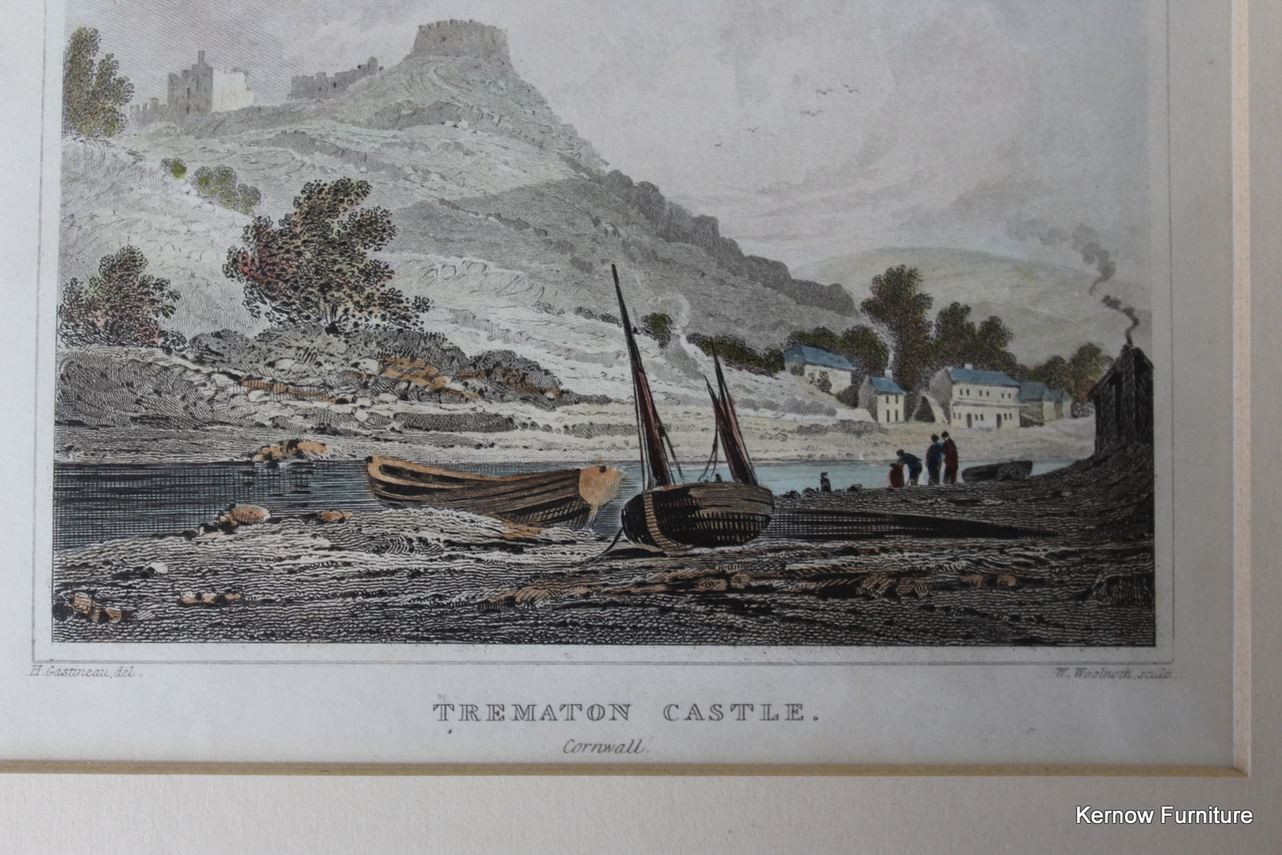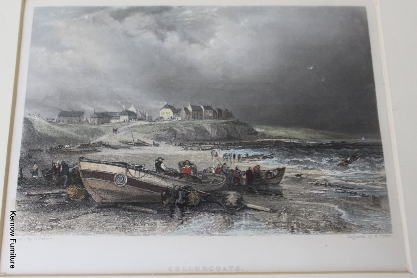 Pair antique engravings. Mounted, not framed, Cullercoats & Trematon castle.