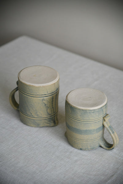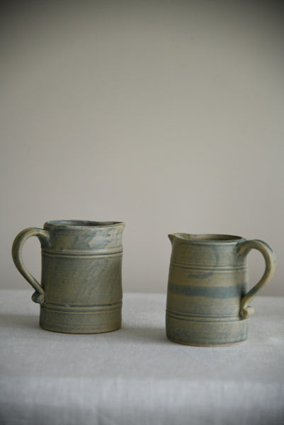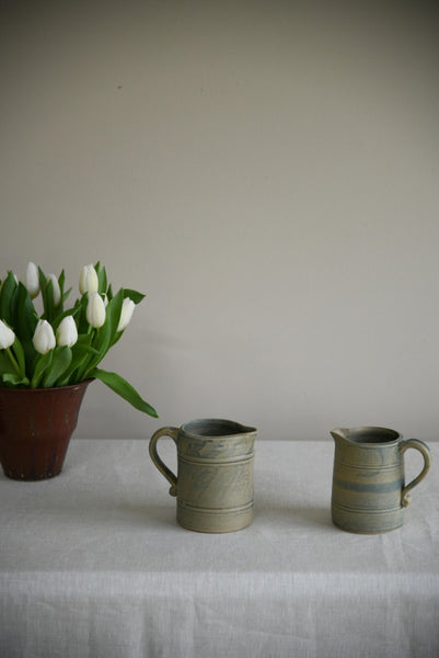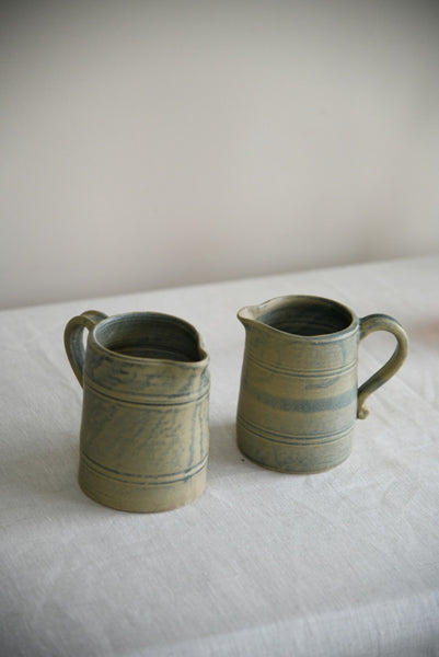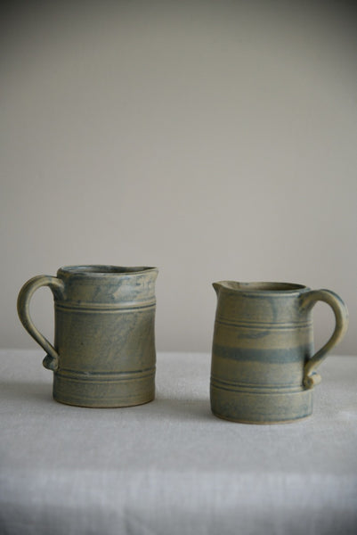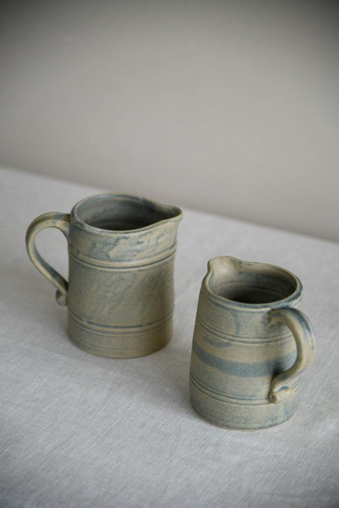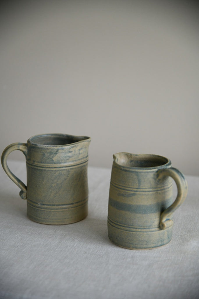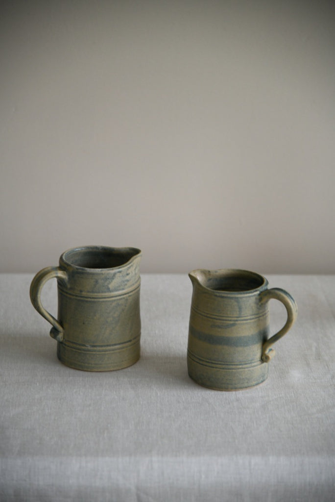 Pair Pottery Jugs. Pair vintage green / blue milk jugs.