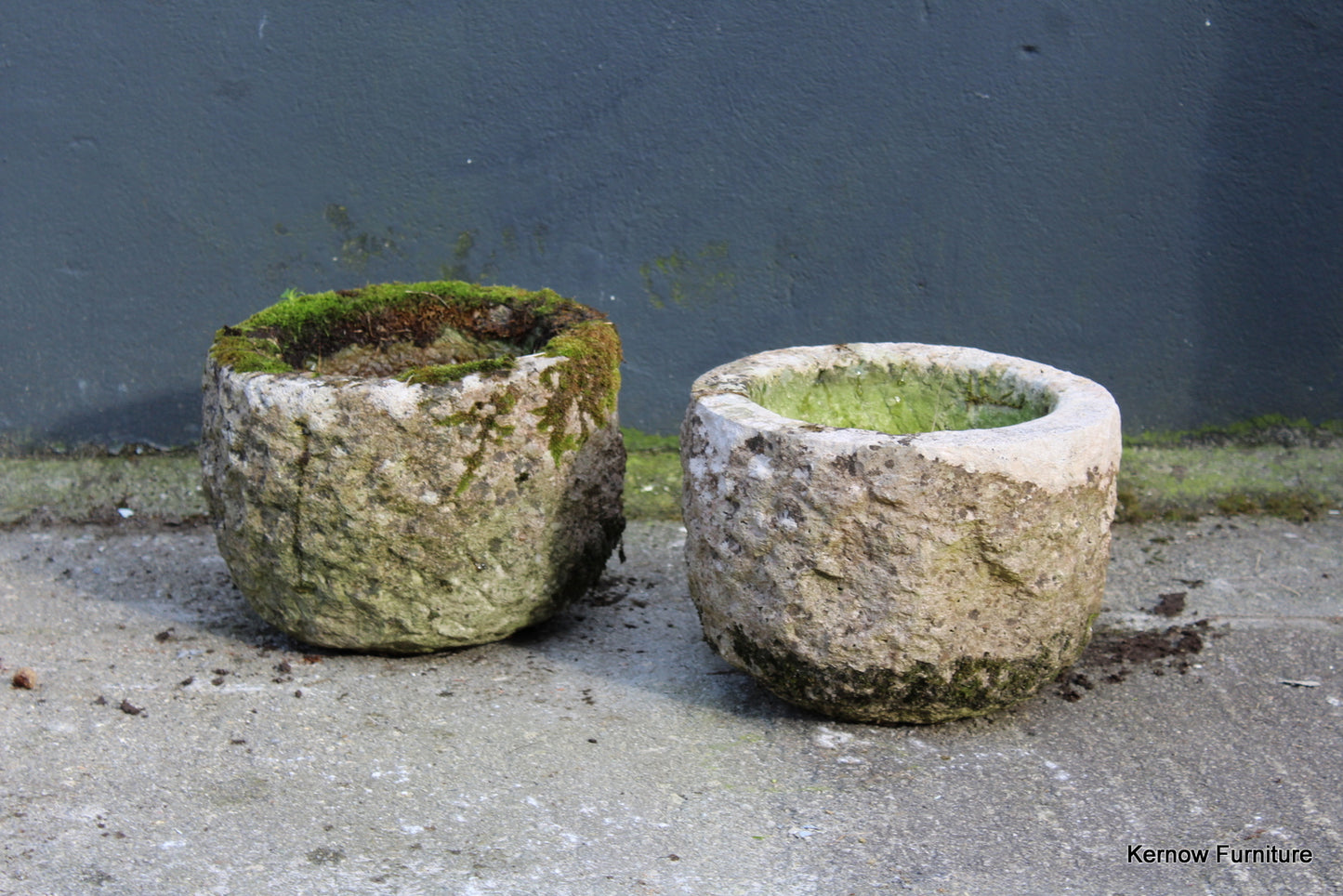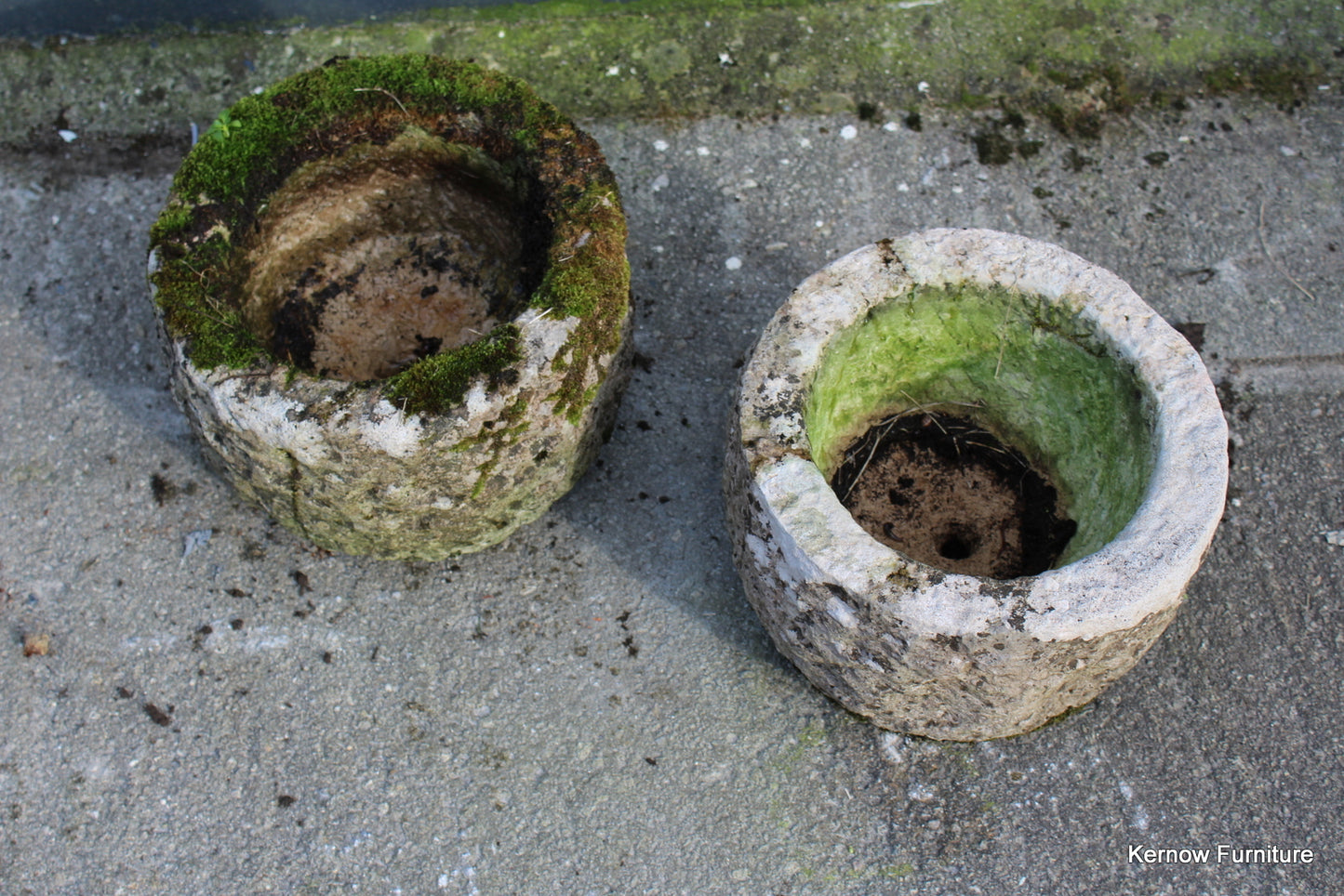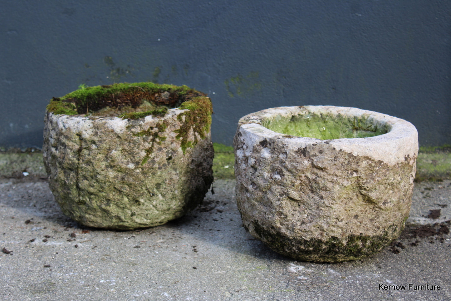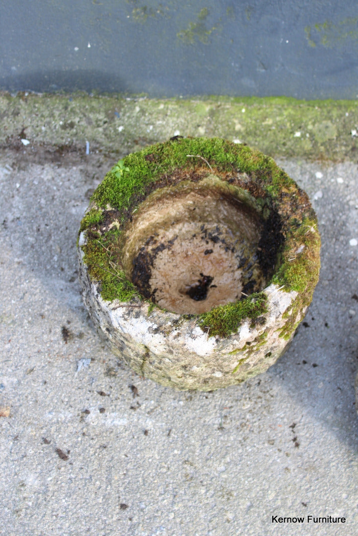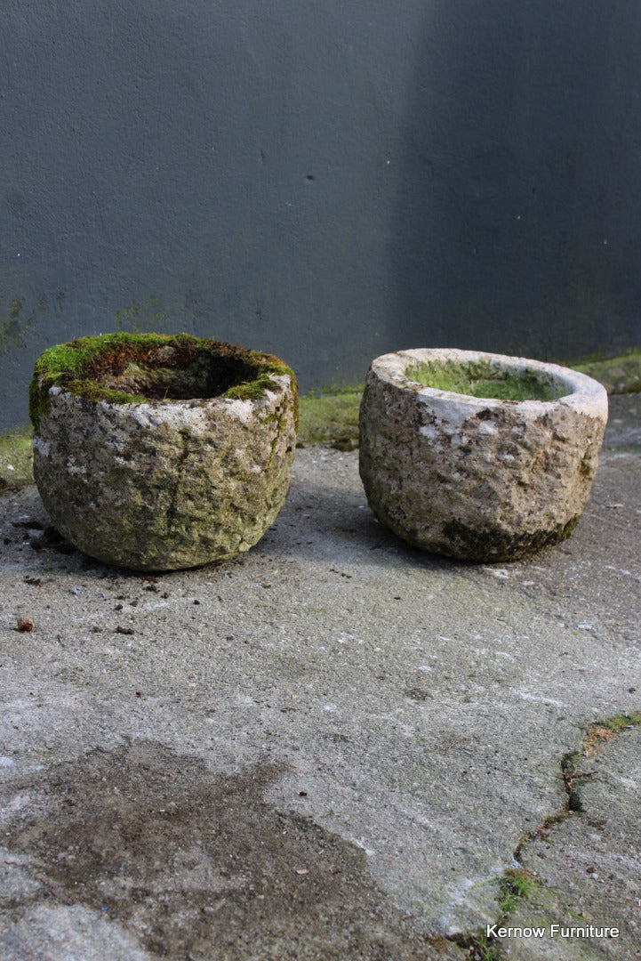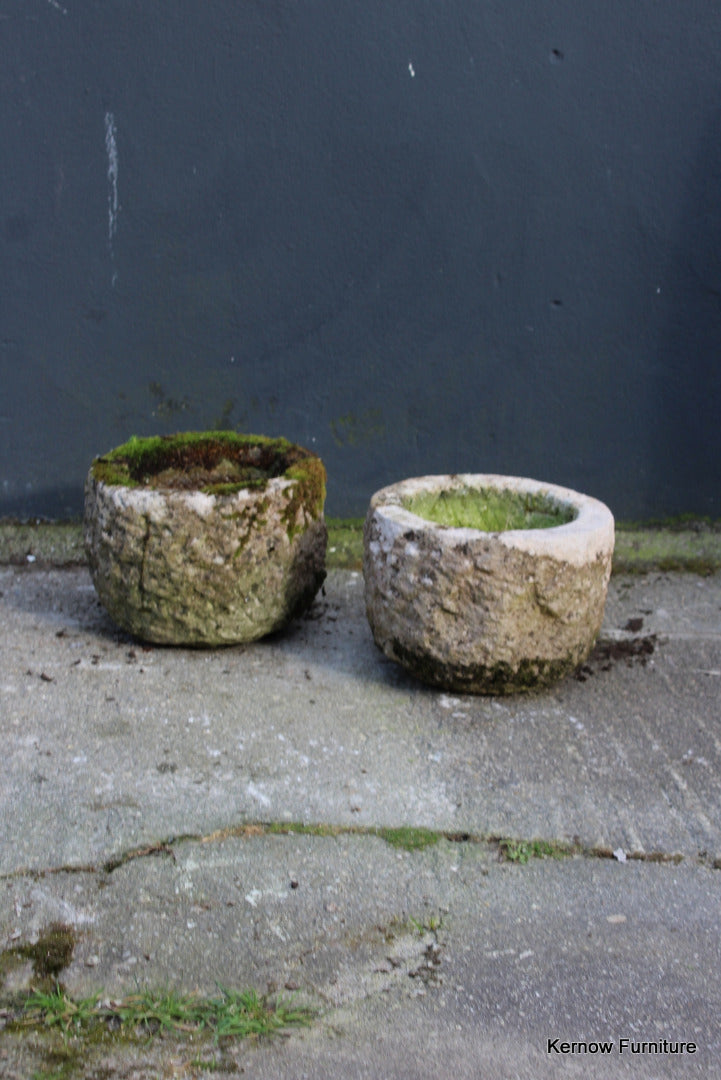 Pair reconstituted stone planters. Late 20th Century pair small planters with drain hole.