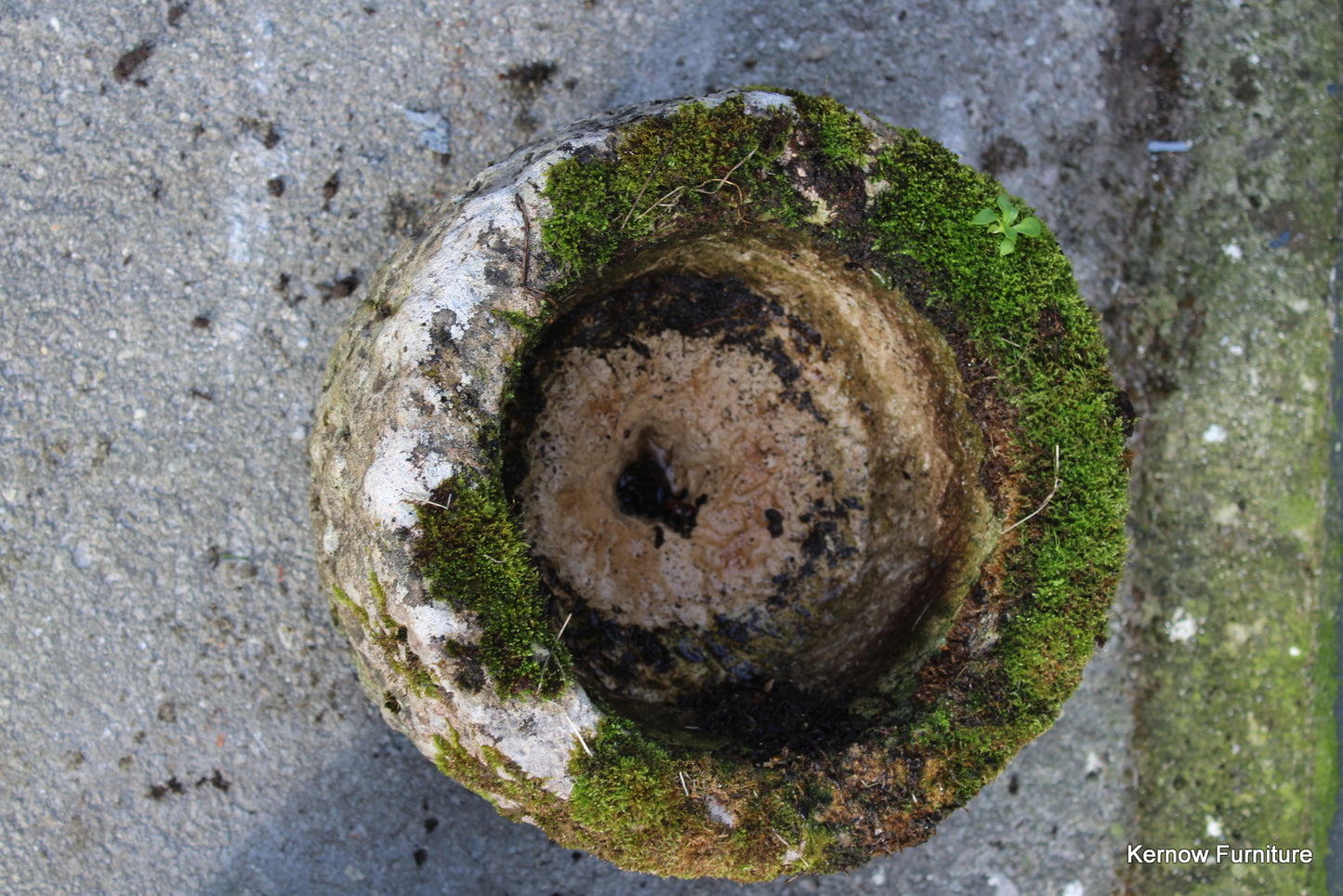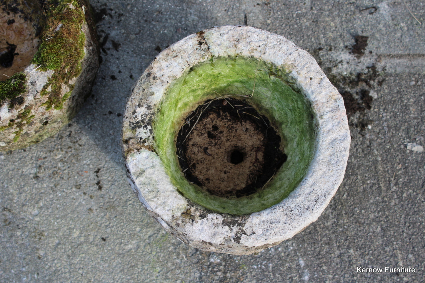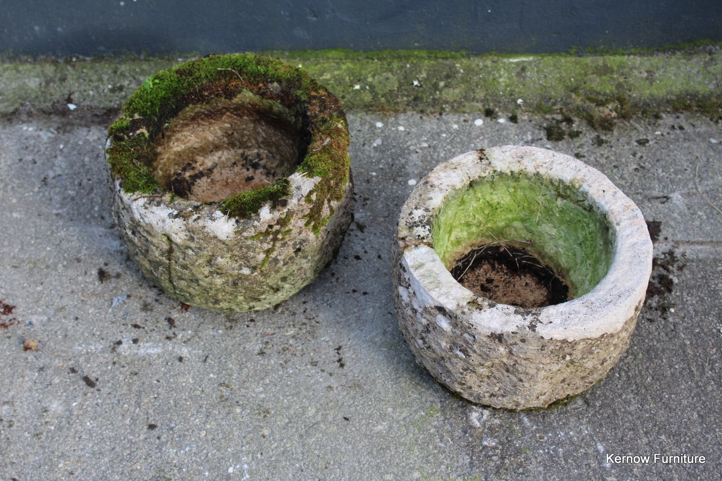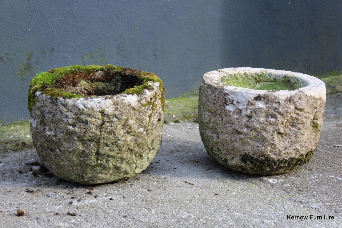 Pair reconstituted stone planters. Late 20th Century pair small planters with drain hole.