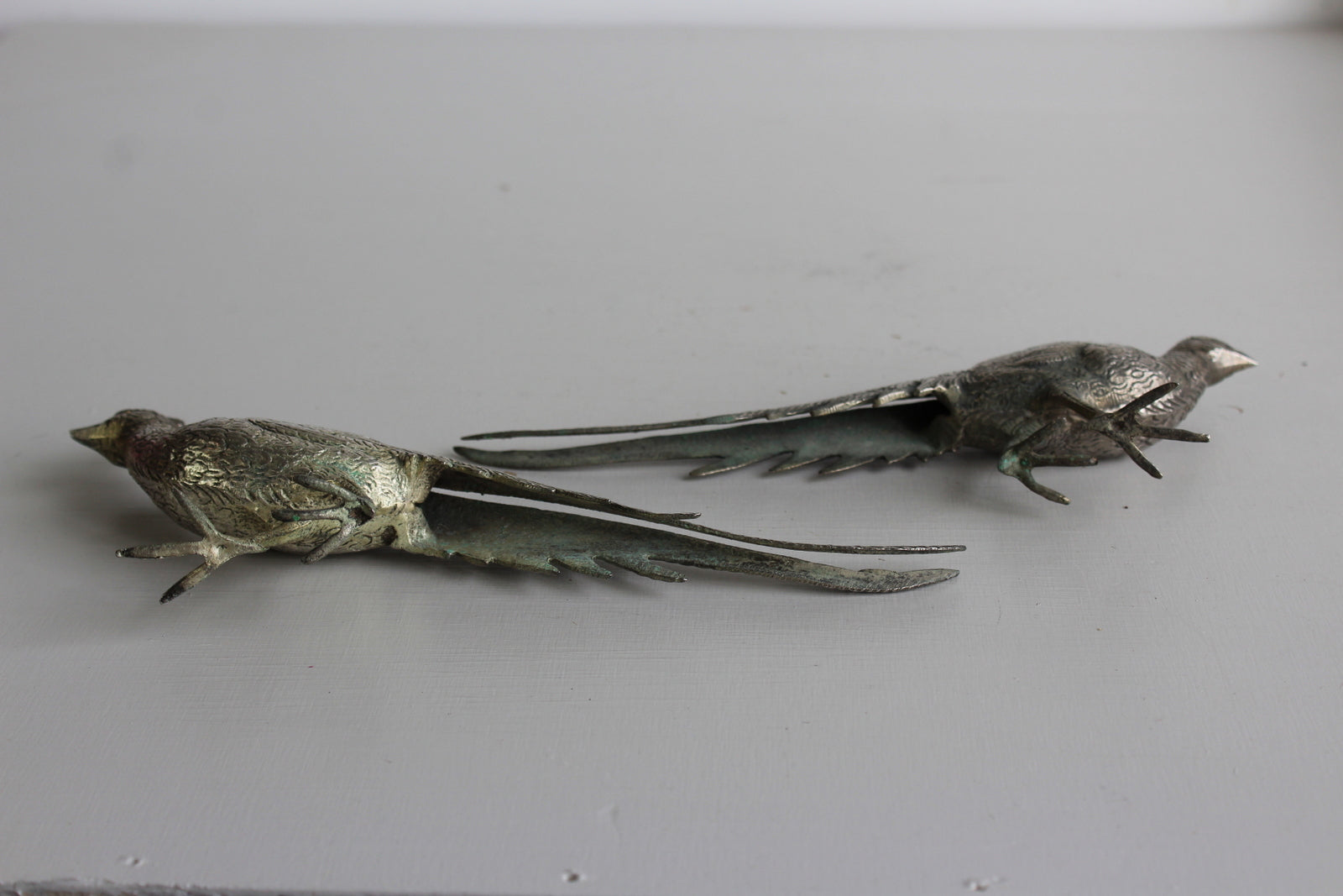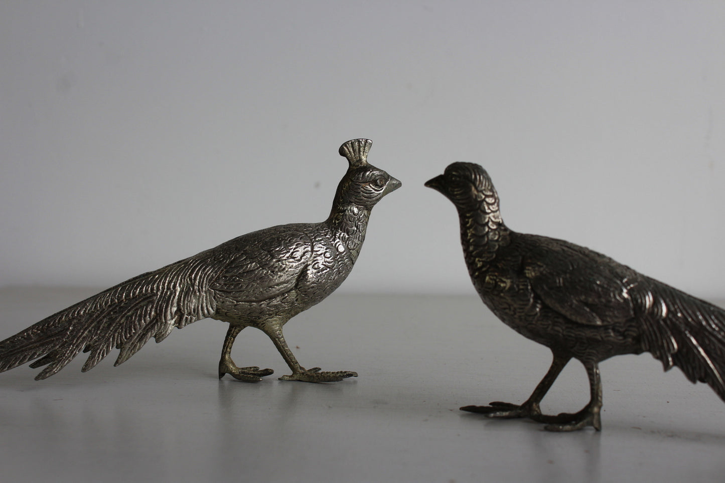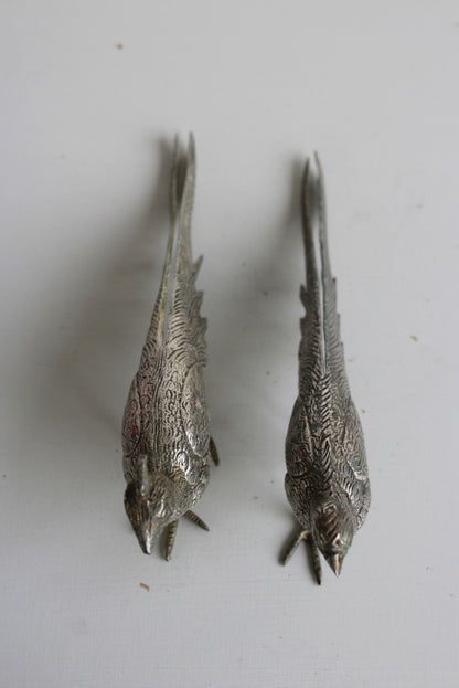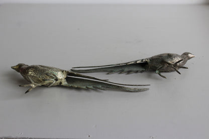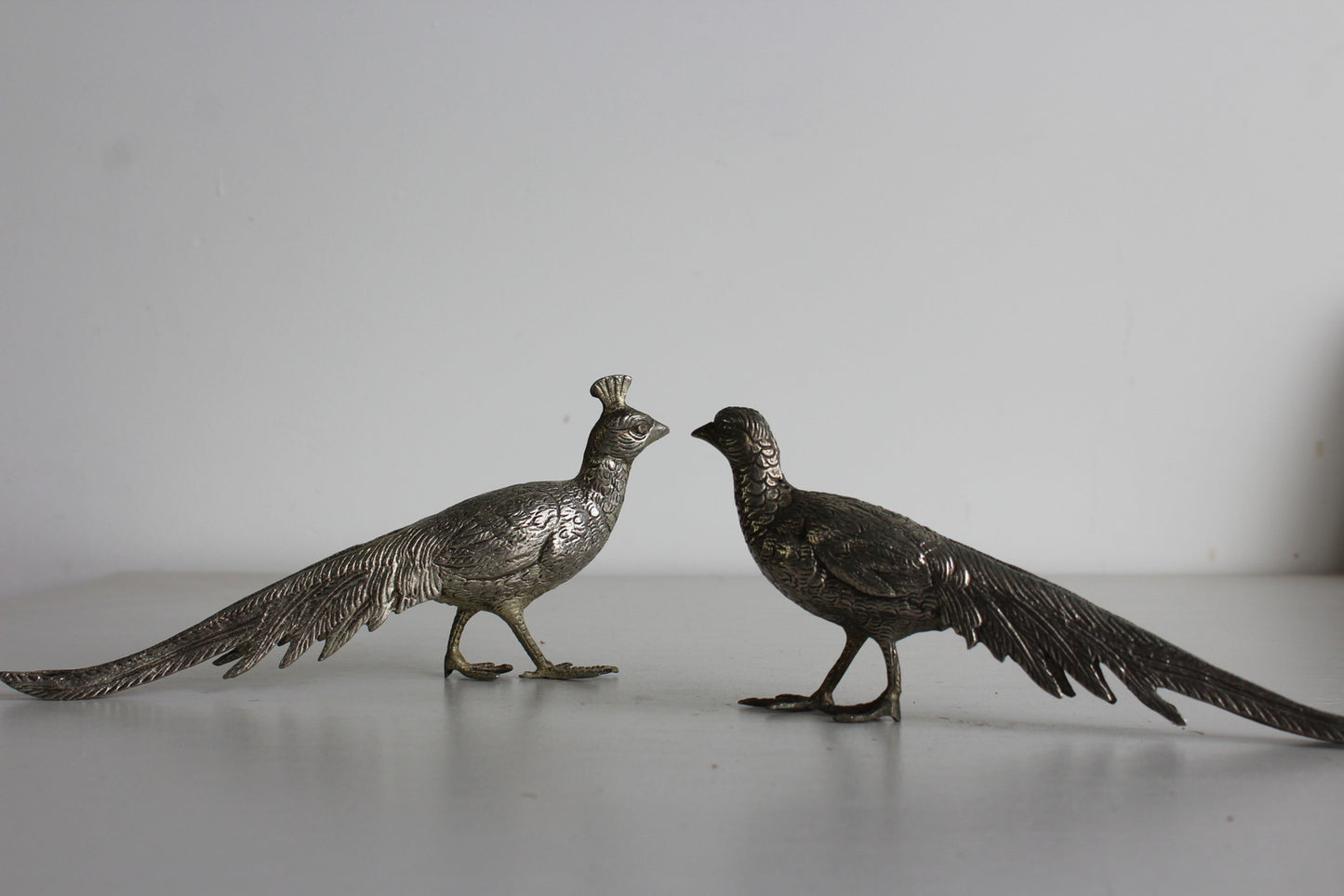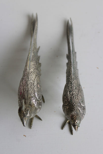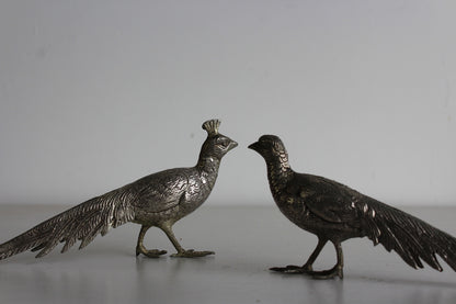 Pair Silver Tone Peacock & Peahen. Decorative silver tone ornaments.